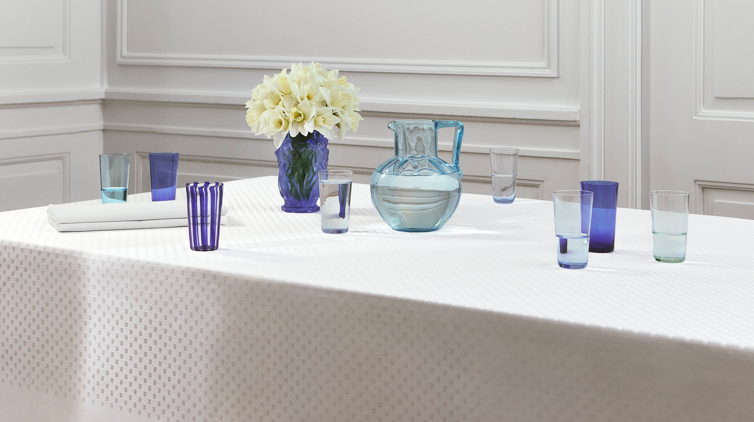 Georg Jensen Damask har alt til borddækningen. Fra damaskvævede duge og servietter i smukke designs til hånddyppede stearinlys i matchende farver.