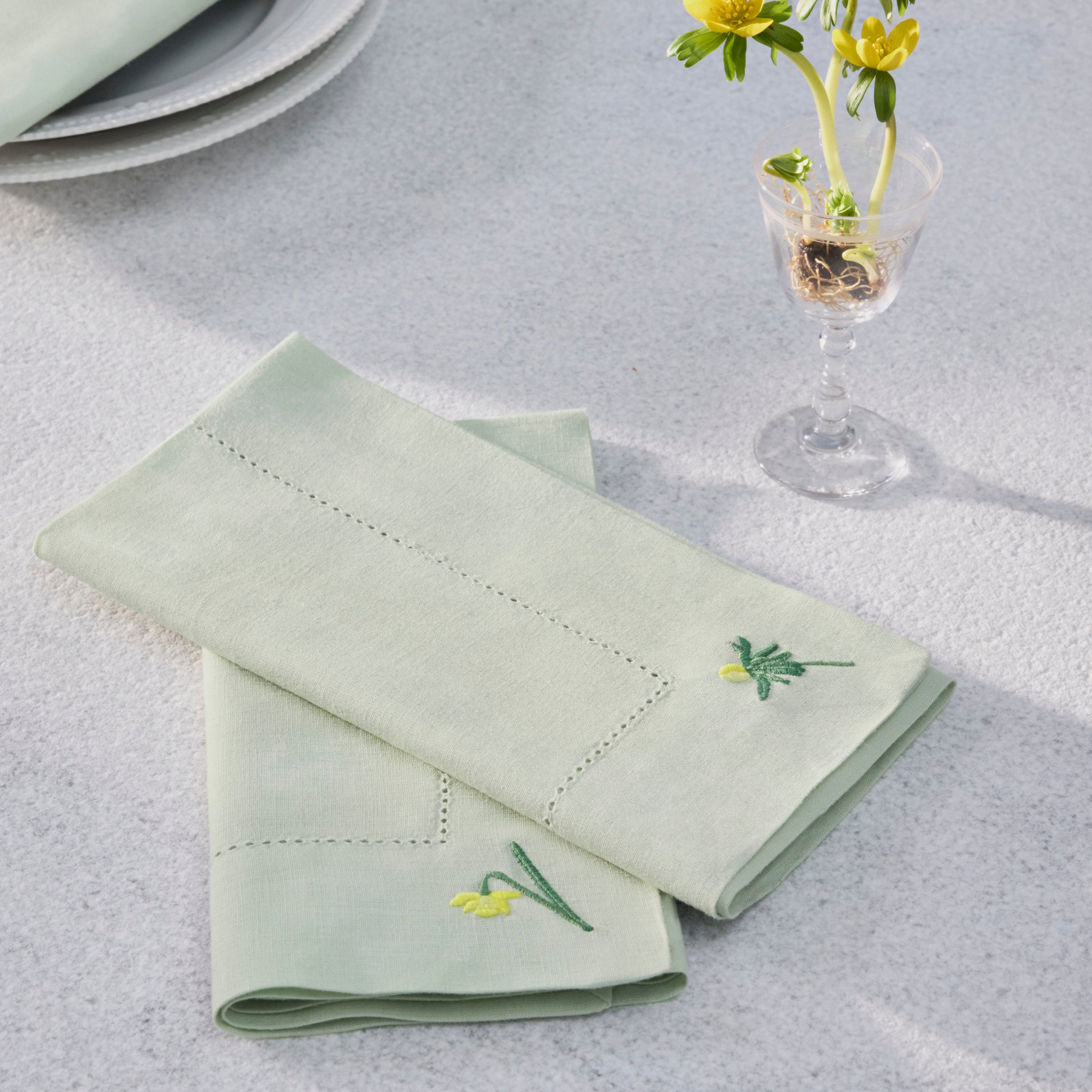 Påskeliljer, erantis og anemoner. De nye Spring servietter er broderet med motiver af forårets første blomster. Lige nu får du 2 stk. til lanceringspris.