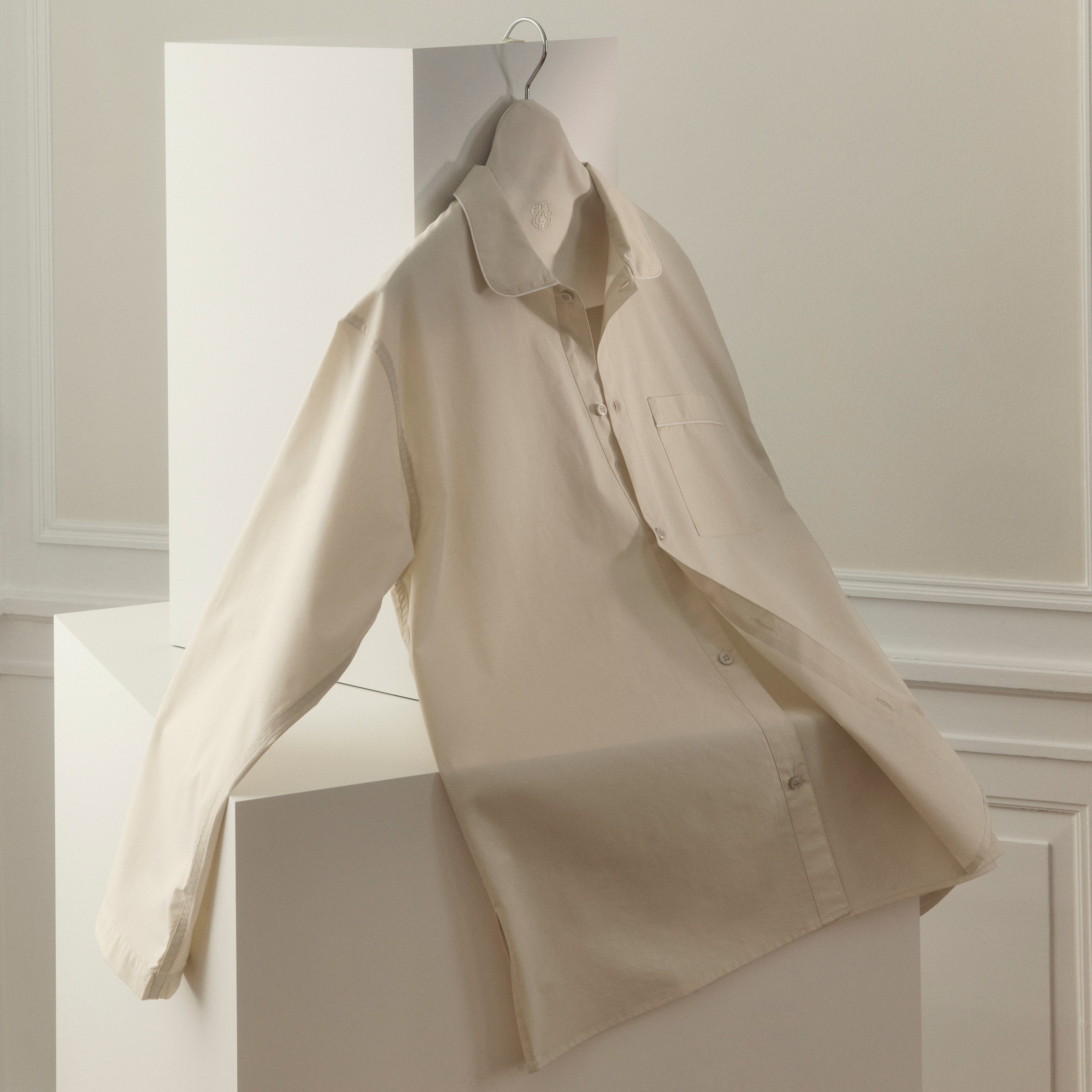 Percalevævet pyjamas med klassisk snit og elegante detaljer, som sideslidser, brystlomme, afrundet krave og hvide pipings.