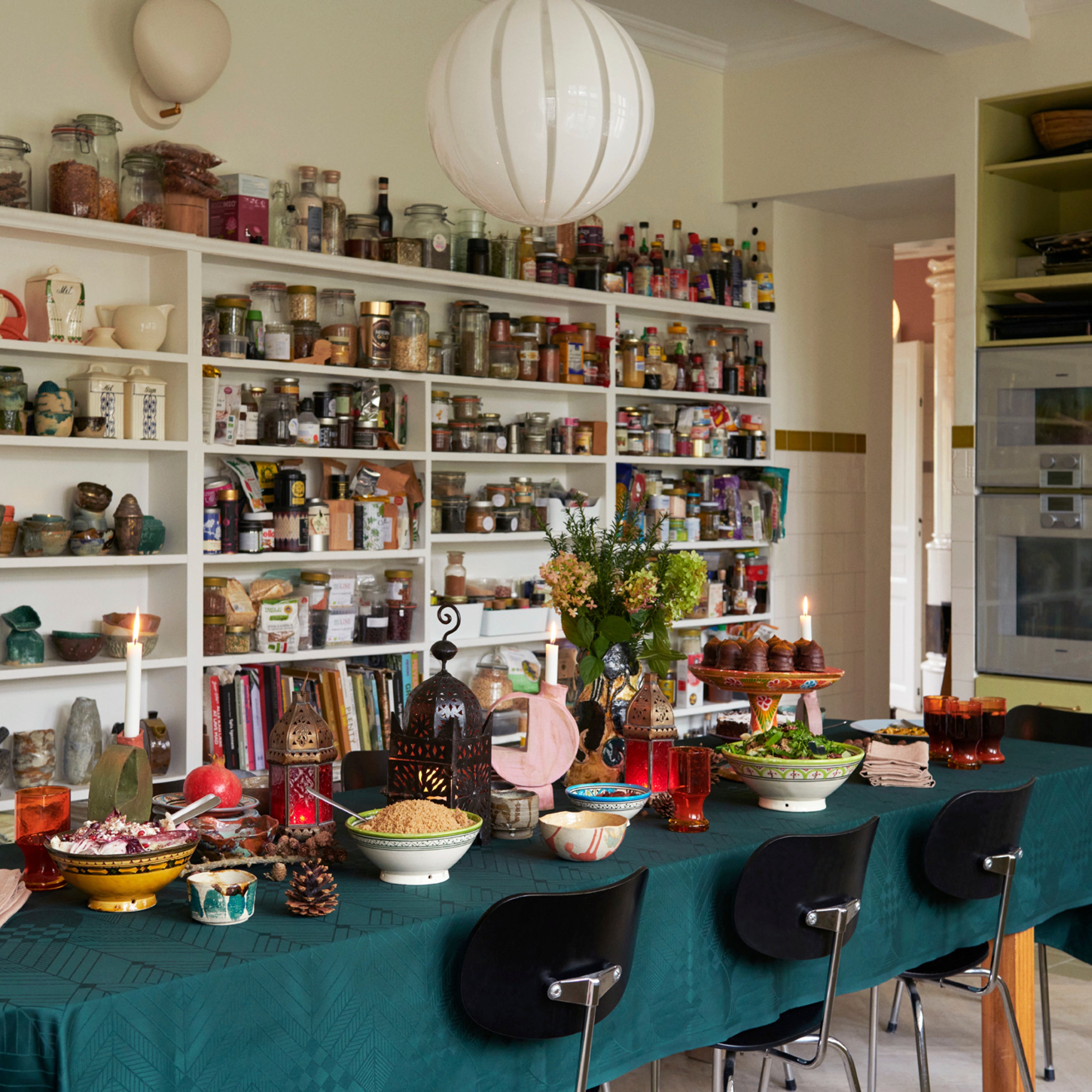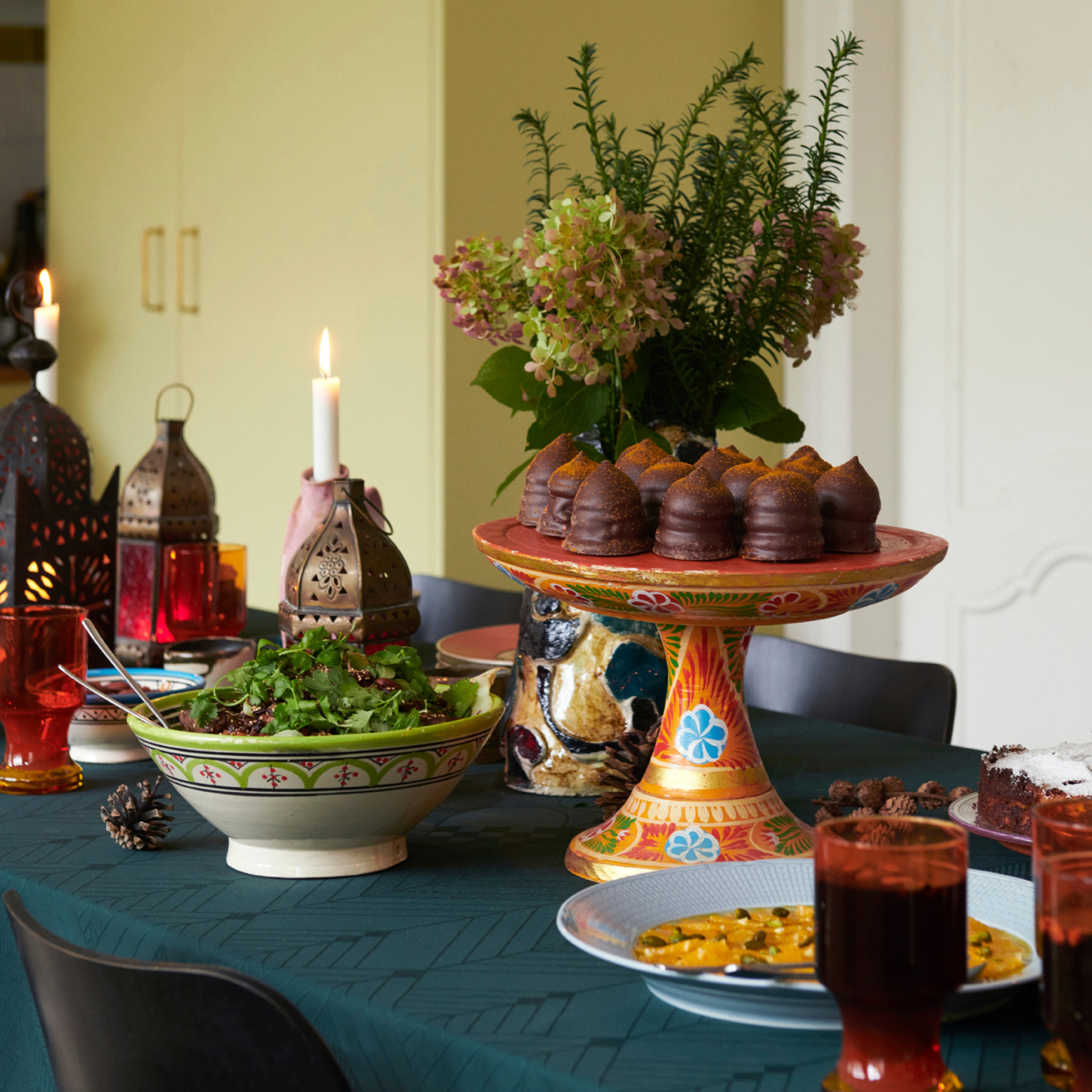 Christina Meyer Bengtsson: I mens står jeg for bordopdækningen. Den er en kombination af en mellemøstlig stil og dansk jul. Det skal være mangfoldigt og farverigt med gammelt porcelæn og noget keramik, jeg selv har lavet. Jeg elsker at finde gammel julepynt på loppemarkeder. Nisser, små dannebrogsflag og sjove ting. Jeg kan godt lide at blive nostalgisk og maxe ud med julepynten. Vi laver også altid et nisselandskab inde i spisestuen.