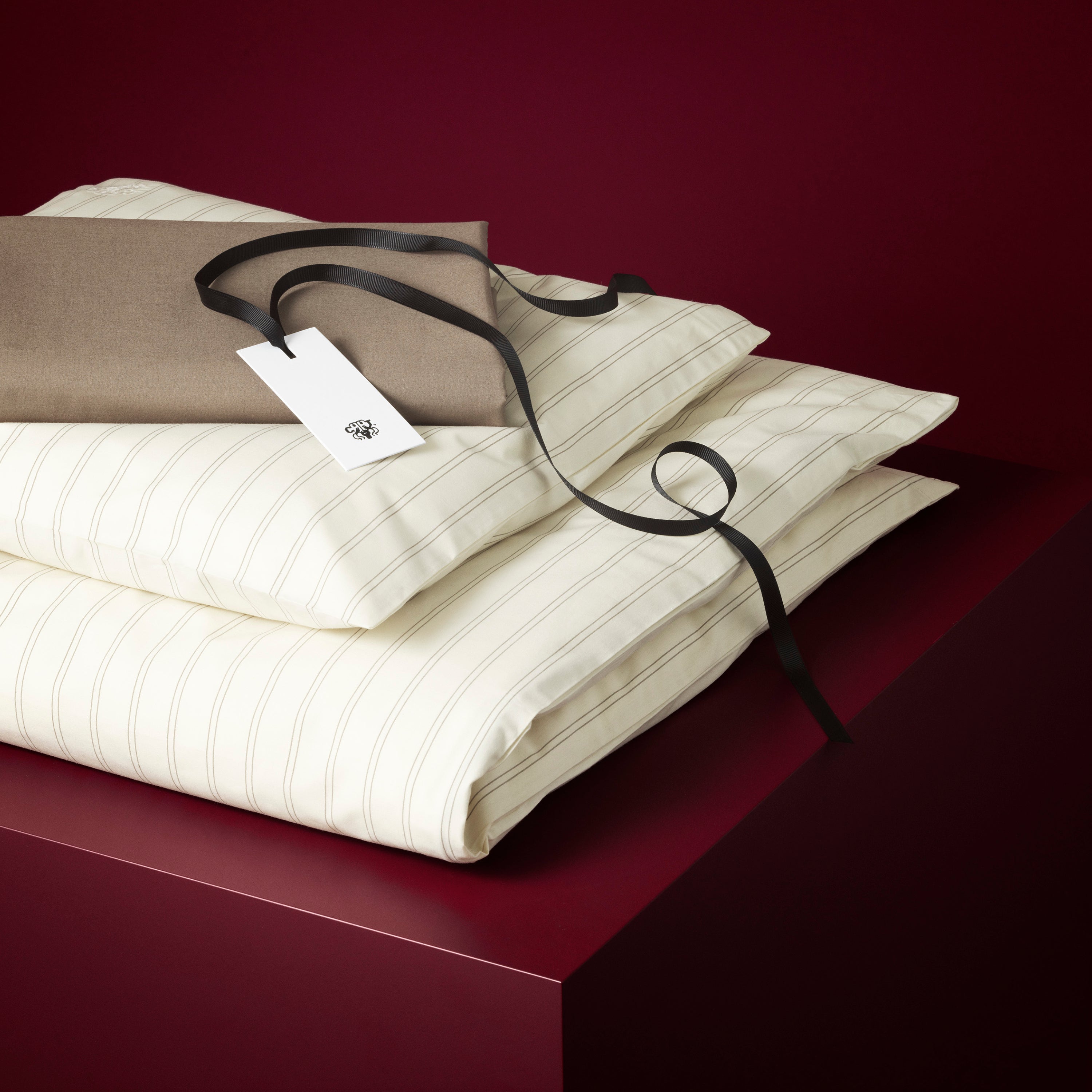 Gavepakken med elegant sengetøj til børn. Supima Pinstripe i farven Archive Linen og et lagen i farven Walnut. Sengetøjet har slanke nålestriber i farven Walnut, der matcher lagnet i samme smukke farve.