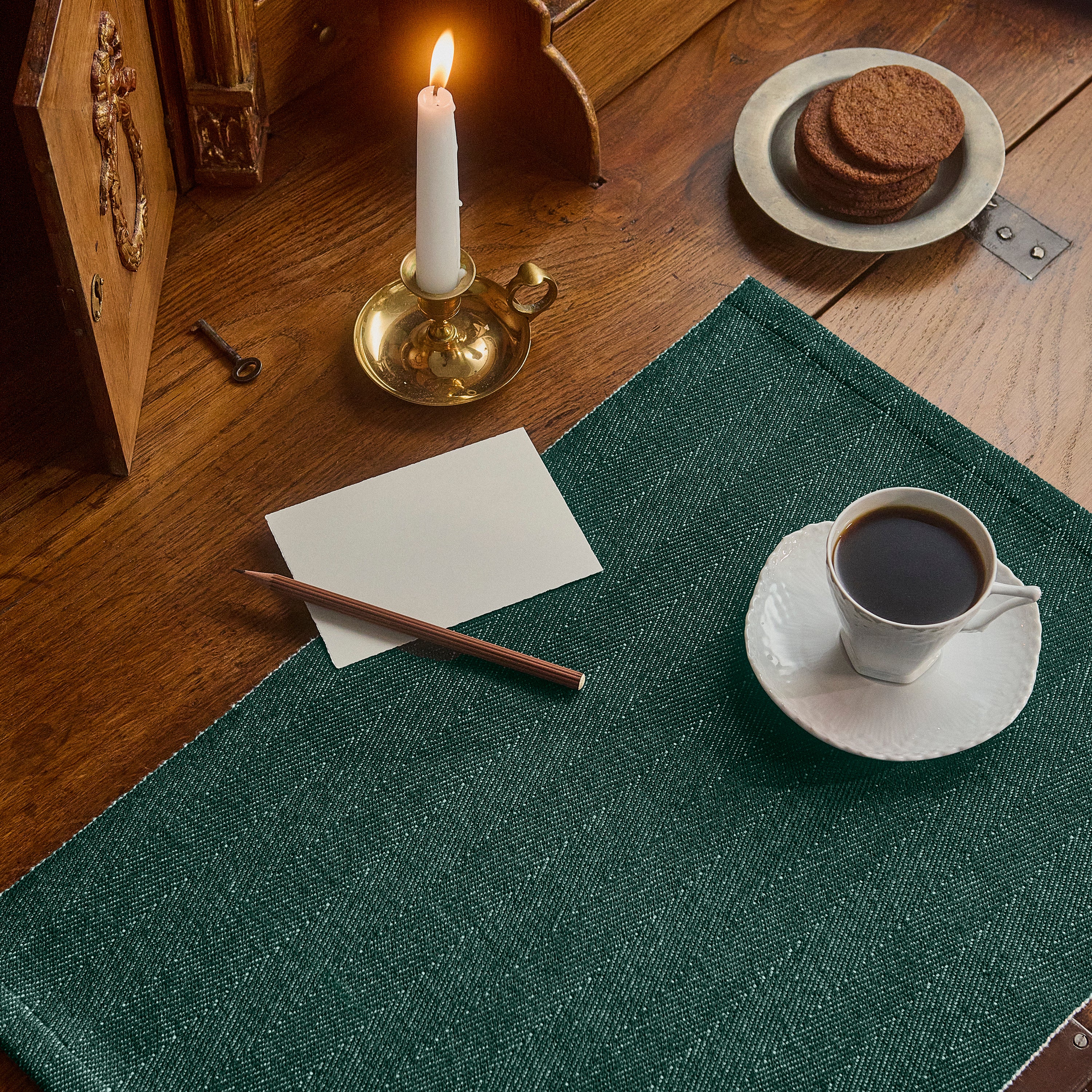Sildebensvævede dækkeservietter i 100 % bomuld. Vævemetoden giver det karakteristiske sildebensmønster og de kraftige garner får dækkeservietterne til at ligge tungt på bordet.