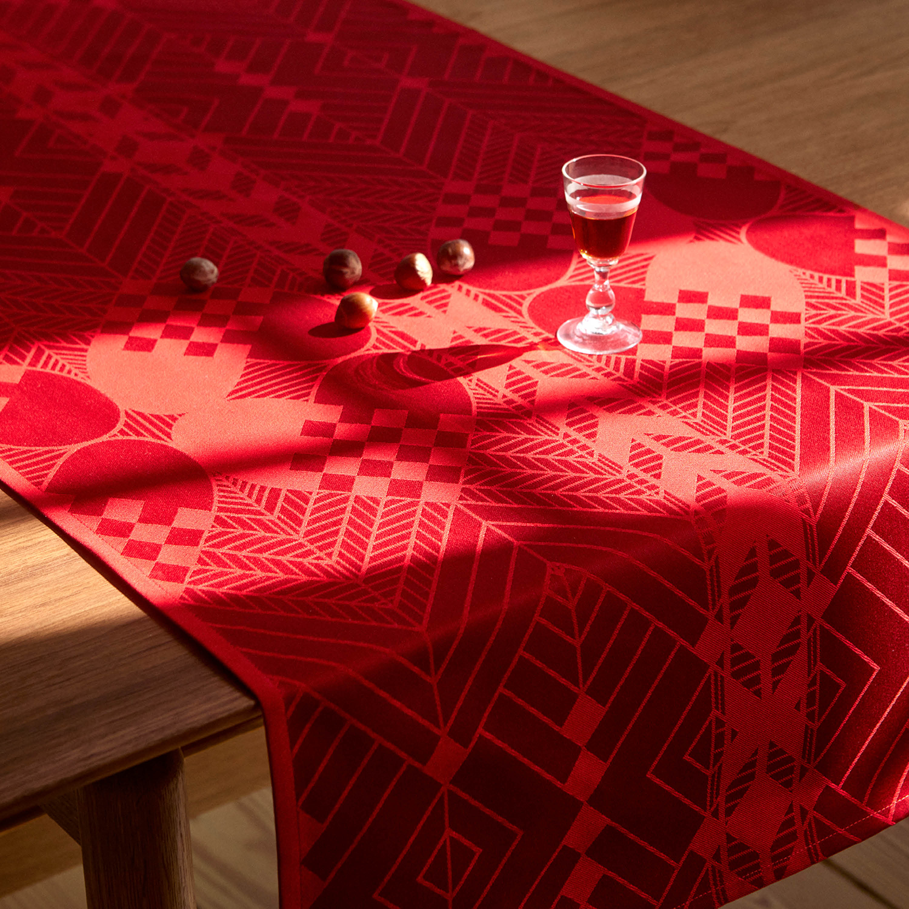 Christmasbordløberens stemningsfyldte juledesign med fine, flettede julehjerter og stiliserede grankviste blev skabt af tekstilkunstner Bodil Bødtker-Næss i 1975 og er blevet et signaturdesign i Georg Jensen Damasks kollektion.