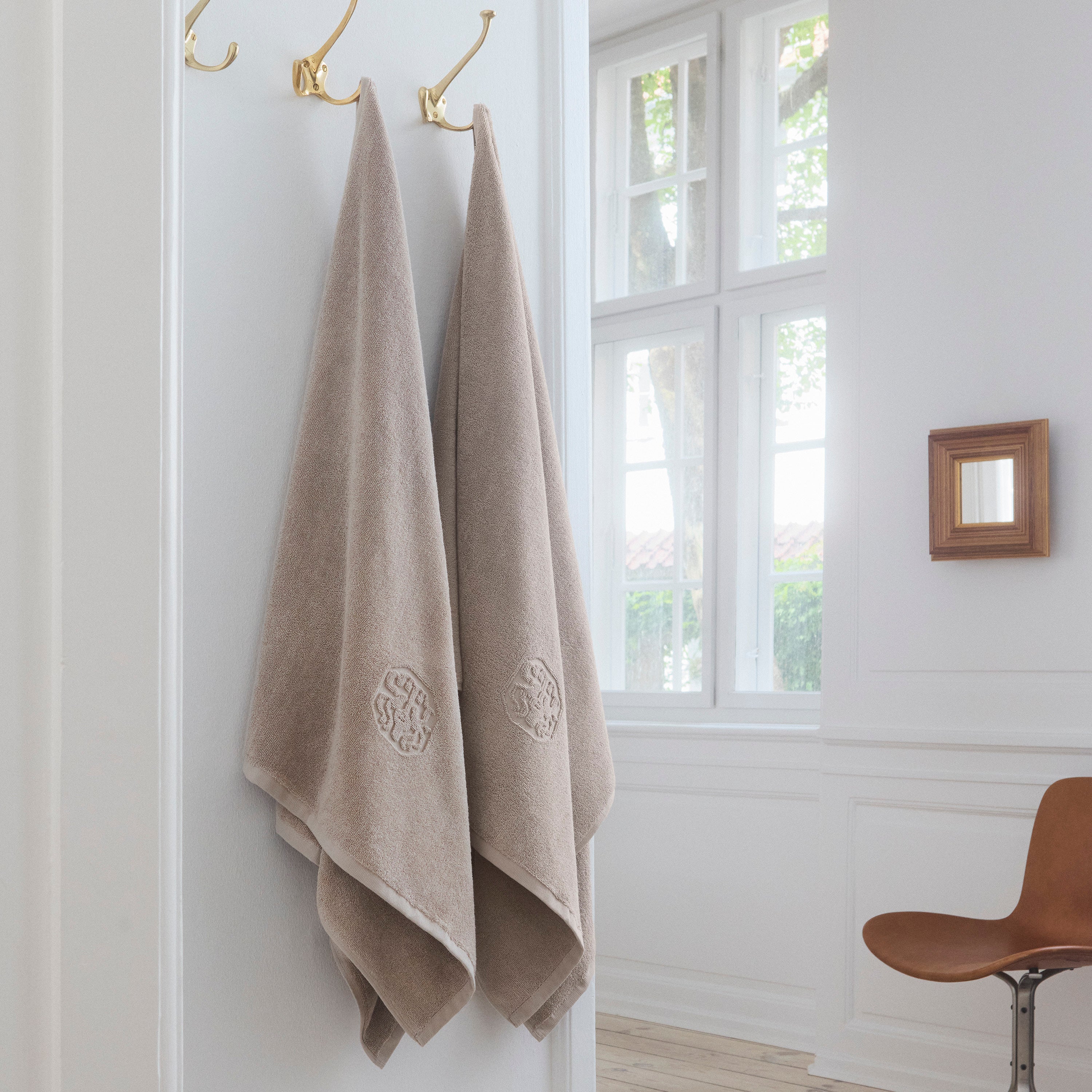 Damask Terry håndklæder vævet i 100 % bomuld. Damask Terry har et helt enkelt udtryk med Georg Jensen Damasks ikoniske logo indvævet som elegant detalje. Farven Cashmere er en diskret brun nuance af grå.