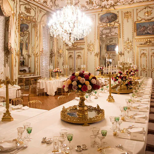 Billede 7: Nytårstaffel. Dugen er designet af Dronningen specielt til det årlige nytårstaffel på Christian VIIs palæ. Foto: Kongehuset