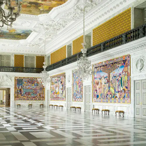 Billede 8: : Riddersalen på Christiansborg med Bjørn Nørgaards gobeliner og Georg Jensen Damasks tapet og møbeltekstil. Foto: Kongehuset