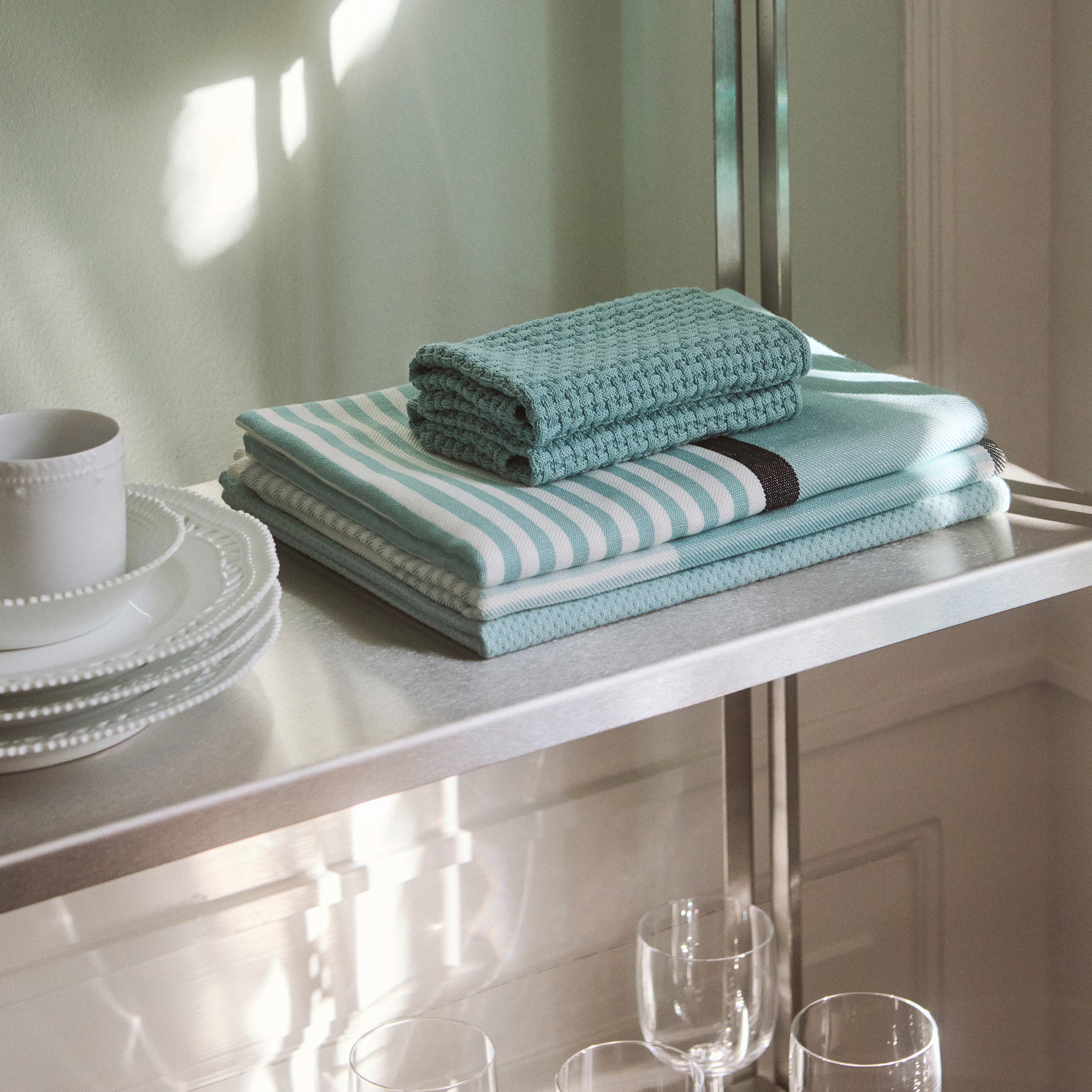 Det stribede Abild viskestykke er en klassiker i Georg Jensen Damasks kollektion. Abild er designet af væver og tekstilingeniør Bent Georg Jensen, som forener kvalitet, funktion og design på elegant vis. Viskestykket er vævet i en kombination af 50 % hør og 50 % bomuld, der giver det optimale tørreegenskaber. Den klare, blågrønne farve, Deep Glass, er inspireret af farven på råglas.
