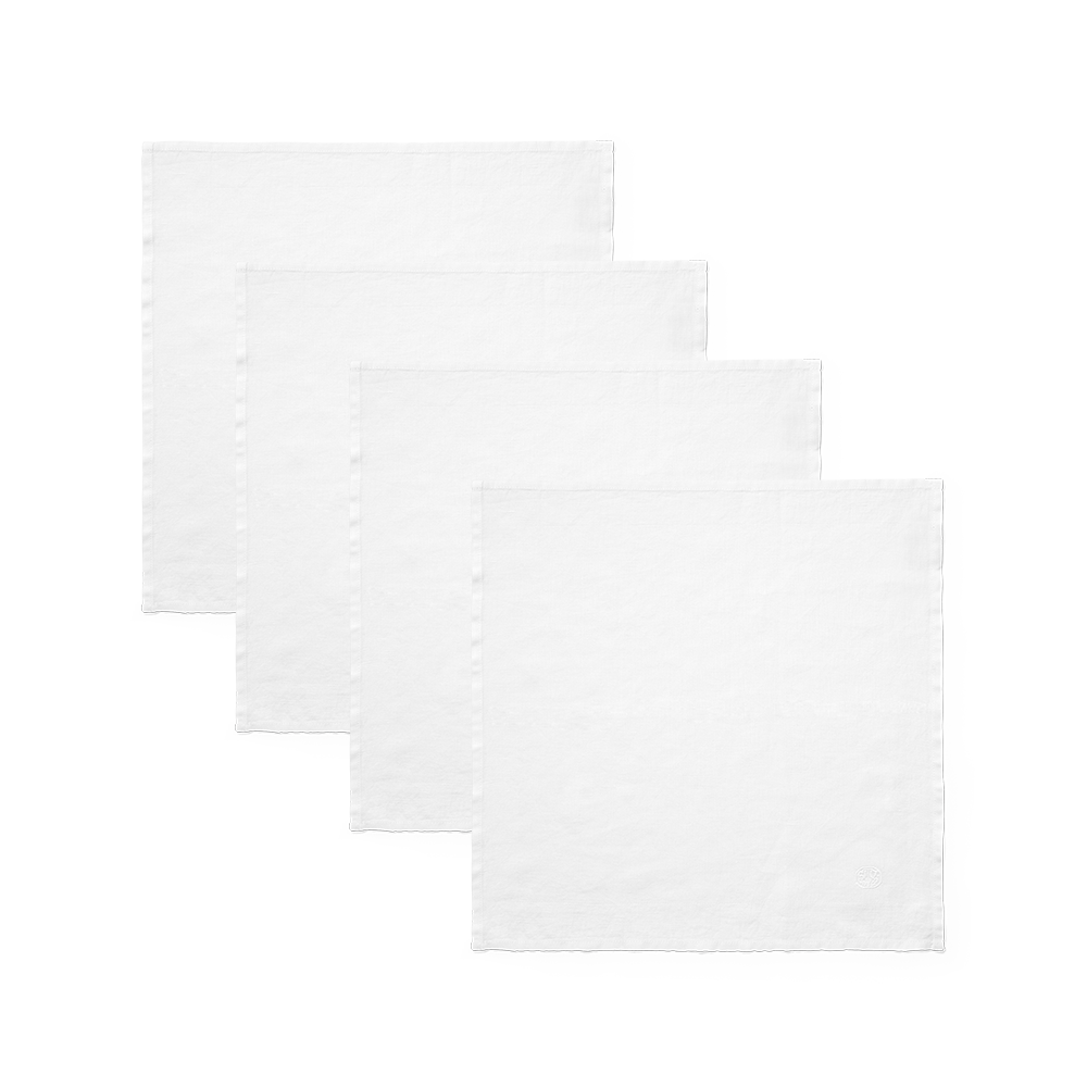Klassiske, hvide Plain servietter med sin karakteristiske, indvævede kant og et broderet logo. De bløde servietter er twillvævet i 100% hør.