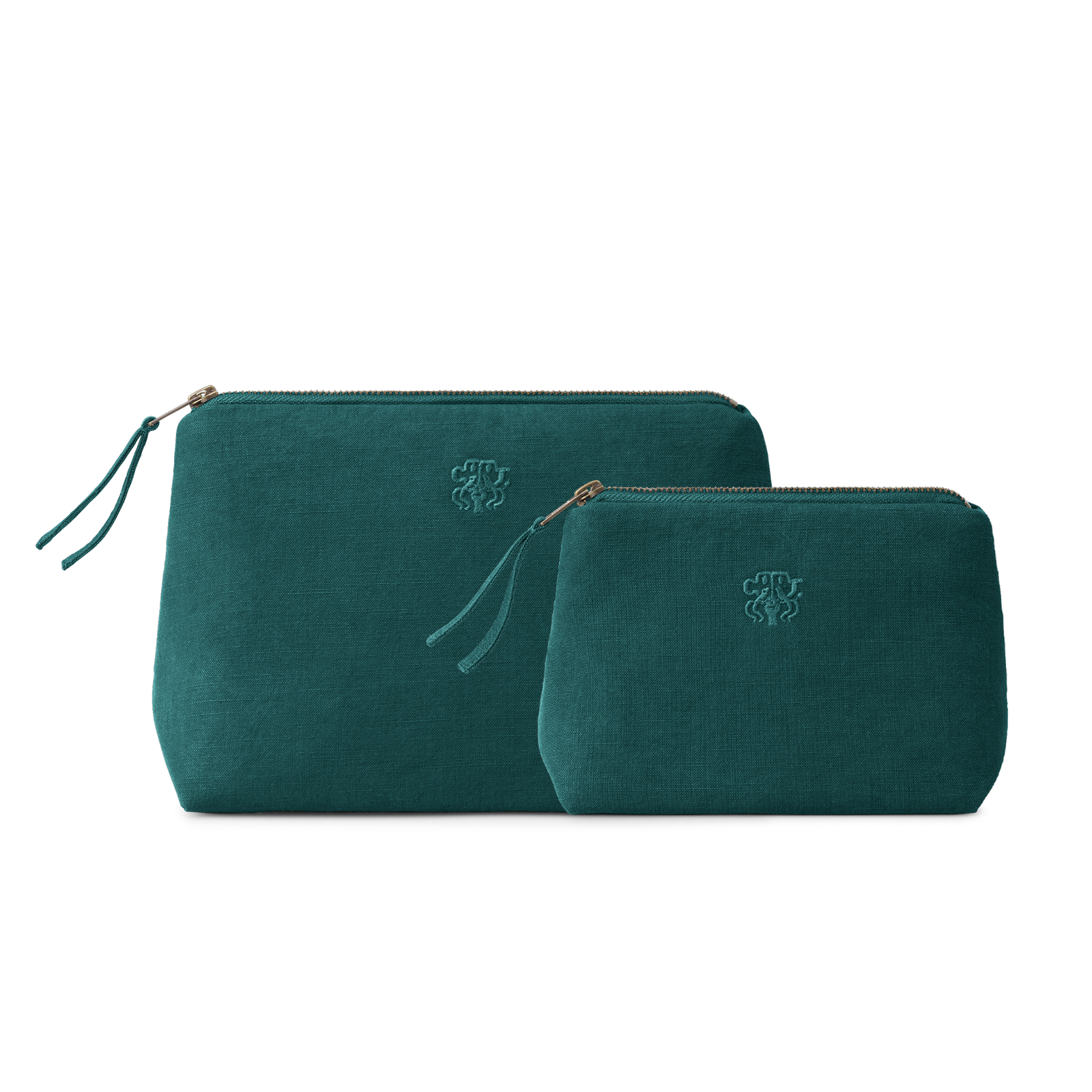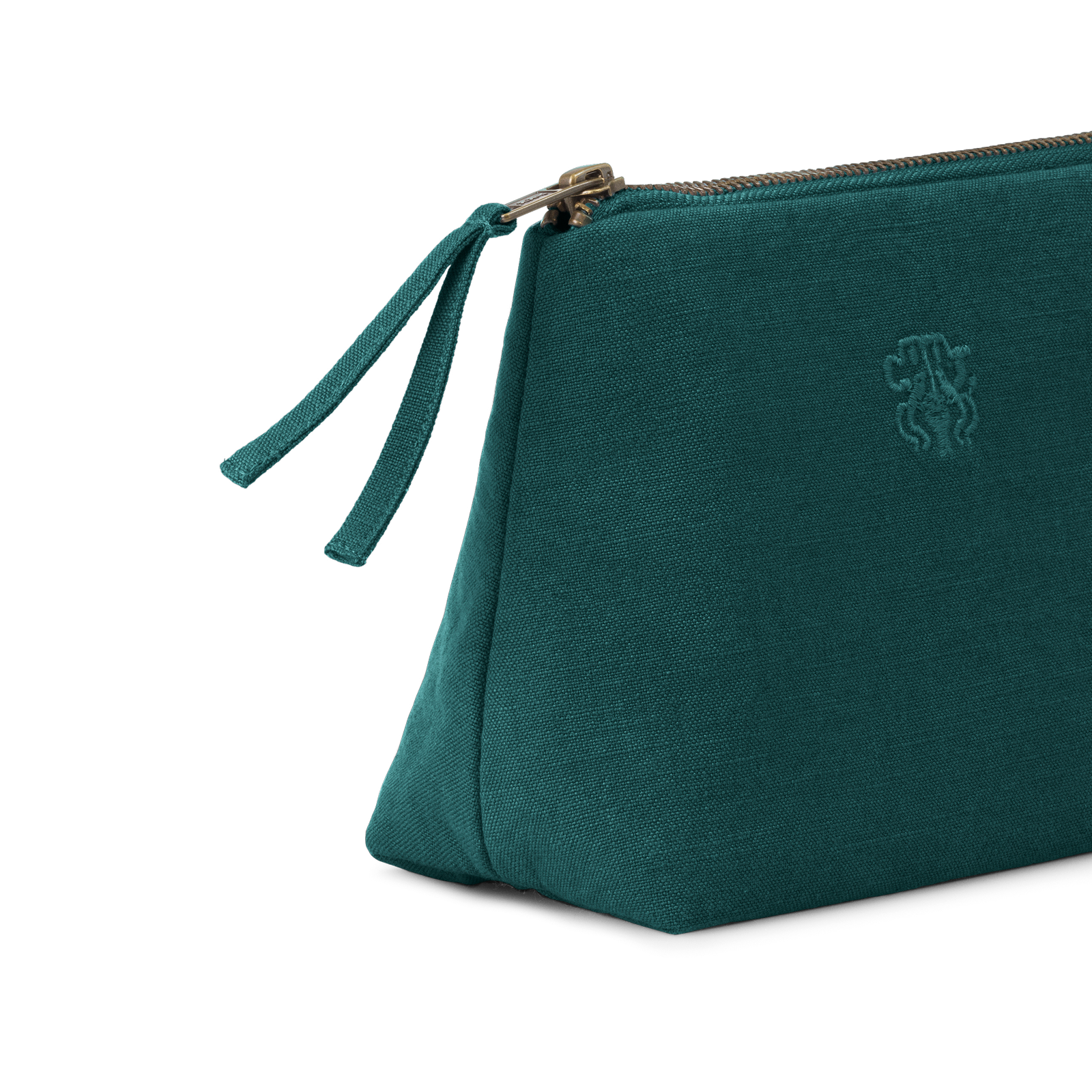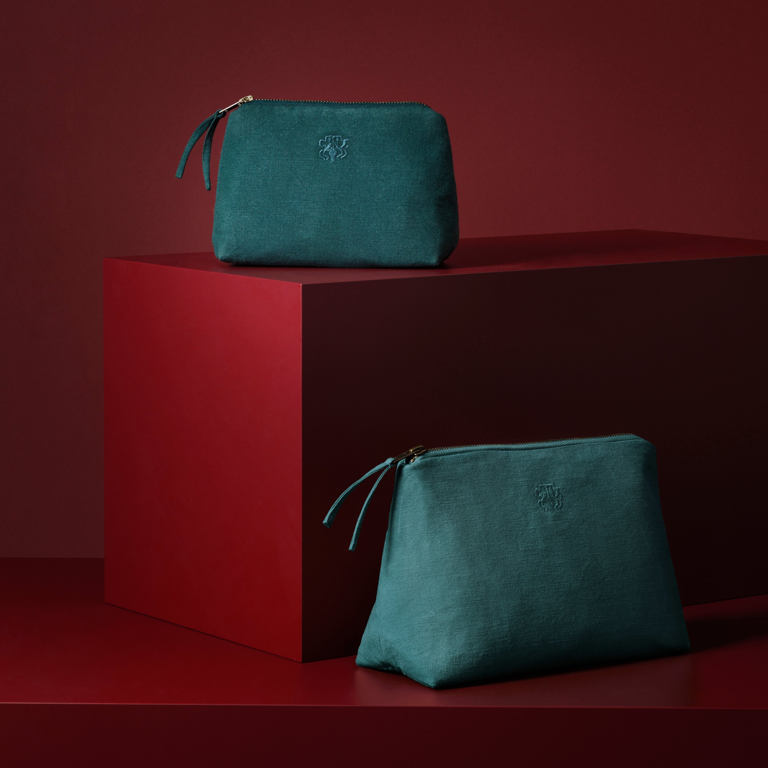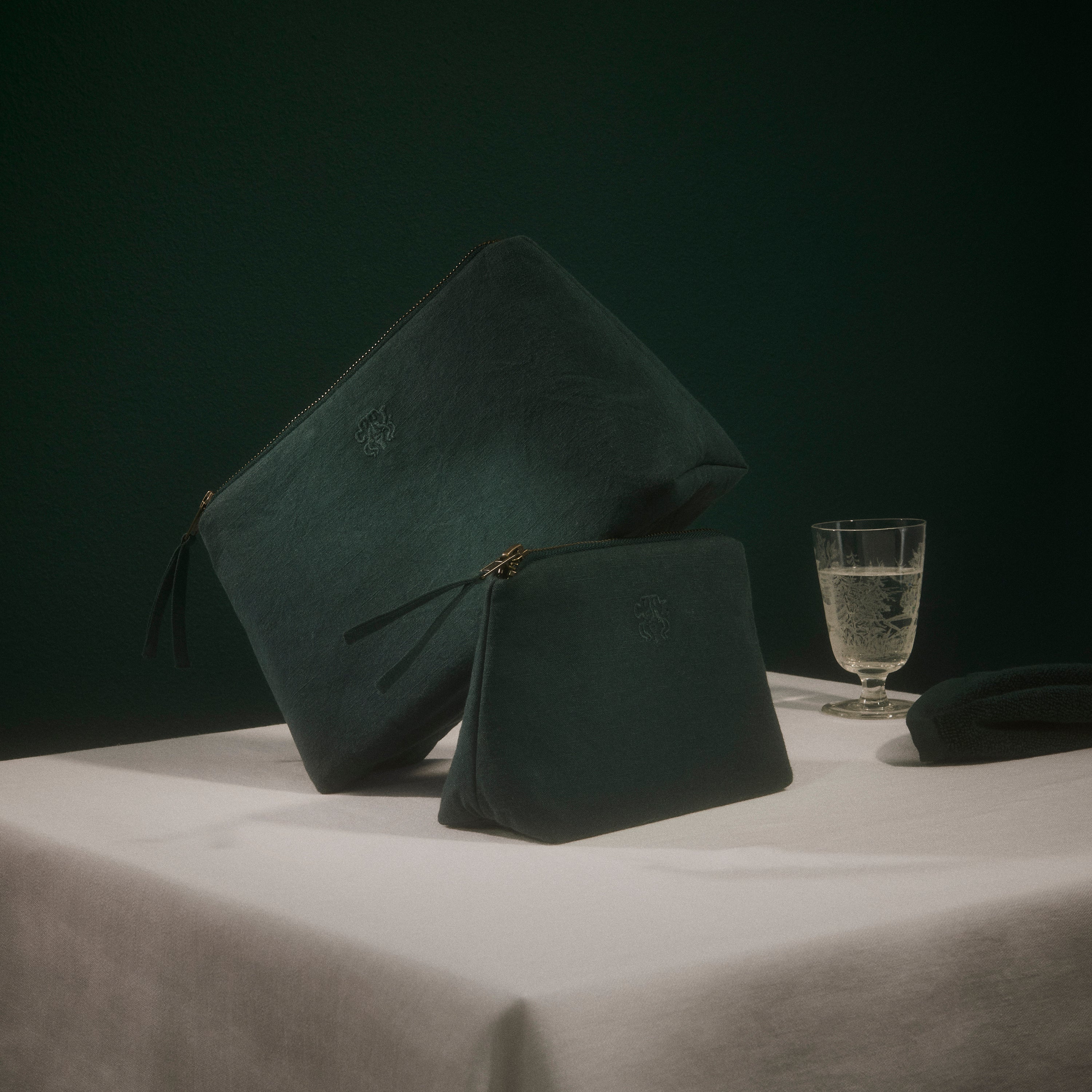 All toilettaske og kosmetikpung i farven Evergreen – en helt mørk og kølig grøn. Den funktionelle og rummelige toilettaske og kosmetikpung er lærredsvævet i 100 % bomuld med en indre lomme og har Georg Jensen Damasks logo broderet som elegant detalje.