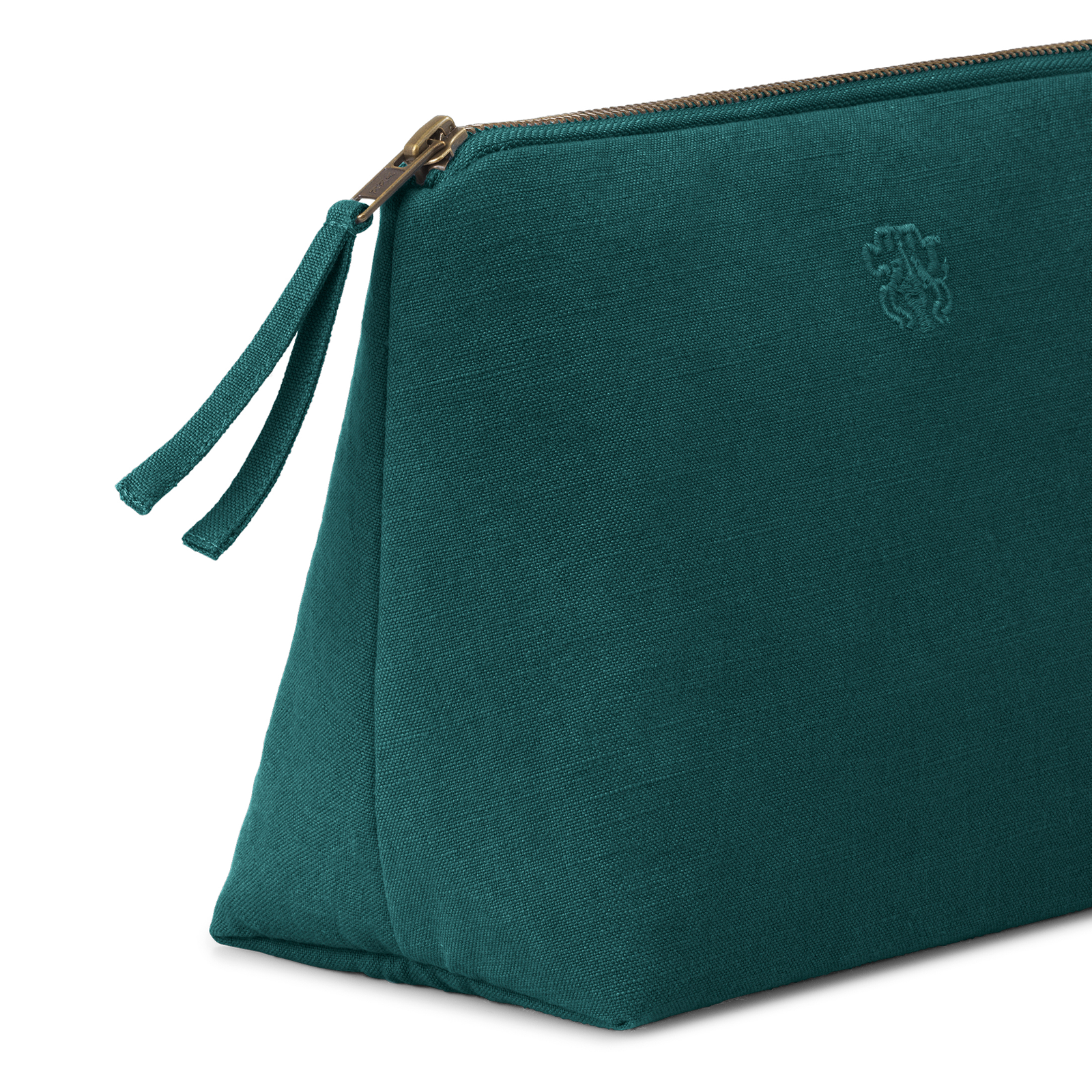 All toilettaske og kosmetikpung i farven Evergreen – en helt mørk og kølig grøn. Den funktionelle og rummelige toilettaske og kosmetikpung er lærredsvævet i 100 % bomuld med en indre lomme og har Georg Jensen Damasks logo broderet som elegant detalje.
