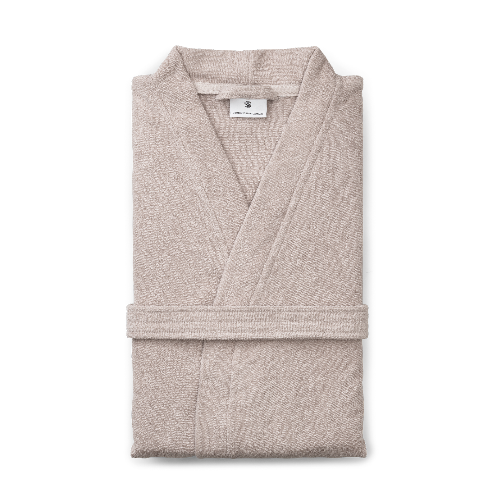 Frottébadekåbe i et klassisk design med kimonokrave, lommer, bindebånd i taljen og indvendige sømme med kantebånd. Terry badekåben er unisex og vævet i 100 % bomuld med løkker af dobbelttvundne og kæmmede garner, der giver en smuk og glansfuld overflade.