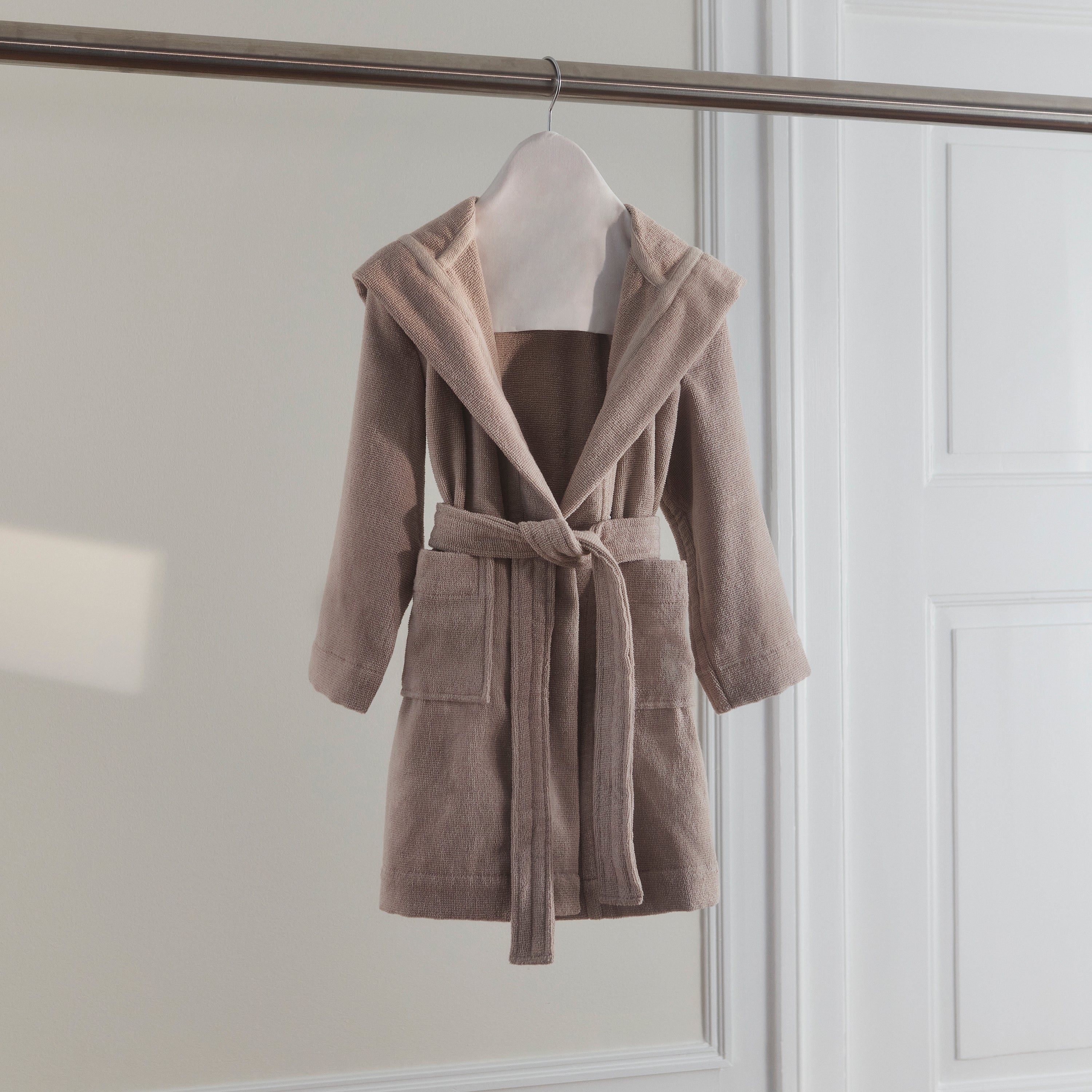 Blød og lun frottébadekåbe til børn. Terry badekåben har et klassisk design med hætte, lommer, bindebånd i taljen og indvendige sømme med kantebånd. Den er vævet i 100 % bomuld med løkker af dobbelttvundne og kæmmede garner, der giver en smuk og glansfuld overflade.