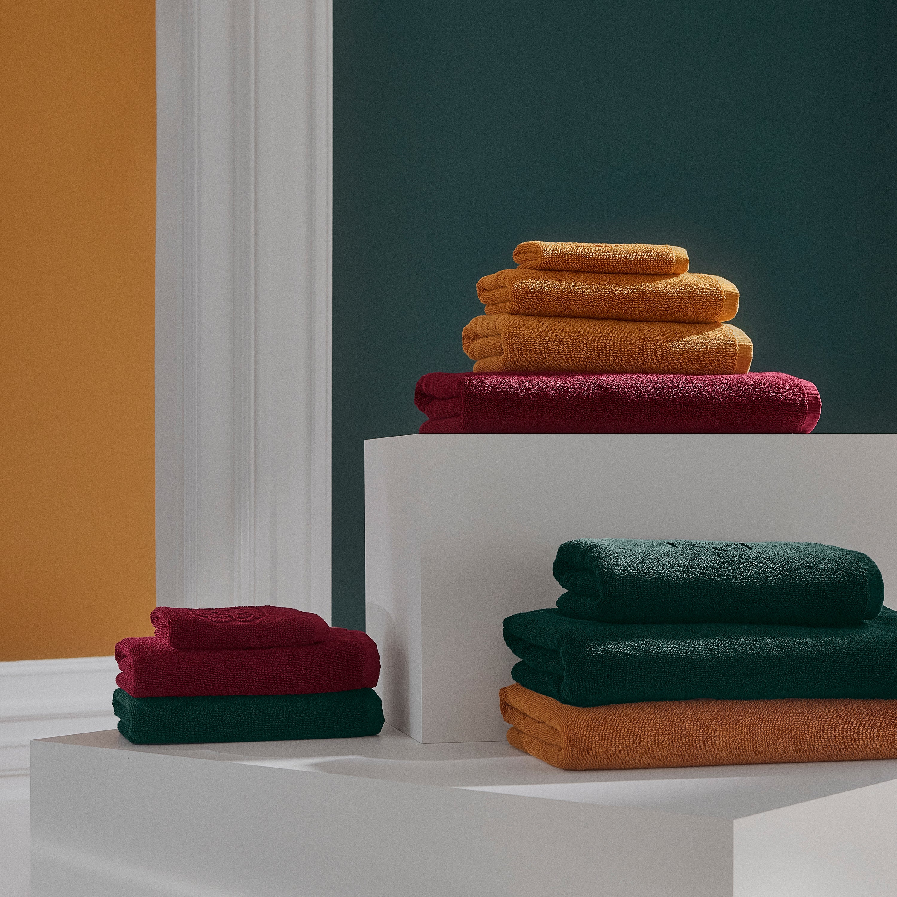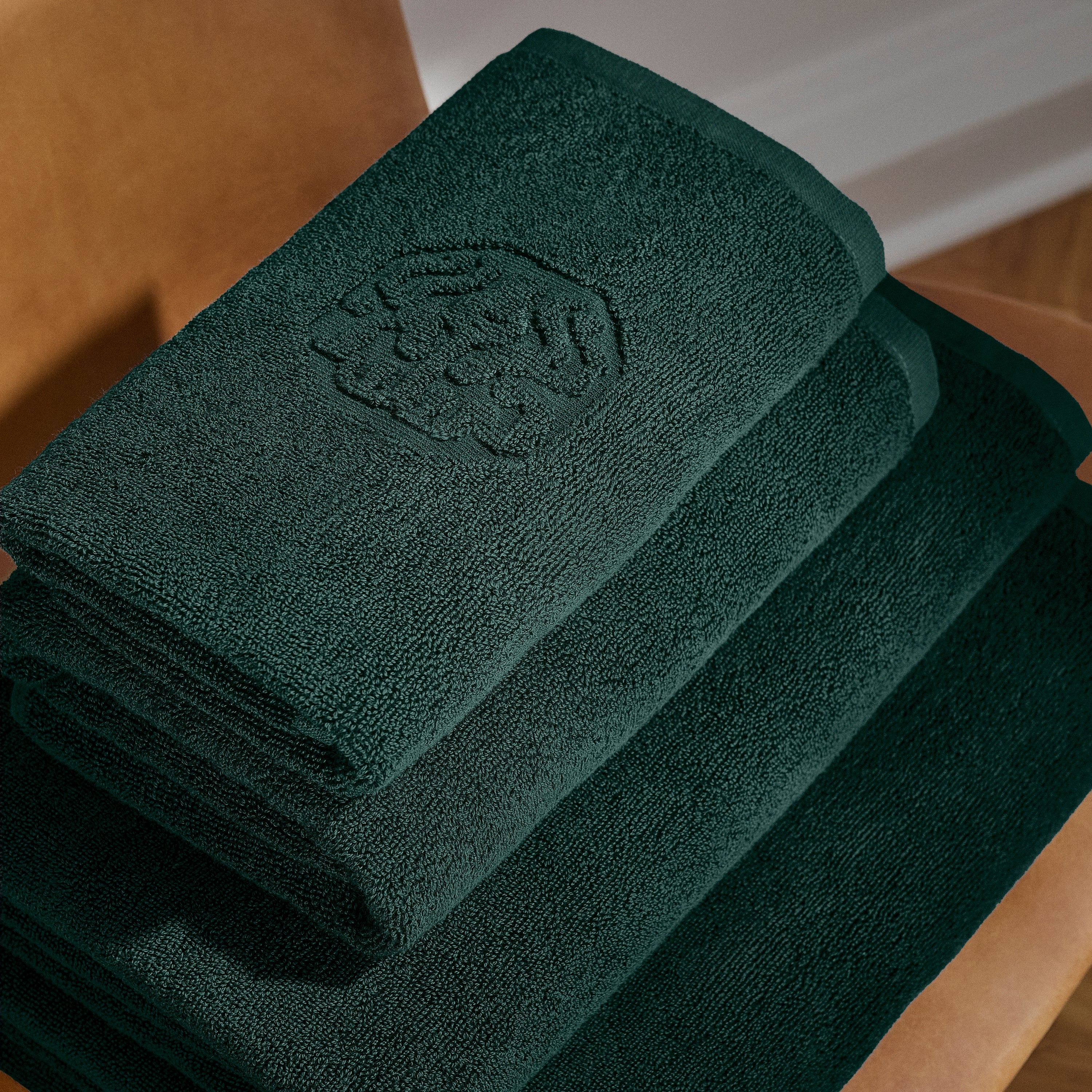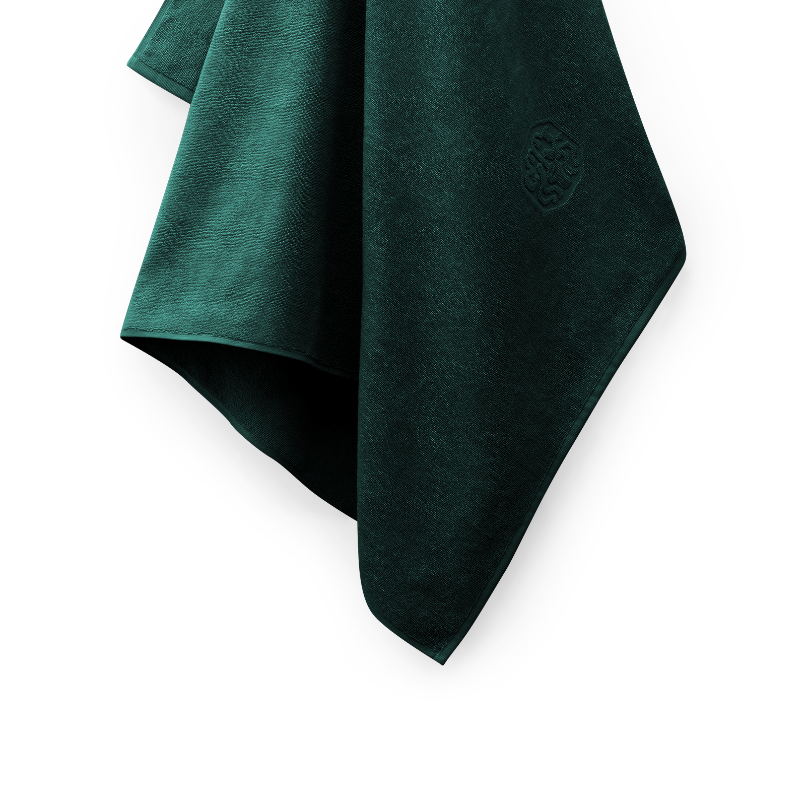 Det store og bløde Damask Terry badelagen i farven Evergreen – en helt mørk og kølig grøn, der giver et klassisk og sofistikeret udtryk. Som enkel detalje har badelagnet Georg Jensen Damasks ikoniske logo indvævet.