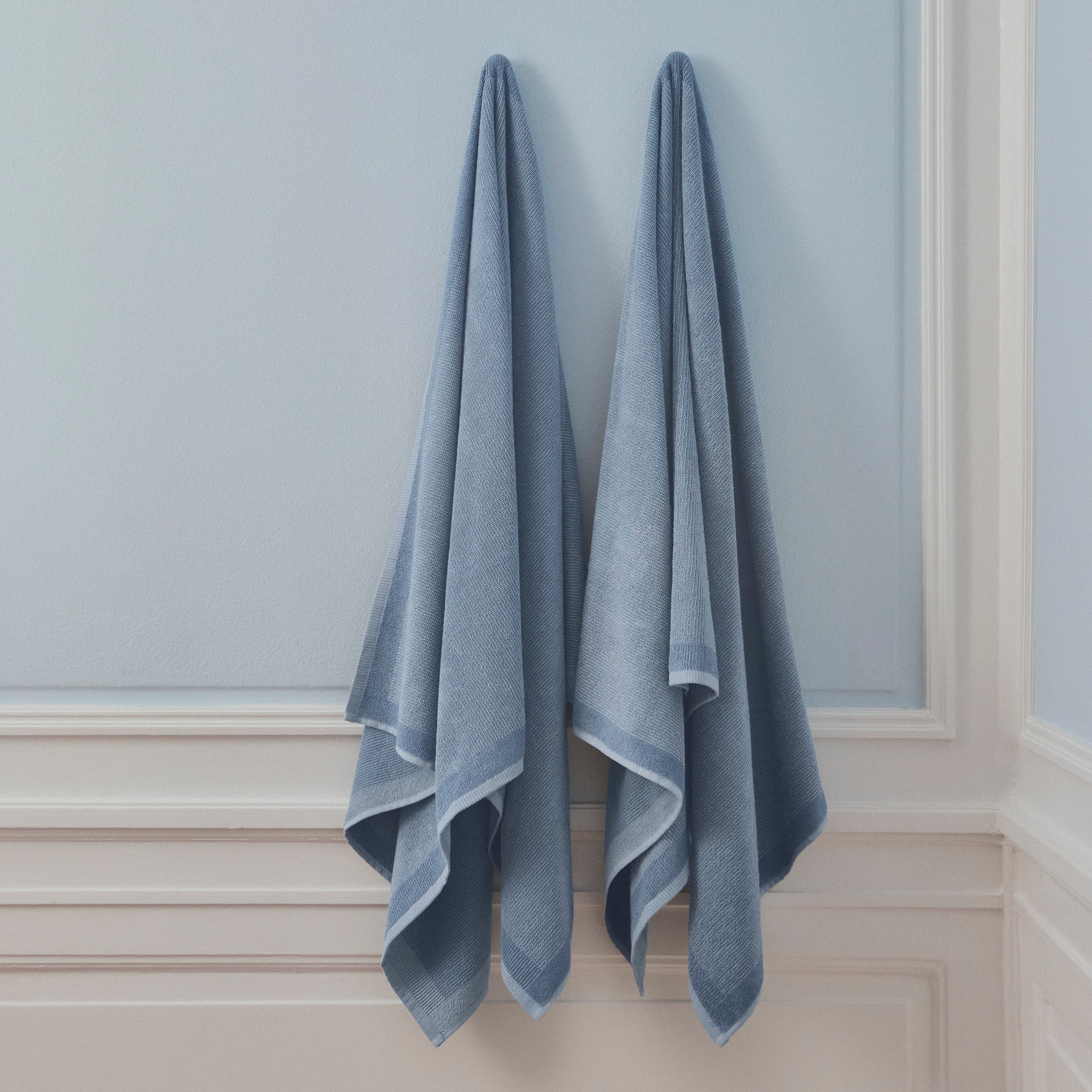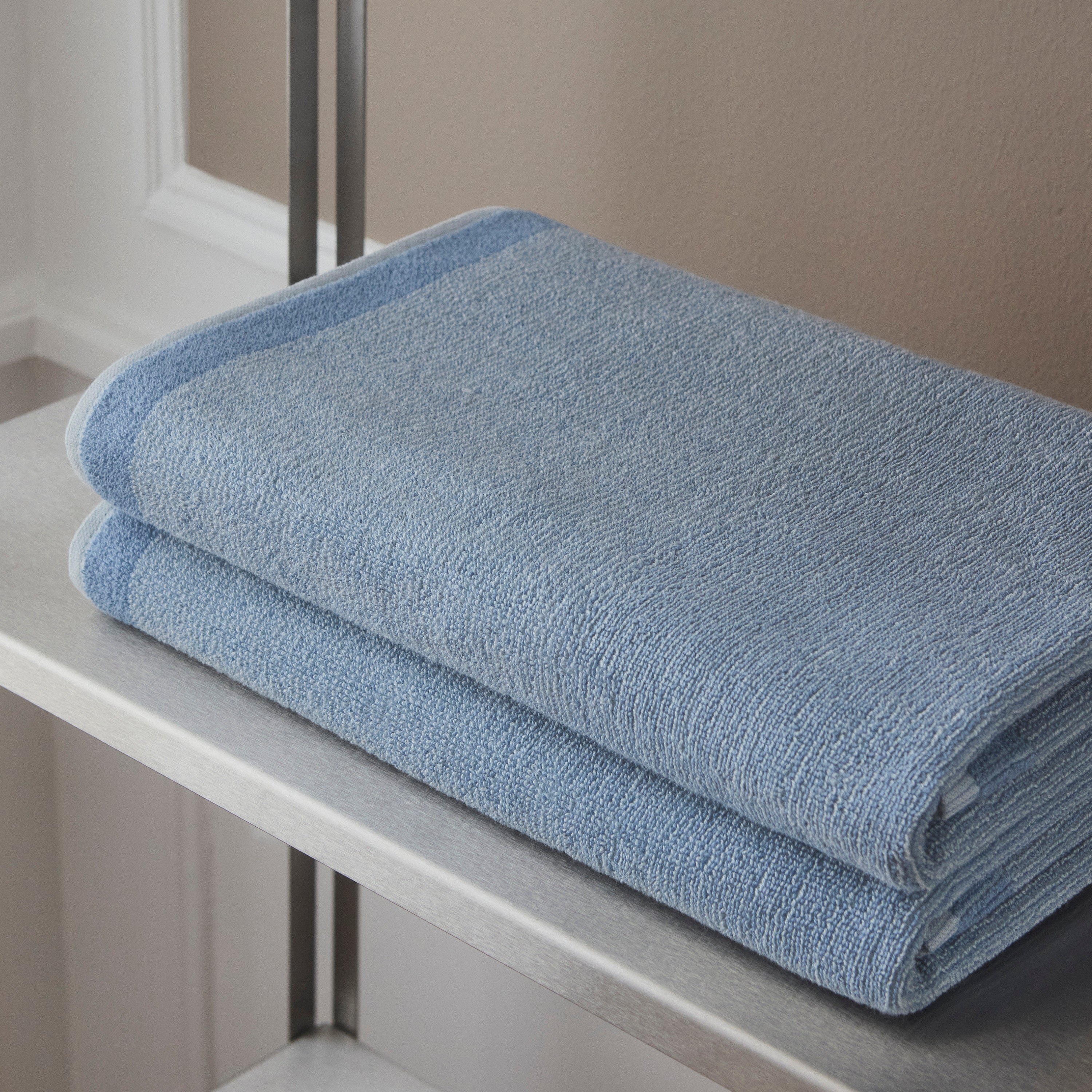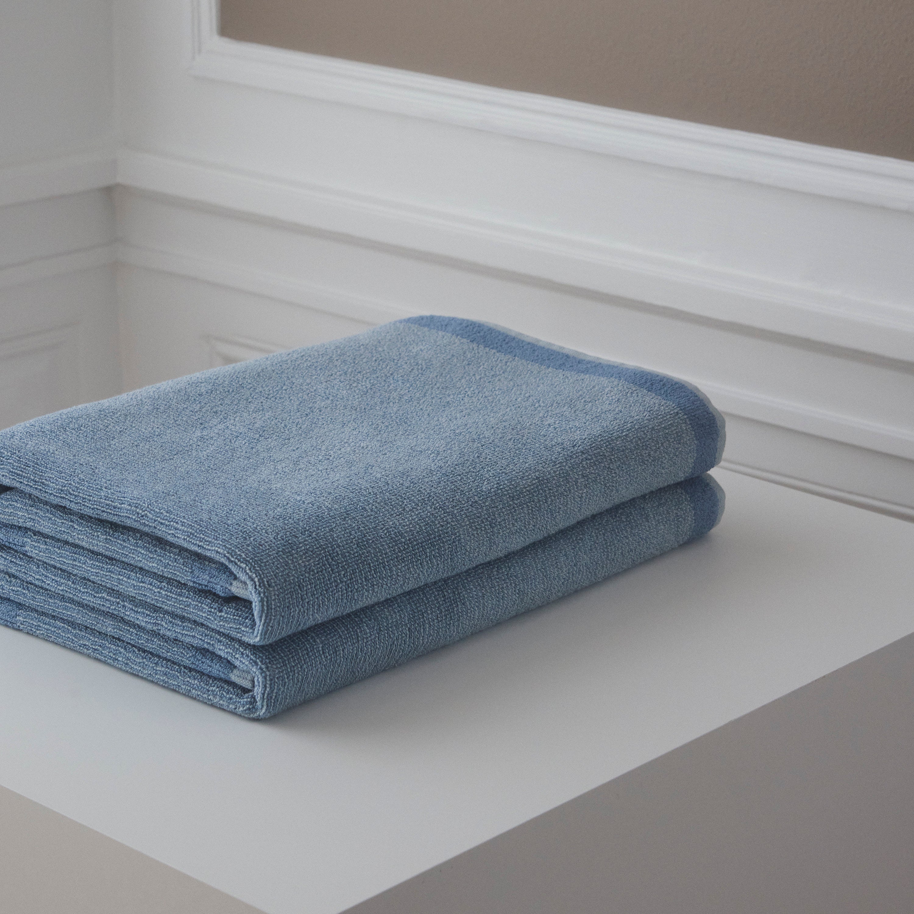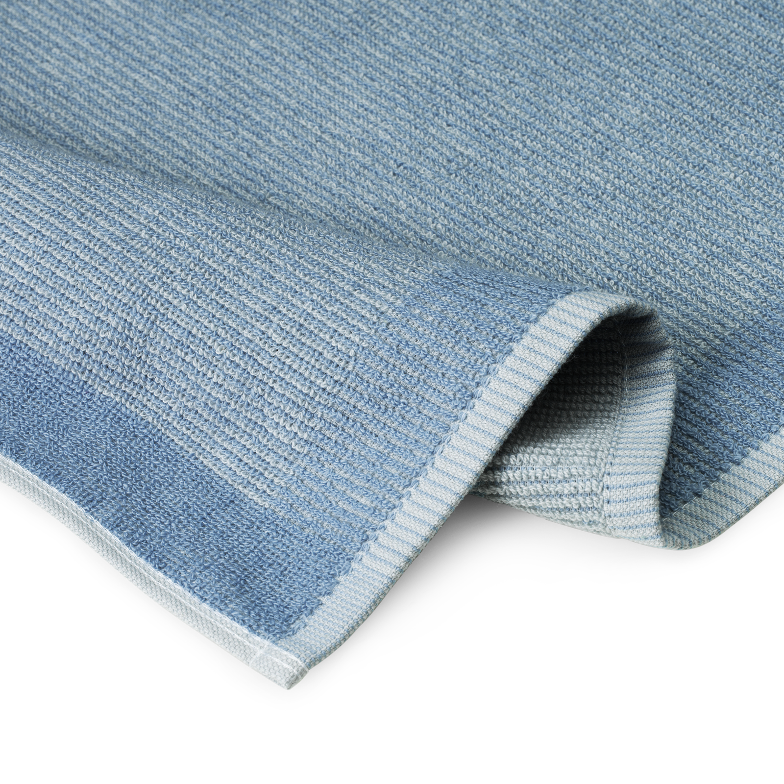 Solid badelagenet i 100 % bomuld har et enkelt udtryk med smalle striber og en elegant bort. Den raffinerede vævning gør, at badelagnet fylder mindre og er ideelt til rejsen eller sportstasken. Farven, Blue Hour, er en støvet mellemblå.