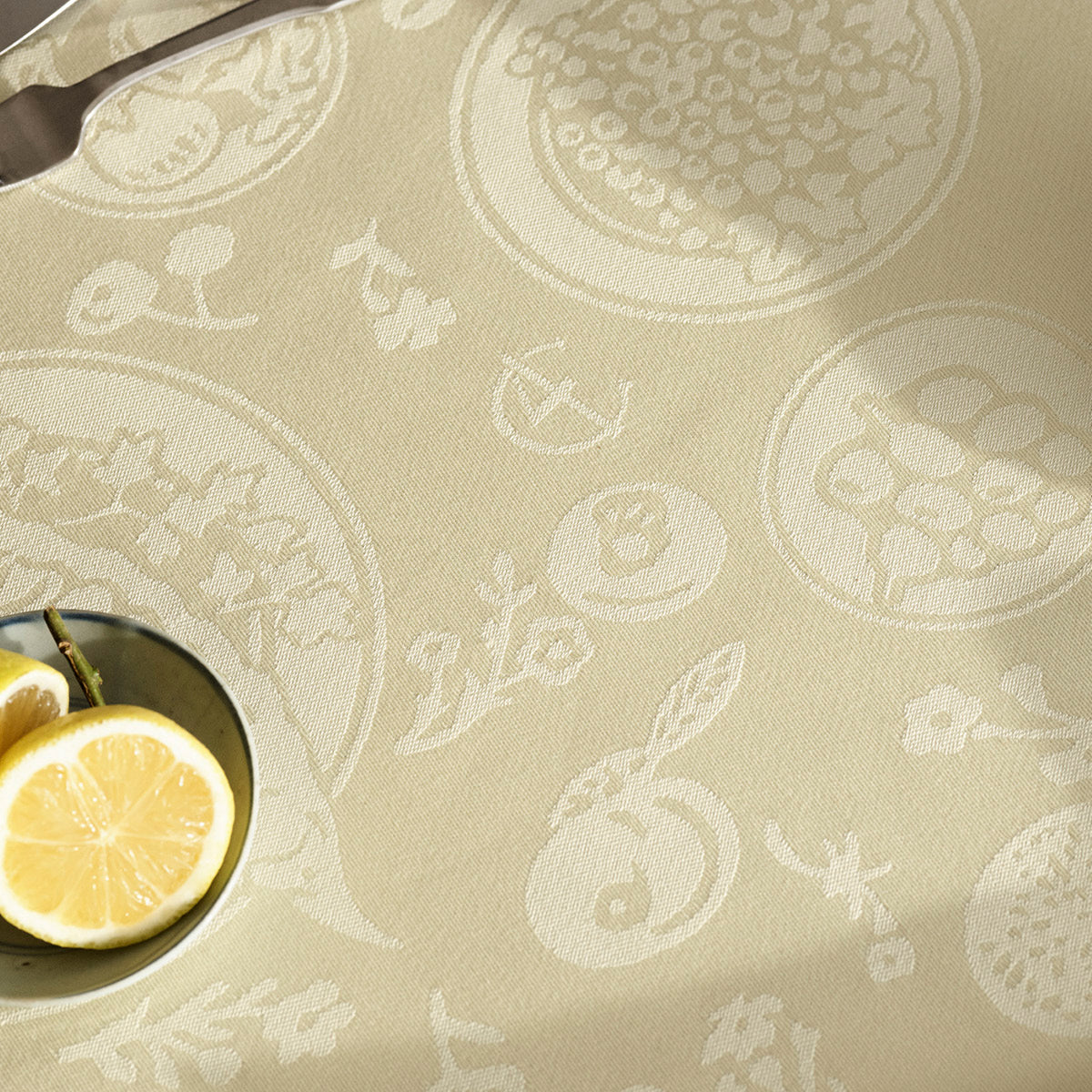 Banquet er en moderne fortolkning af Christian 4.s pragtdug. En elegant damaskvævet dug med et design bygget op af elementer fra renæssancemåltidet. Dugen er vævet i 100 % dobbelttvundet kæmmet bomuld. Den fås i to farver. Pale Yellow er en fin, lysegul nuance.
