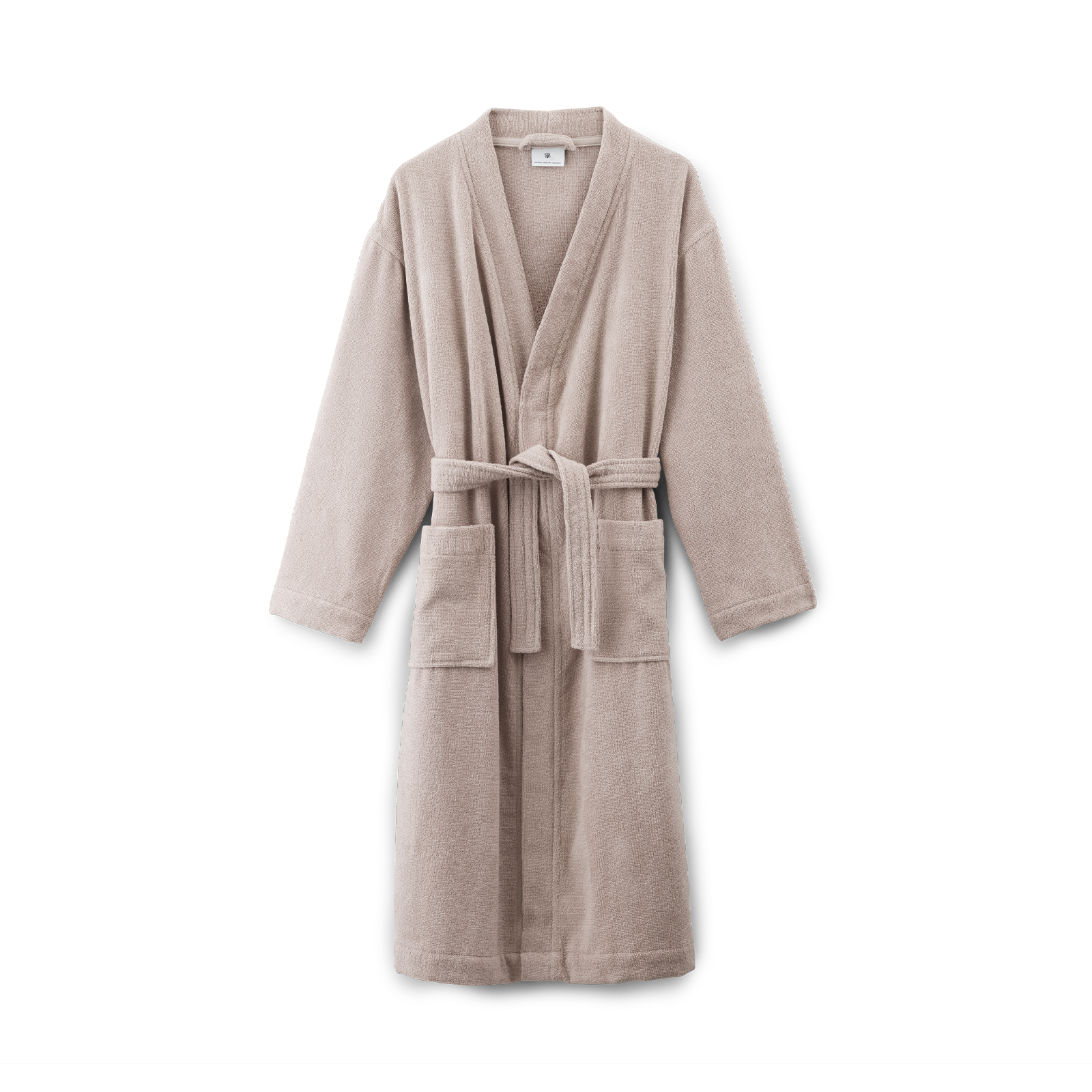 Frottébadekåbe i et klassisk design med kimonokrave, lommer, bindebånd i taljen og indvendige sømme med kantebånd. Terry badekåben er unisex og vævet i 100 % bomuld med løkker af dobbelttvundne og kæmmede garner, der giver en smuk og glansfuld overflade.