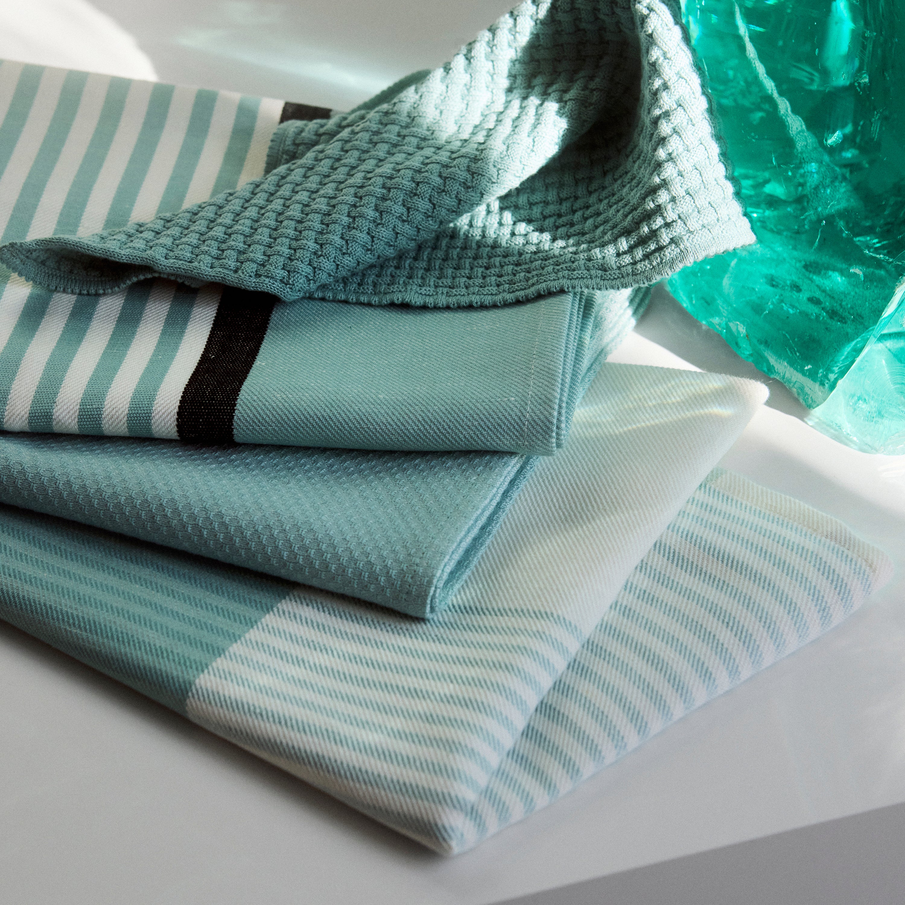 Becker 63 er et klassisk viskestykke med tern og skabt af felter i varierende bredder og farver. Det elegante og grafiske viskestykke er designet i 1963 af væver og designer John Becker. Det er vævet i en kombination af 50 % hør og 50 % bomuld, der giver det optimale tørreegenskaber. Den klare, blågrønne farve, Deep Glass, er inspireret af farven på råglas.