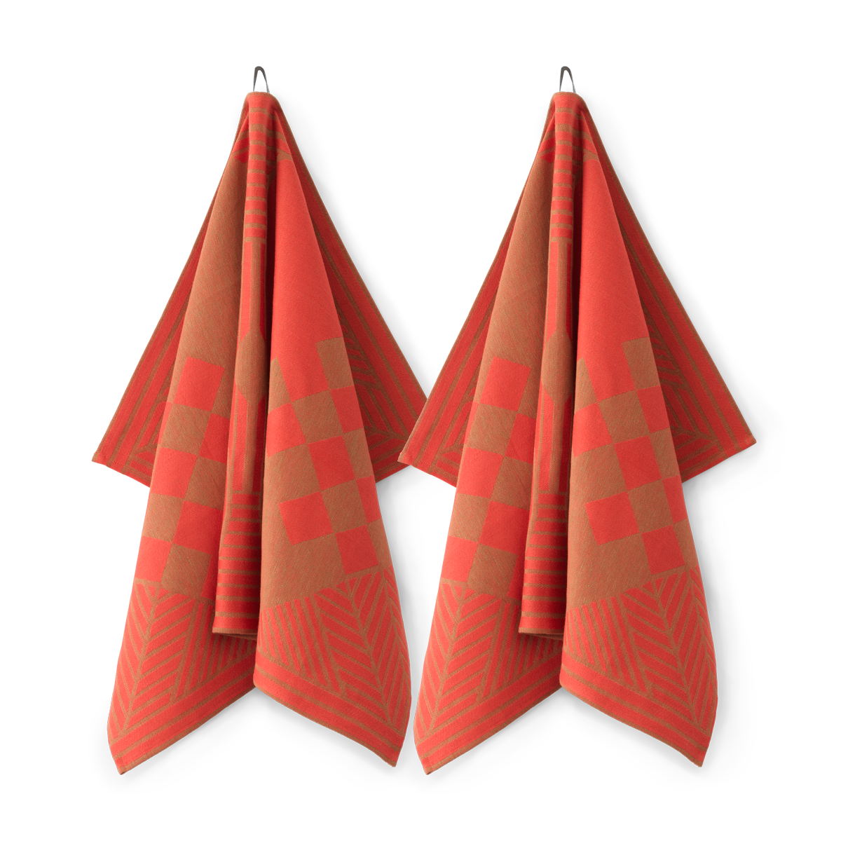 Christmas-viskestykkets klassiske julemotiv med flettede julehjerter og stiliserede grankviste bringer højtidsstemningen ud i køkkenet. Kombinationen af hør og bomuld giver viskestykket en optimal sugeevne. Farvekombinationen Archive Red er blandt de oprindelige fra 1975.
