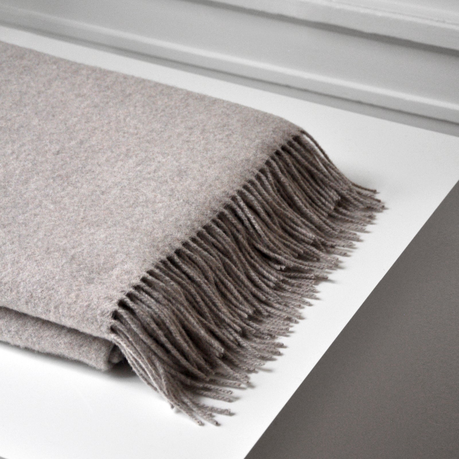 Clear har et elegant og enkelt design. Kombination af 90 % merinould og 10 % cashmere gør plaiden ekstra blød og uldens fine struktur tilføjer en særlig lethed. Plaiden er vævet i en smuk sandfarve og har lange frynser.