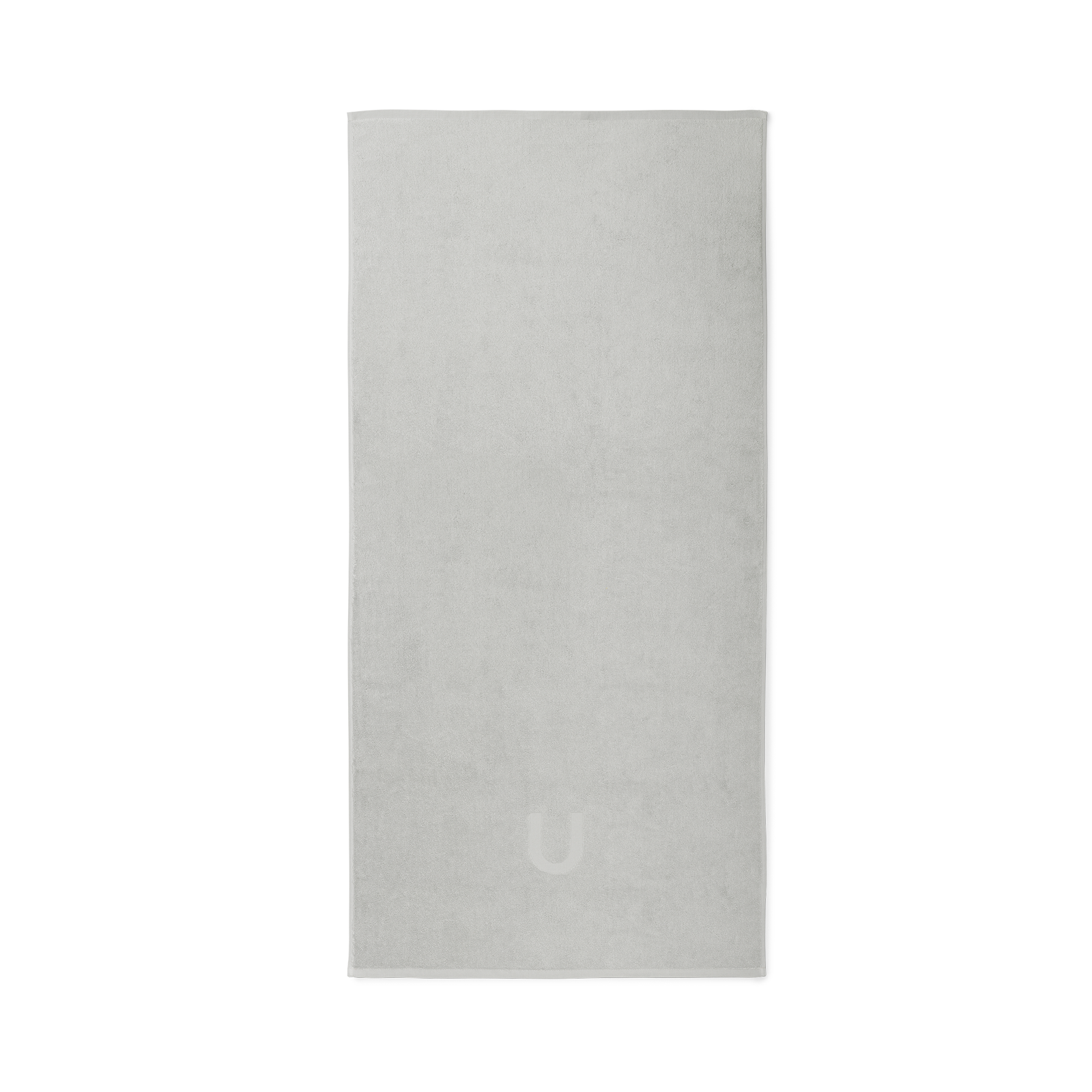 Damask Terry badehåndklæde med indvævet U bogstav. Badehåndklædet er jacquardvævet i 100 % dobbelttvundet, kæmmet bomuld med bogstav i relief. Det er både blødt, glansfuldt og slidstærkt. Den elegante farve, Platinum Grey, er en let og kølig nuance af grå.