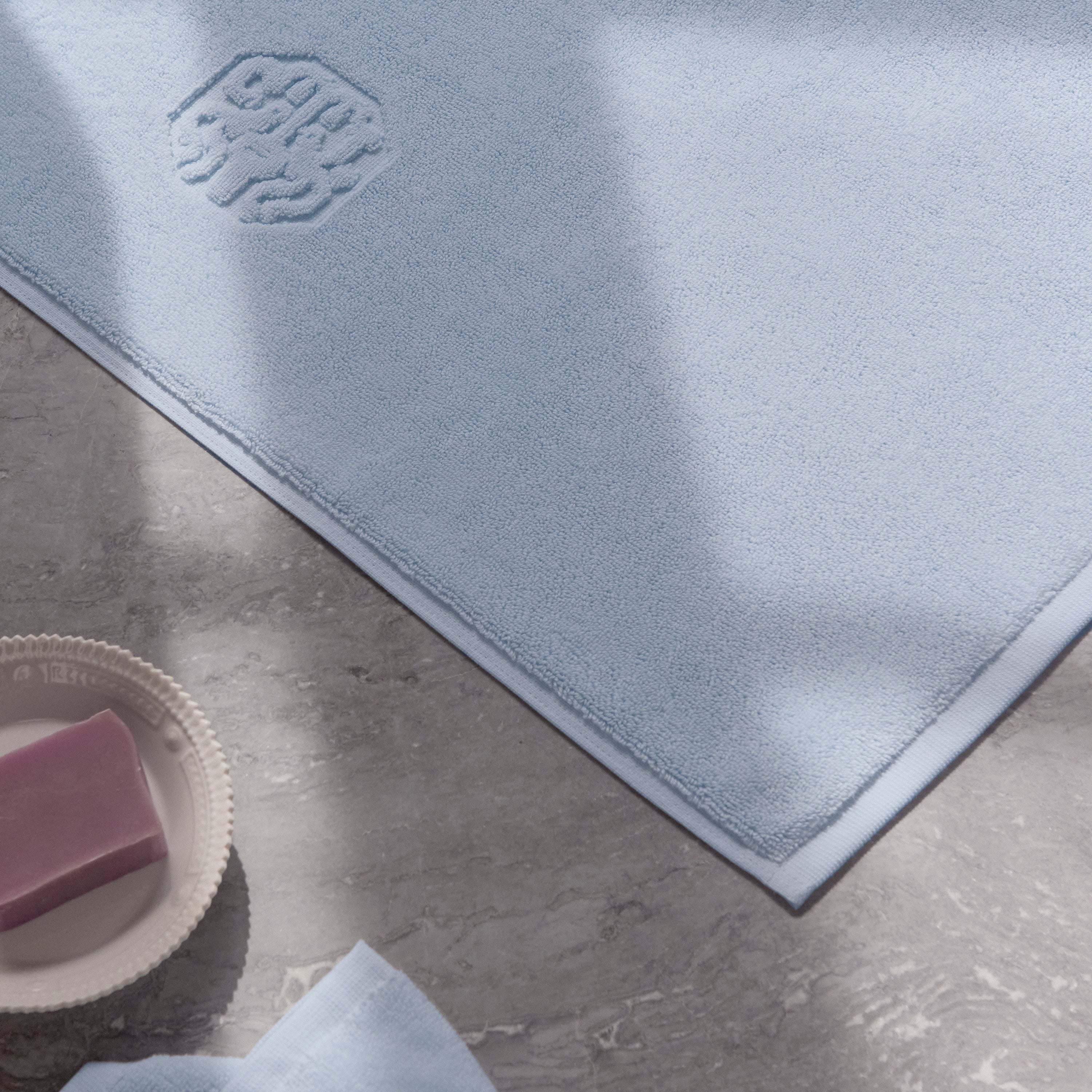 Damask Terry bademåtten har et enkelt udtryk med Georg Jensen Damasks ikoniske logo indvævet som elegant detalje. Minimal Blue er en hel let variant af lyseblå med et strejf af aqua.