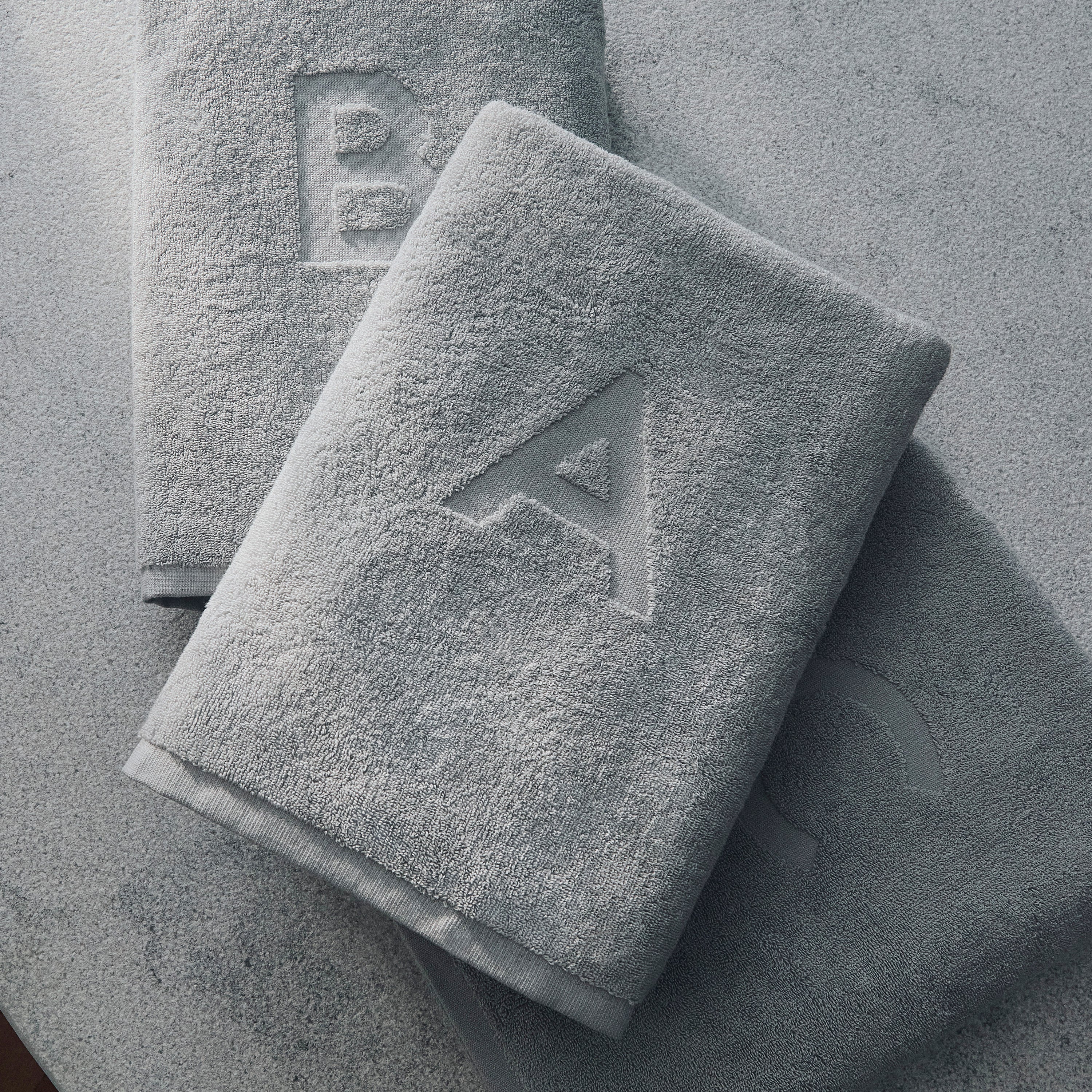Damask Terry badehåndklæde med indvævet R bogstav. Badehåndklædet er jacquardvævet i 100 % dobbelttvundet, kæmmet bomuld med bogstav i relief. Det er både blødt, glansfuldt og slidstærkt. Den elegante farve, Platinum Grey, er en let og kølig nuance af grå.