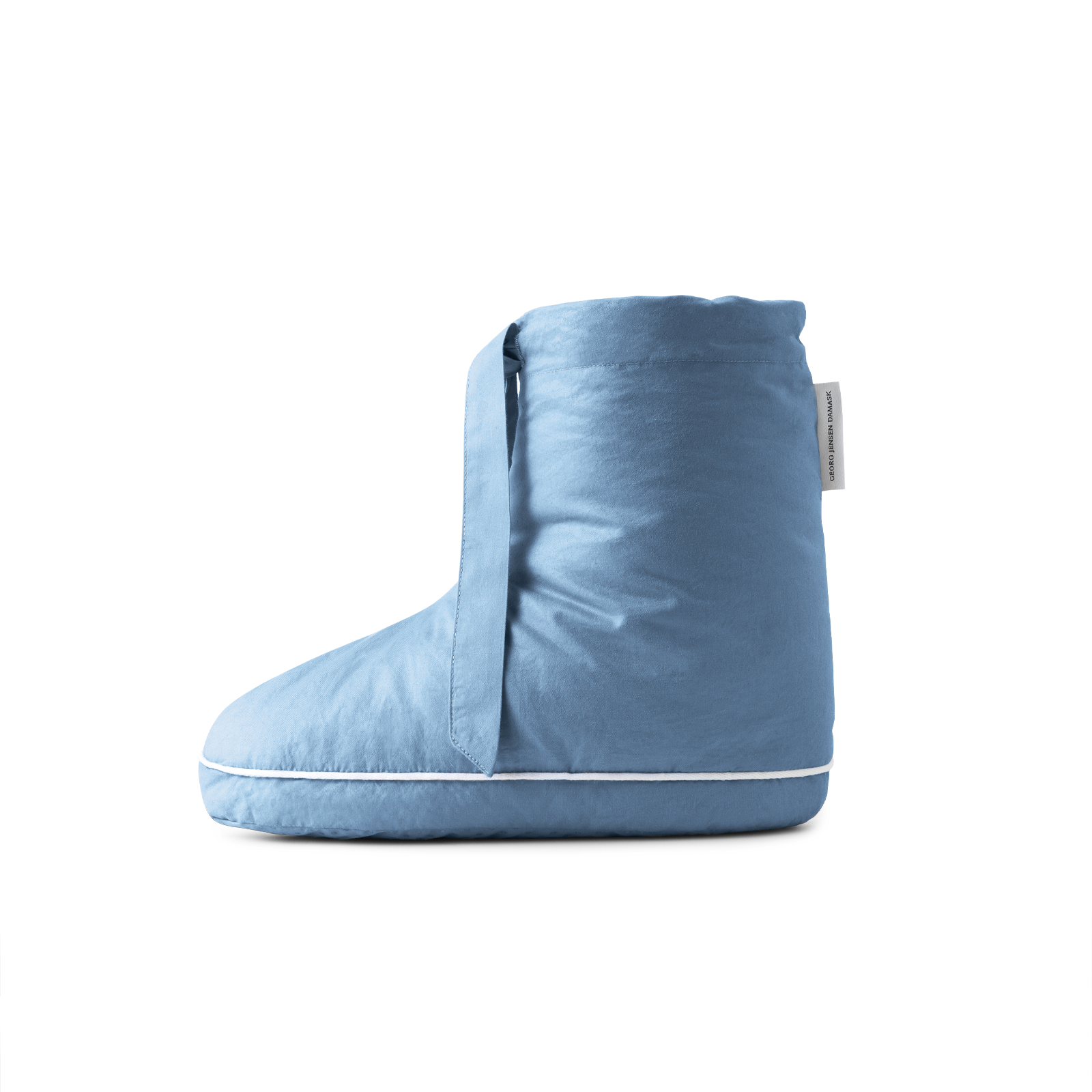 Bløde og lune andedunsokker med elegant piping og bindebånd ved anklen. Cloud dunssokkerne er satinvævet i 100 % bomuld med fyld af luftige og åndbare GRS-certificerede andedun og fjer. Blue Hour er en smuk og tidløs mellemblå farve.