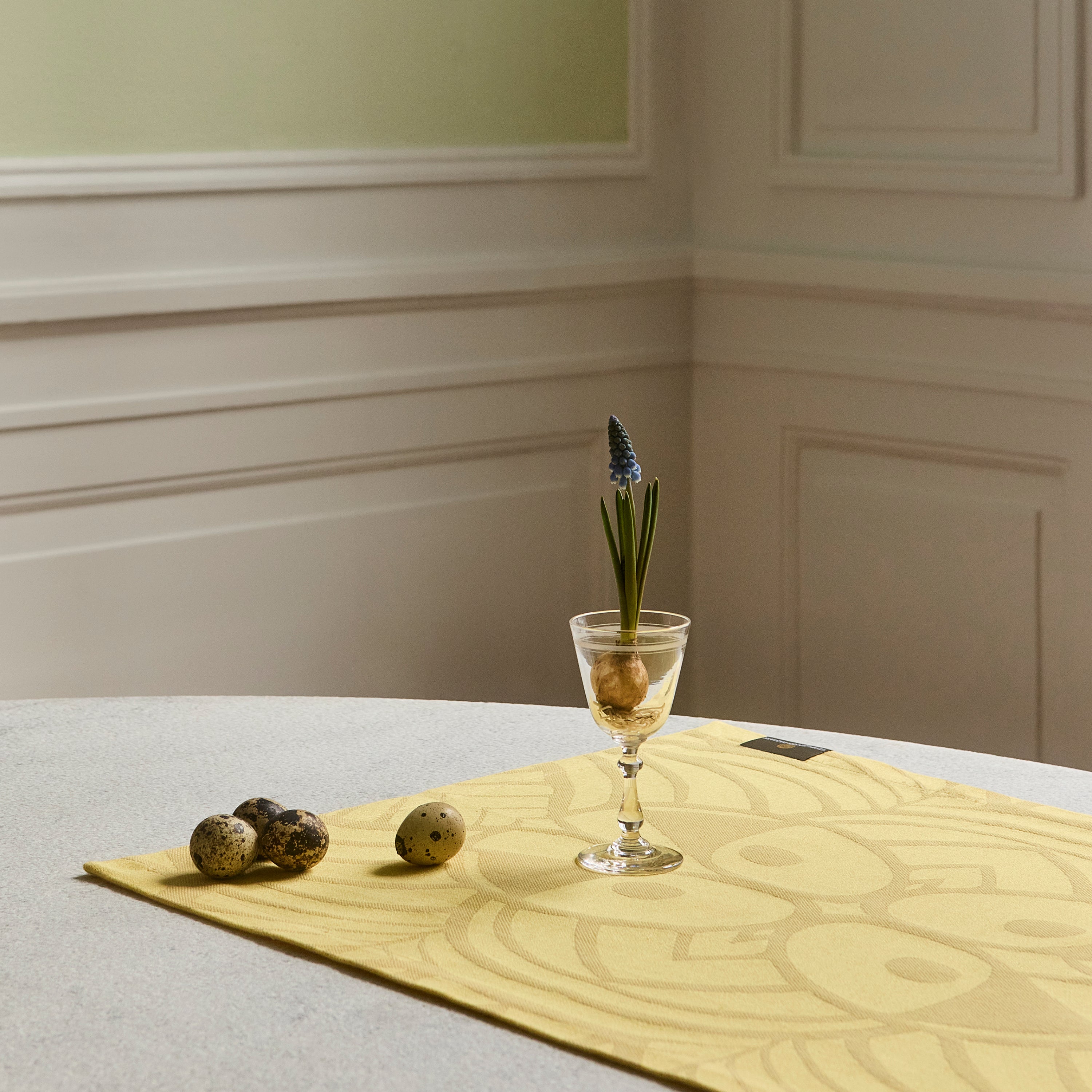 Den kraftige damaskvævning i 50 % hør og 50 % bomuld giver dækkeservietterne et rustikt udtryk, som gør dem lidt mere uformelle, men ikke mindre smukke at dække op med i påsketiden.