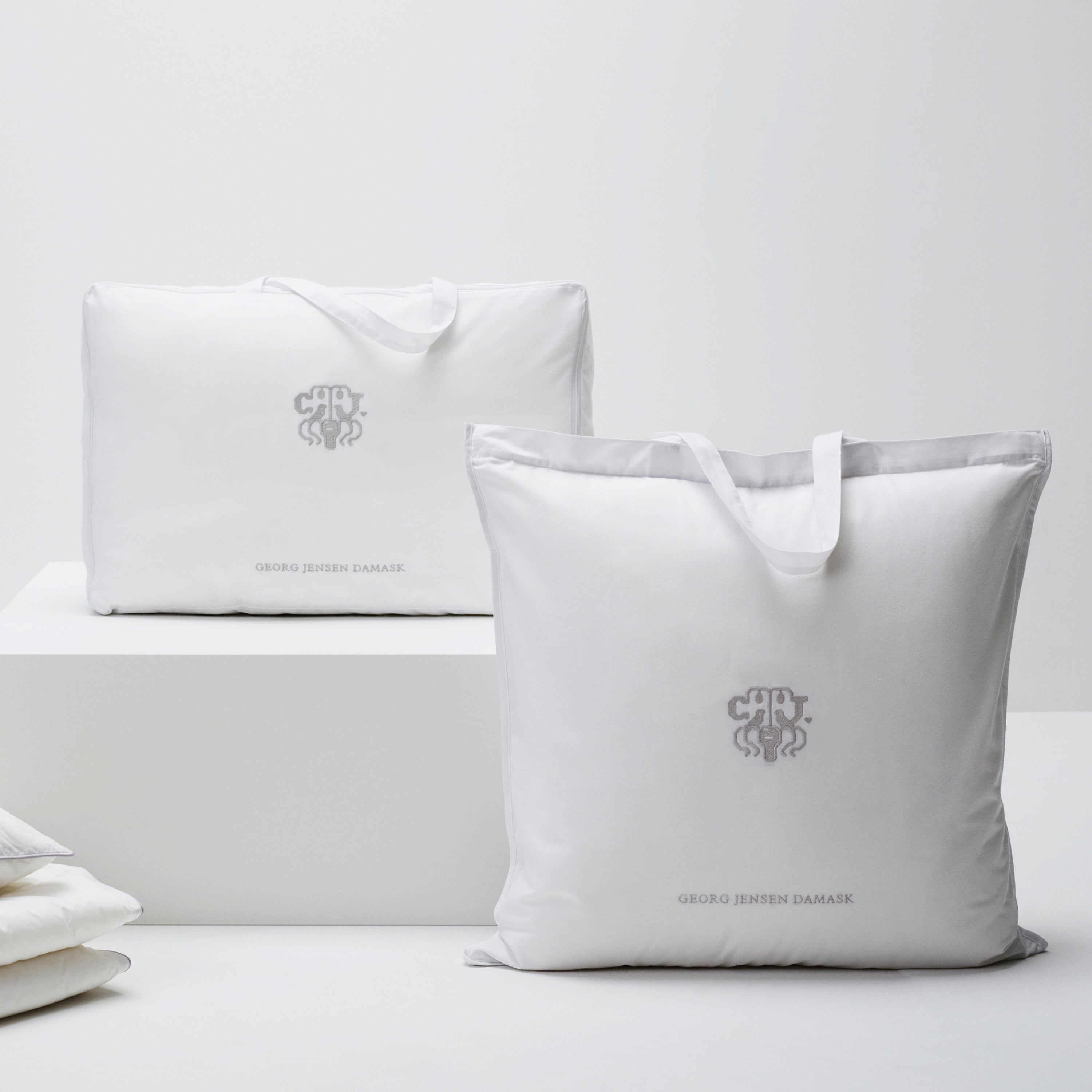 Andedunspuden bærer Georg Jensen Damasks ikoniske logo som et diskret broderi – et symbol på kvalitet og omhyggelighed.