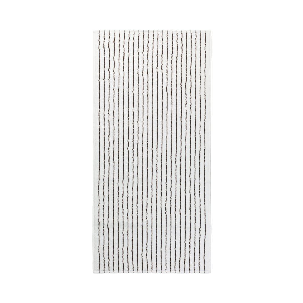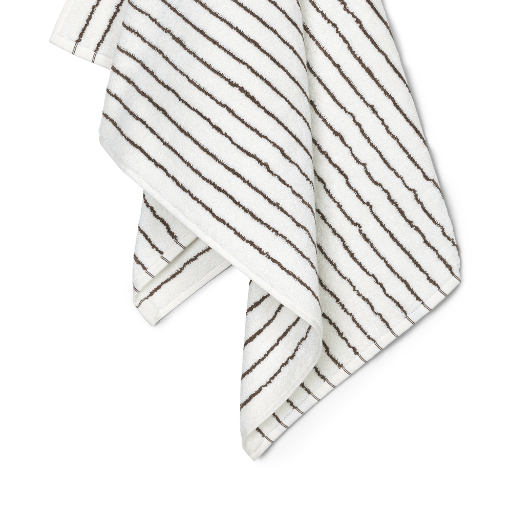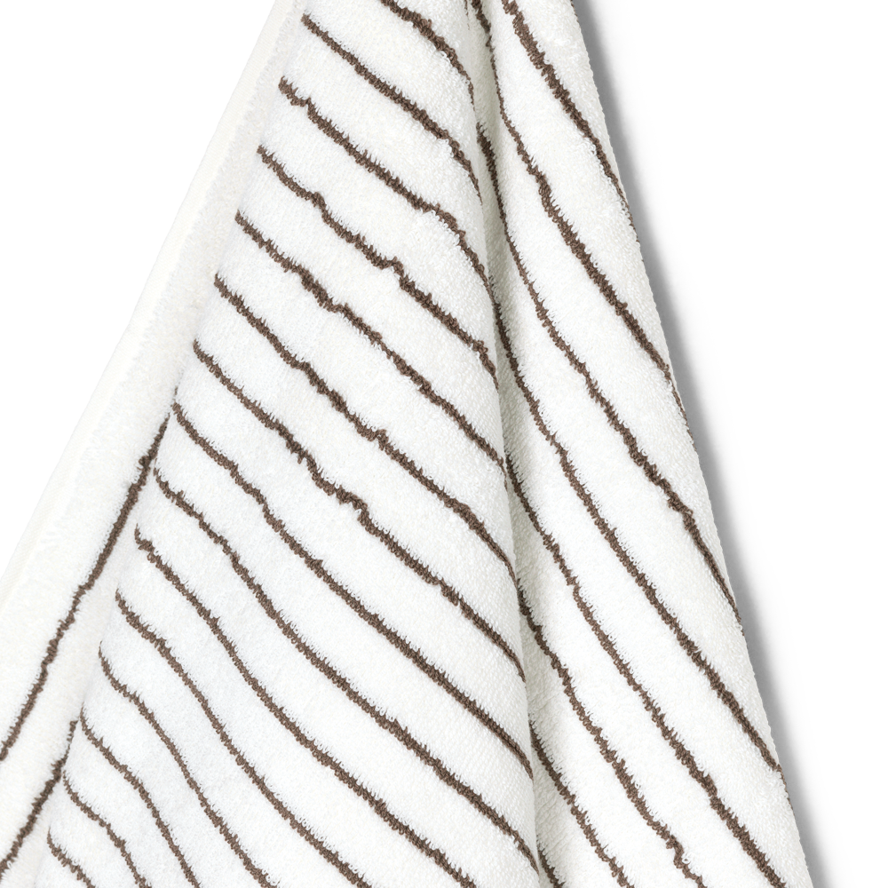 De smalle mørkebrune og hvide striber giver badehåndklædet et moderne udtryk, der skaber liv på badeværelset. Kombiner det evt. med ensfarvede håndklæder. Vores frotté bliver bedre og bedre, jo mere det bliver brugt.