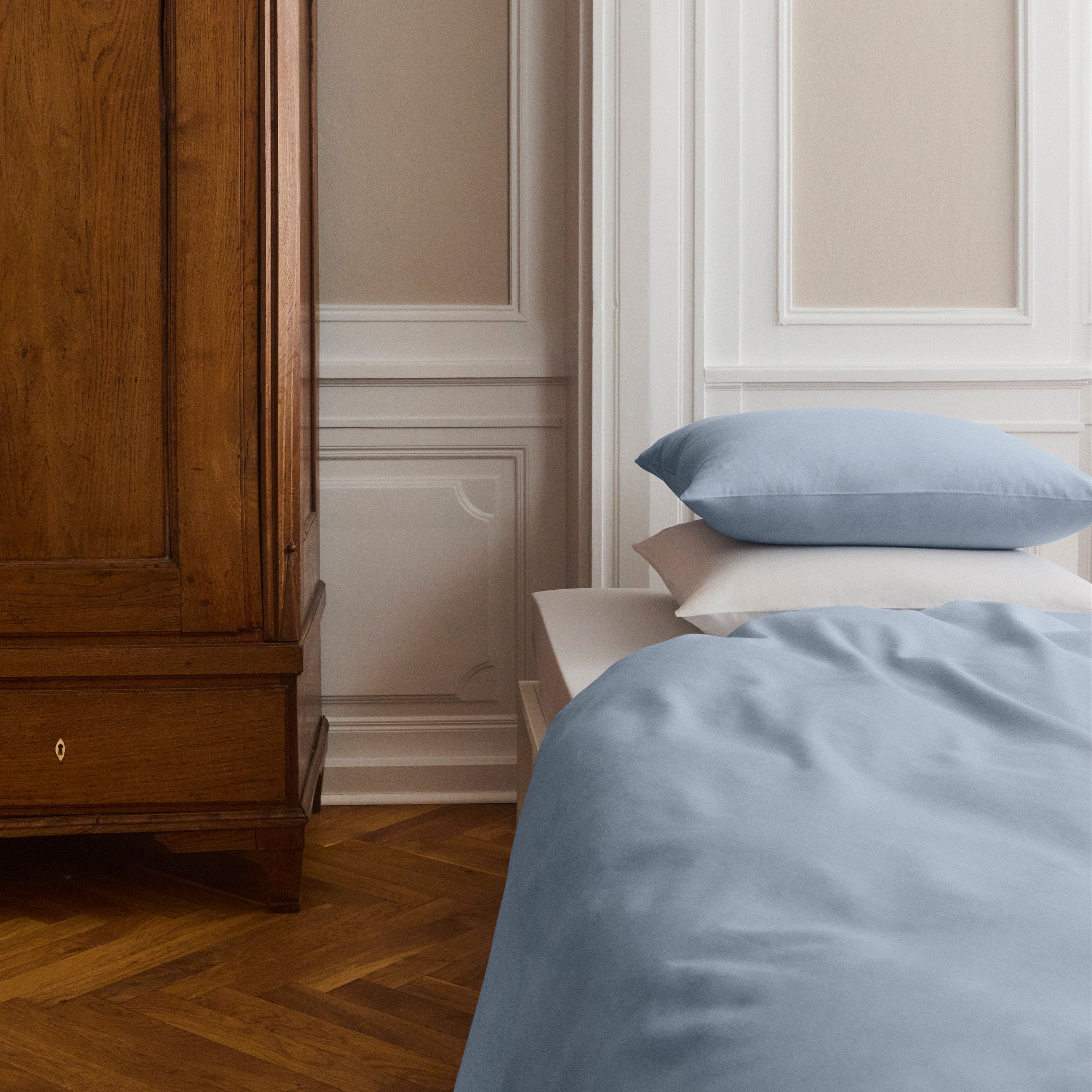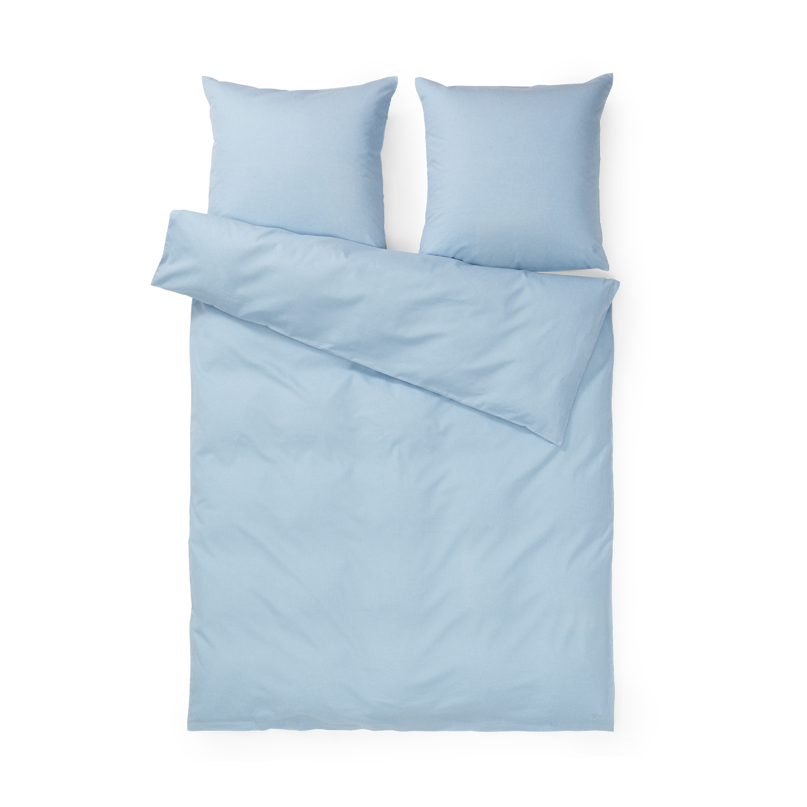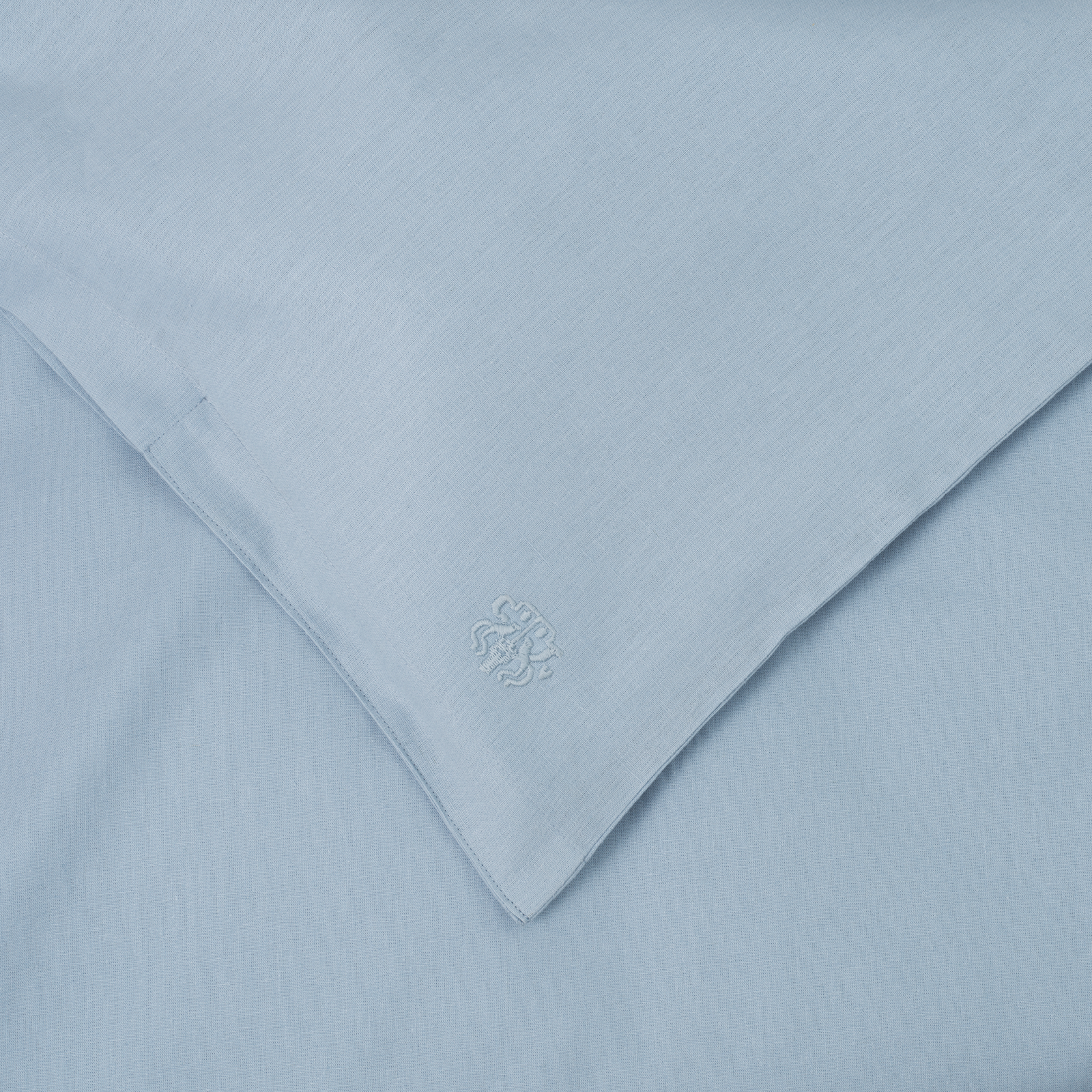Even sengetøjet er lærredsvævet i hør og bomuld for at forene de to materialers særlige egenskaber. Hørens naturlige tekstur kombineret med bomuldens blødhed og formstabilitet. Sammen giver det en smuk, mat og blød overflade – og et åndbart og slidstærkt sengetøj. Farven Blue Haze er en lys og støvet nuance af blå.