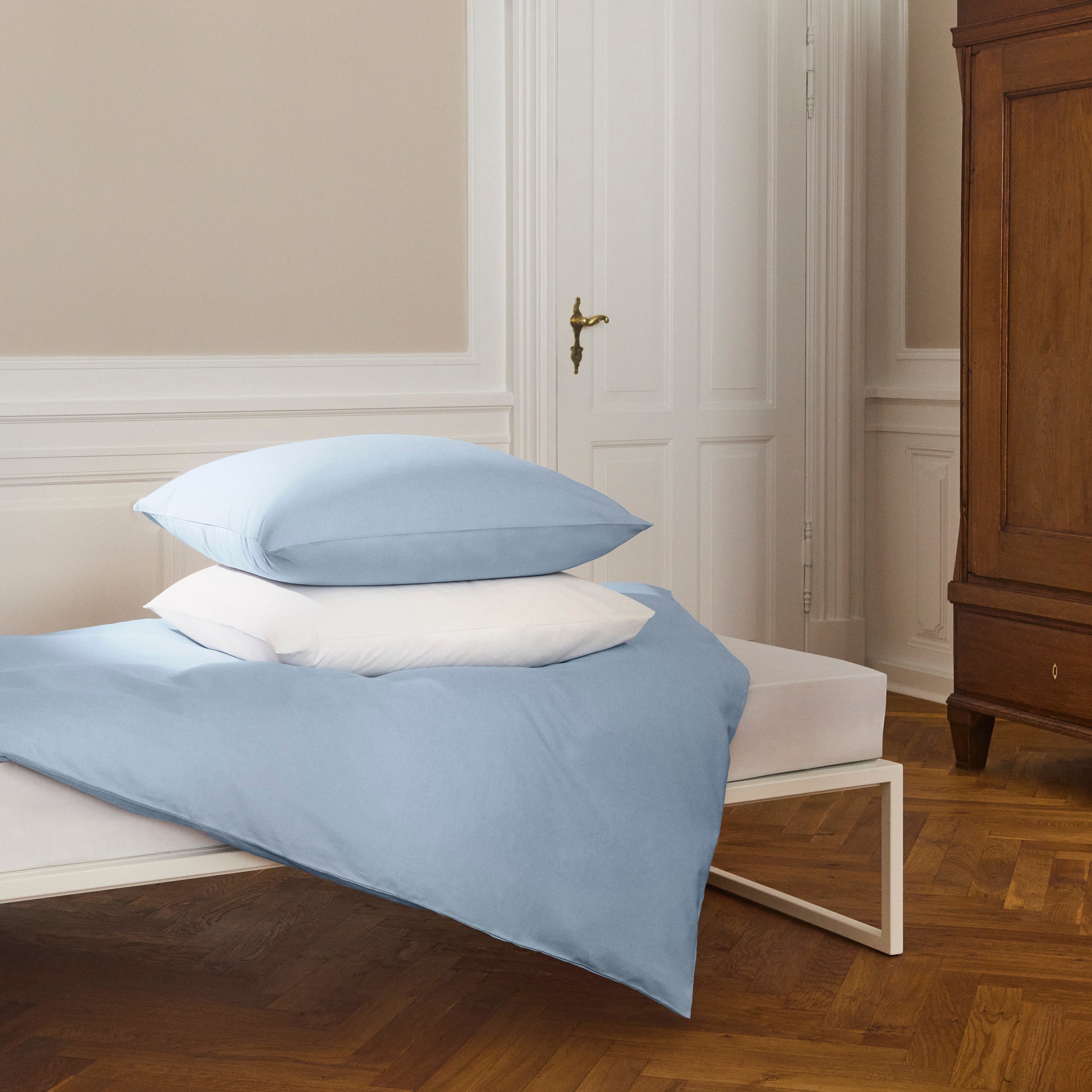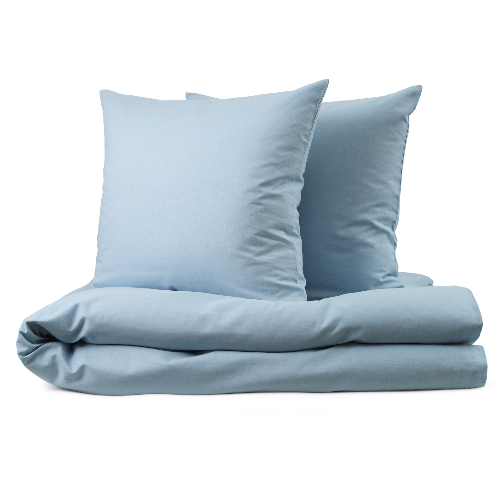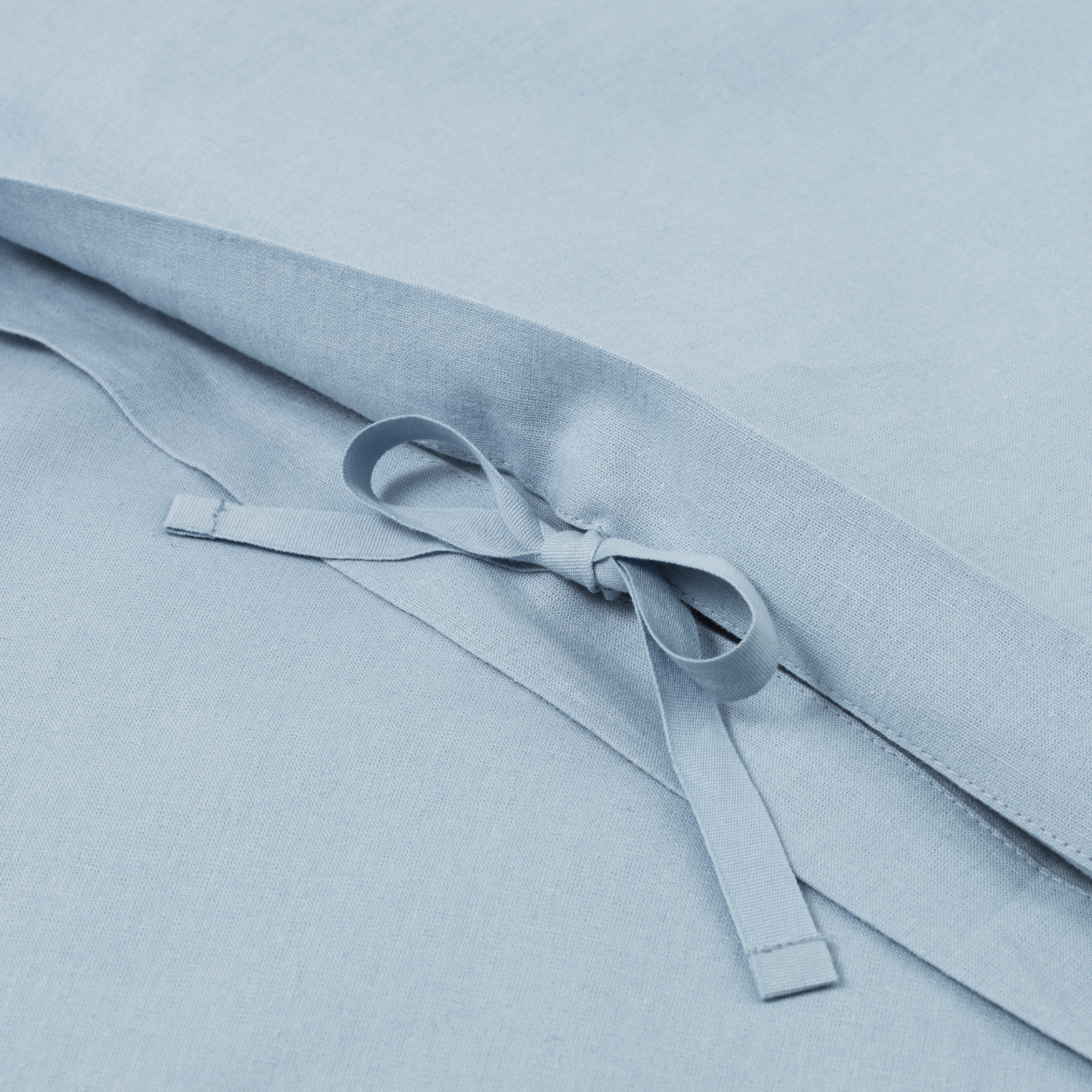 Even sengetøjet er lærredsvævet i hør og bomuld for at forene de to materialers særlige egenskaber. Hørens naturlige tekstur kombineret med bomuldens blødhed og formstabilitet. Sammen giver det en smuk, mat og blød overflade – og et åndbart og slidstærkt sengetøj. Farven Blue Haze er en lys og støvet nuance af blå.