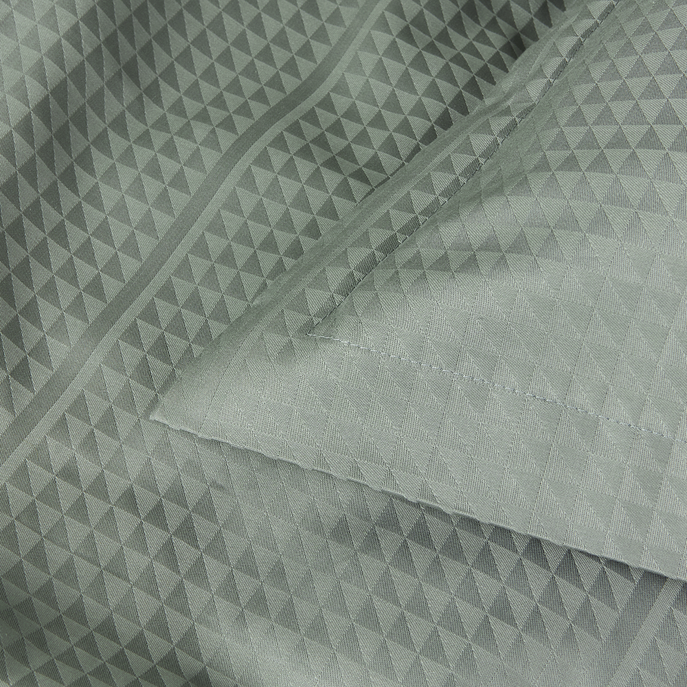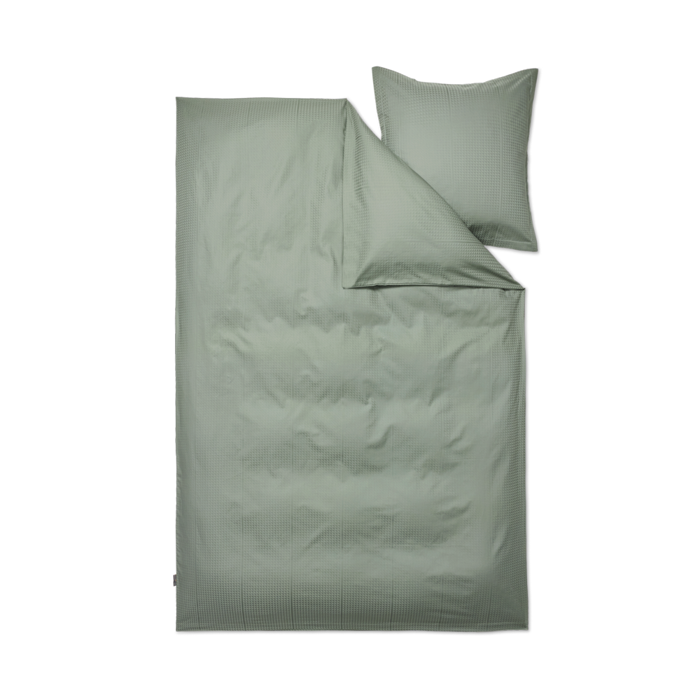 Georg Jensen Damasks Facet sengetøj har et stringent design og er damaskvævet i 100 % kæmmet bomuld, som giver en blød og glat overflade. Med Facet designet benytter tekstilkunstner Jette Nevers den klassiske damaskvævning til at skabe et elegant skyggespil, der smukt fremhæves i den mørkegrønne farve Mineral Green.