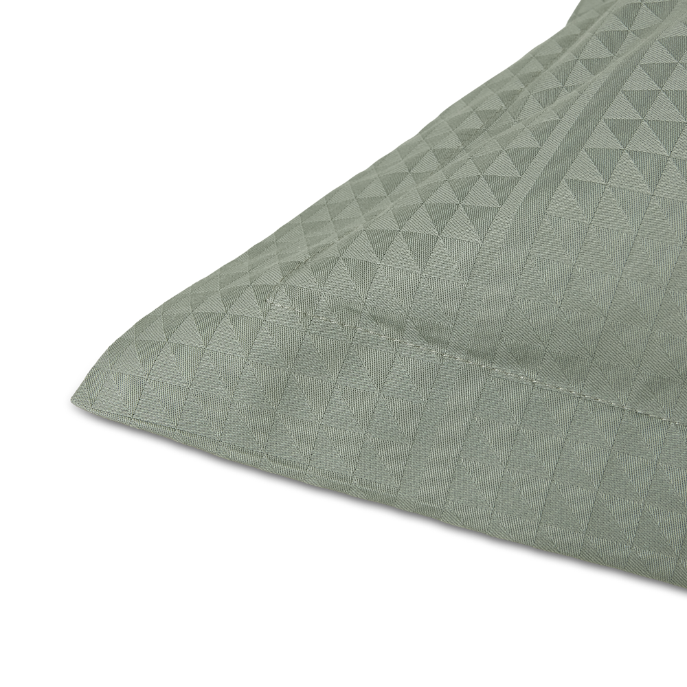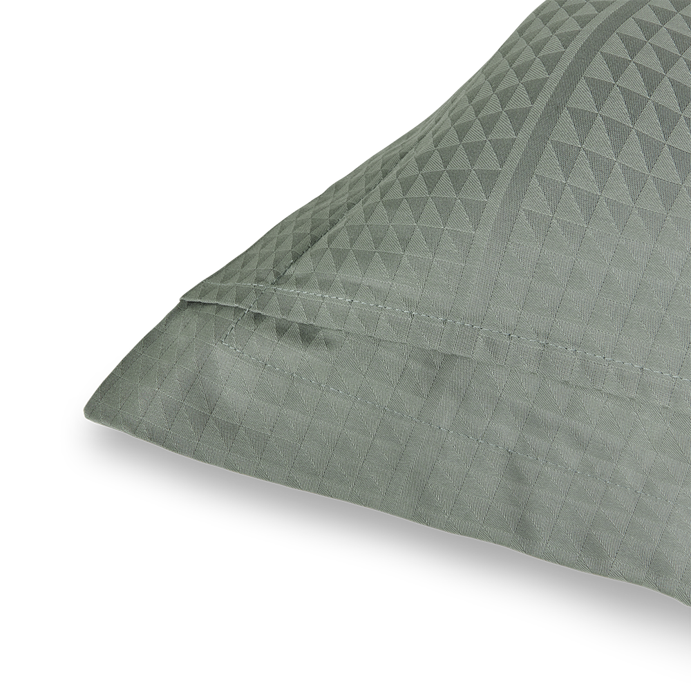 Georg Jensen Damasks Facet sengetøj har et stringent design og er damaskvævet i 100 % kæmmet bomuld, som giver en blød og glat overflade. Med Facet designet benytter tekstilkunstner Jette Nevers den klassiske damaskvævning til at skabe et elegant skyggespil, der smukt fremhæves i den mørkegrønne farve Mineral Green.