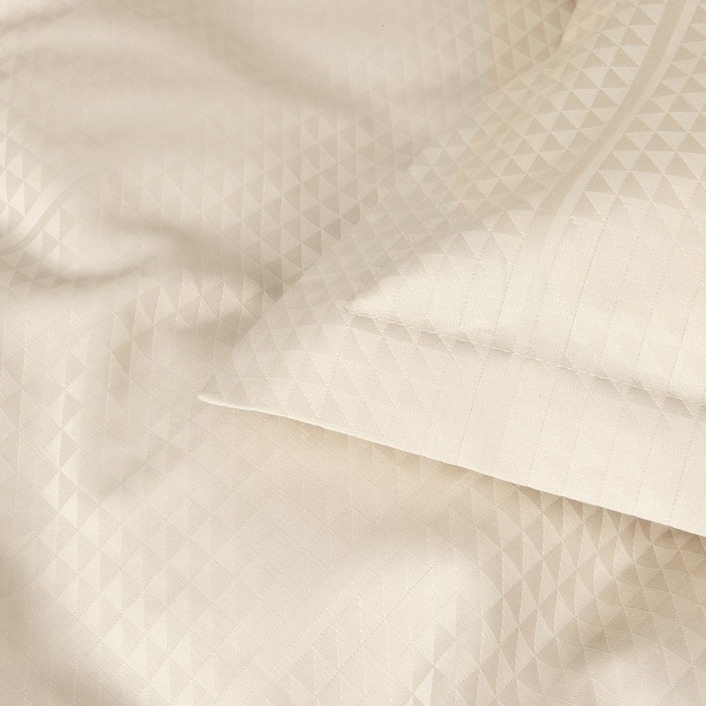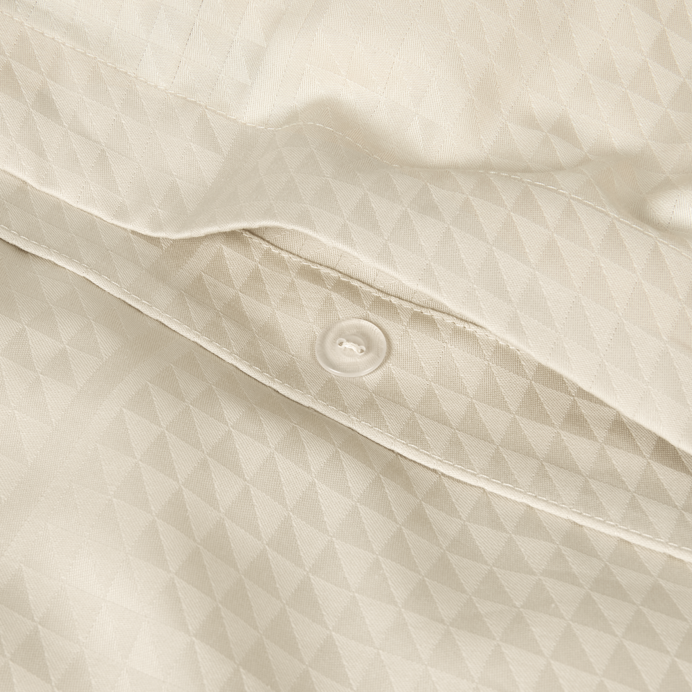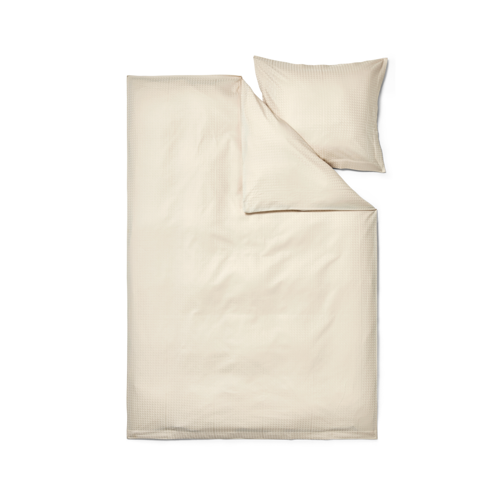 Georg Jensen Damasks Facet sengetøjet til familiens yngste har et stringent design og er damaskvævet i 100 % kæmmet bomuld, som giver en blød og glat overflade. Med Facet designet benytter tekstilkunstner Jette Nevers den klassiske damaskvævning til at skabe et elegant skyggespil, der smukt fremhæves i den lyse beige farve Archive.
