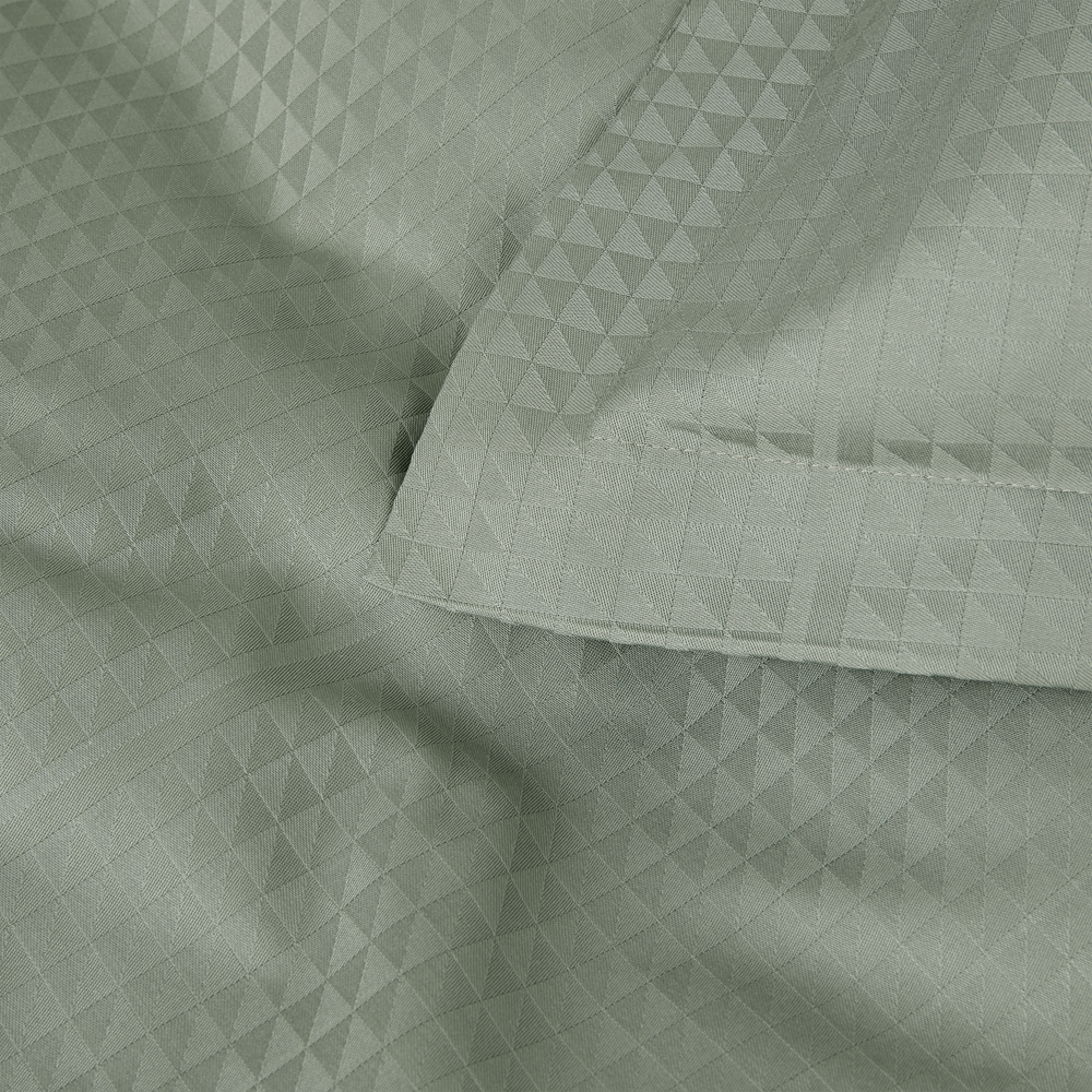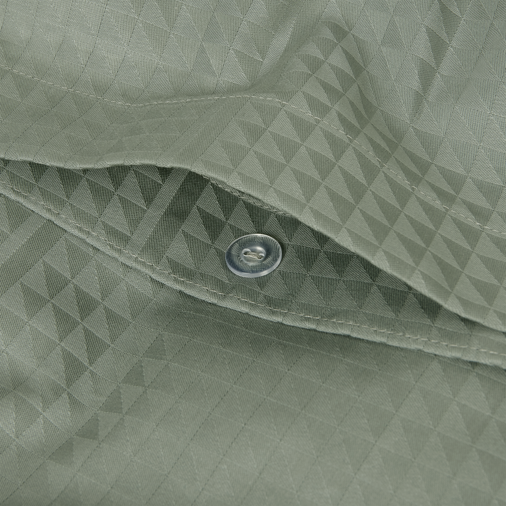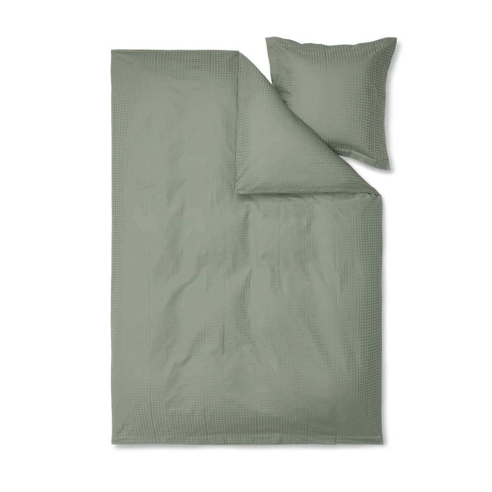 Georg Jensen Damasks Facet sengetøjet til familiens yngste har et stringent design og er damaskvævet i 100 % kæmmet bomuld, som giver en blød og glat overflade. Med Facet designet benytter tekstilkunstner Jette Nevers den klassiske damaskvævning til at skabe et elegant skyggespil, der smukt fremhæves i den mørkegrønne farve Mineral Green.
