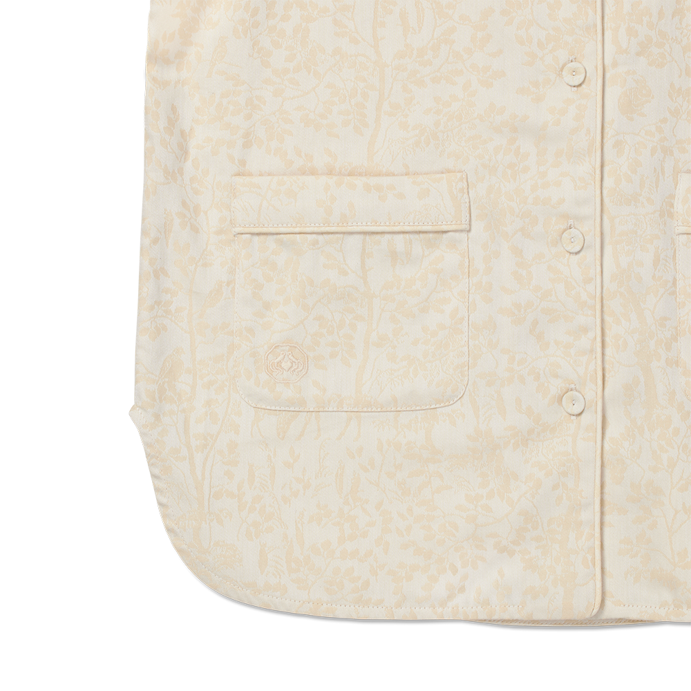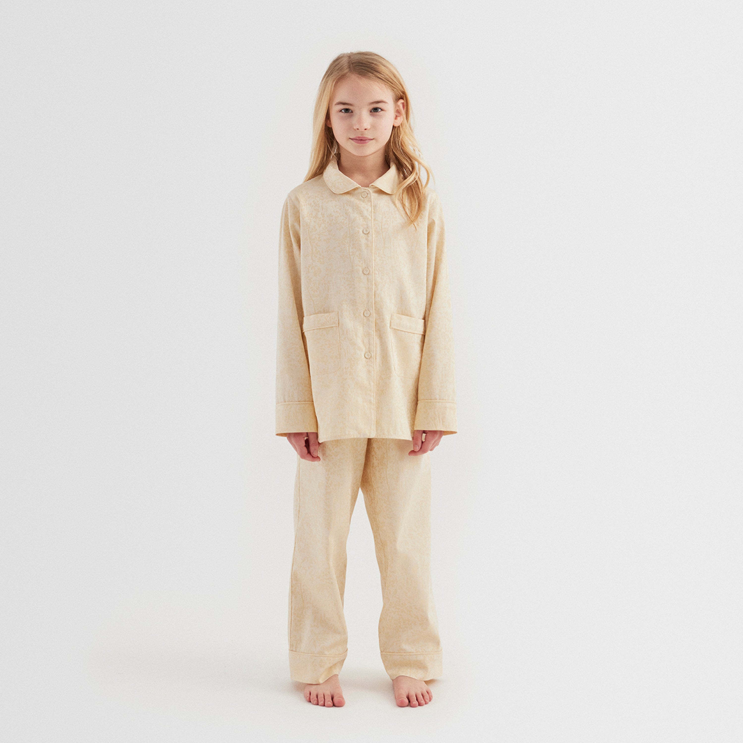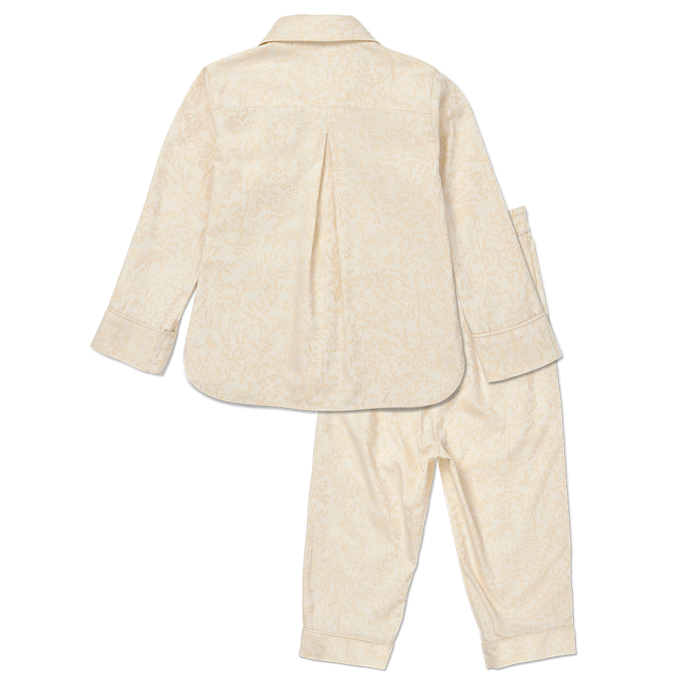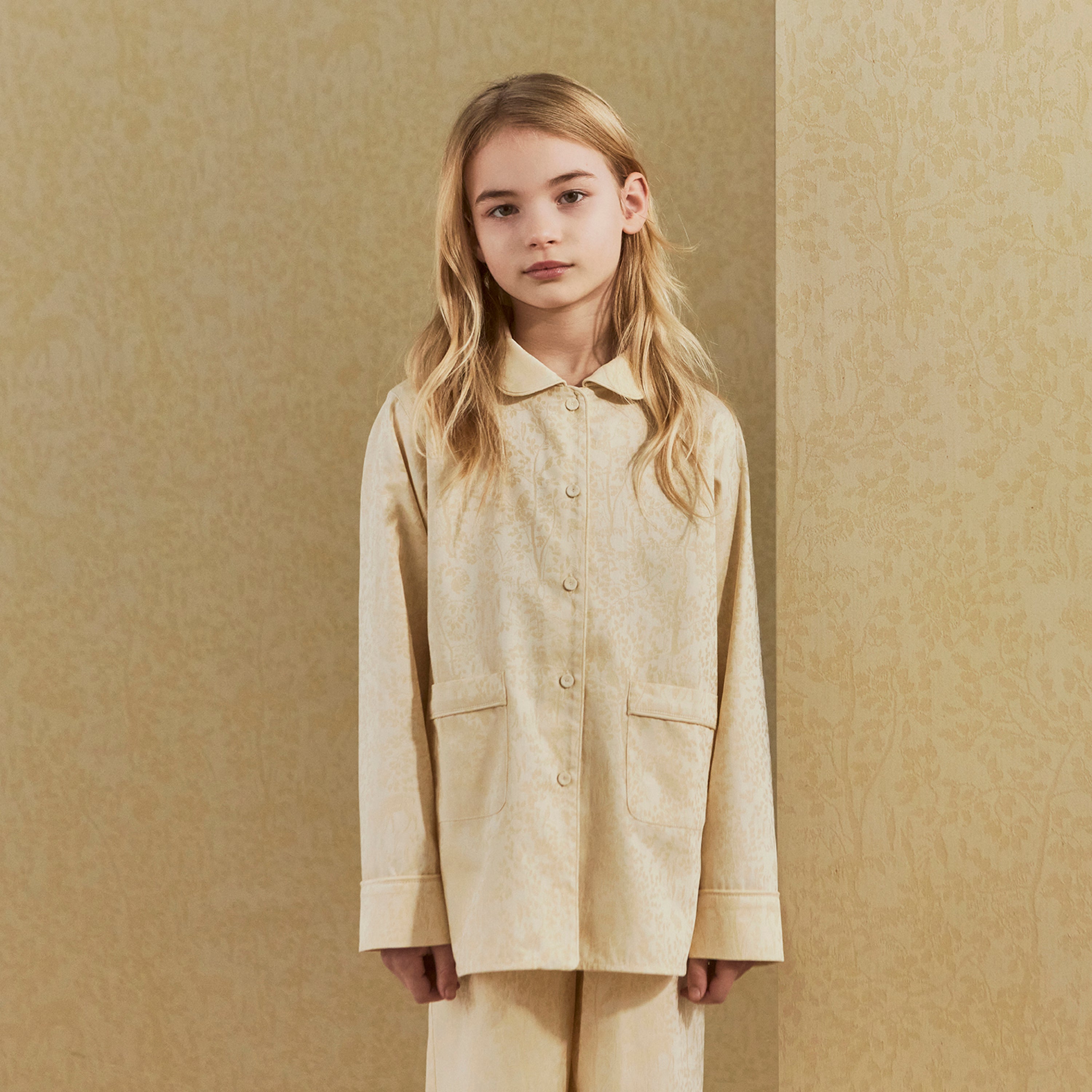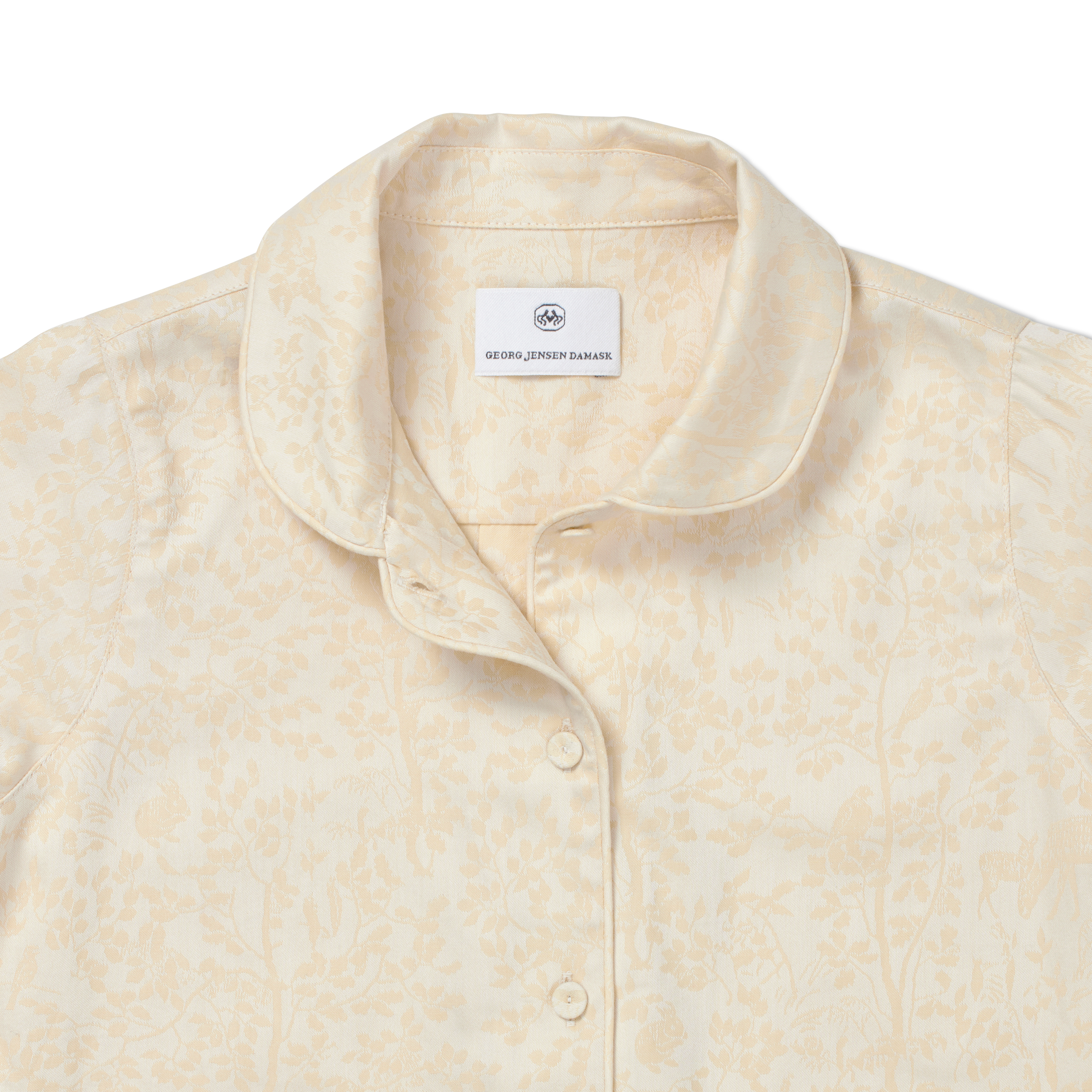 Forest er en jacquardvævet børnekollektion i økologisk bomuld. Den klassiske pyjamas i farven Misty Yellow har det lille karakteristiske Georg Jensen Damask-børnelogo broderet på brystet.