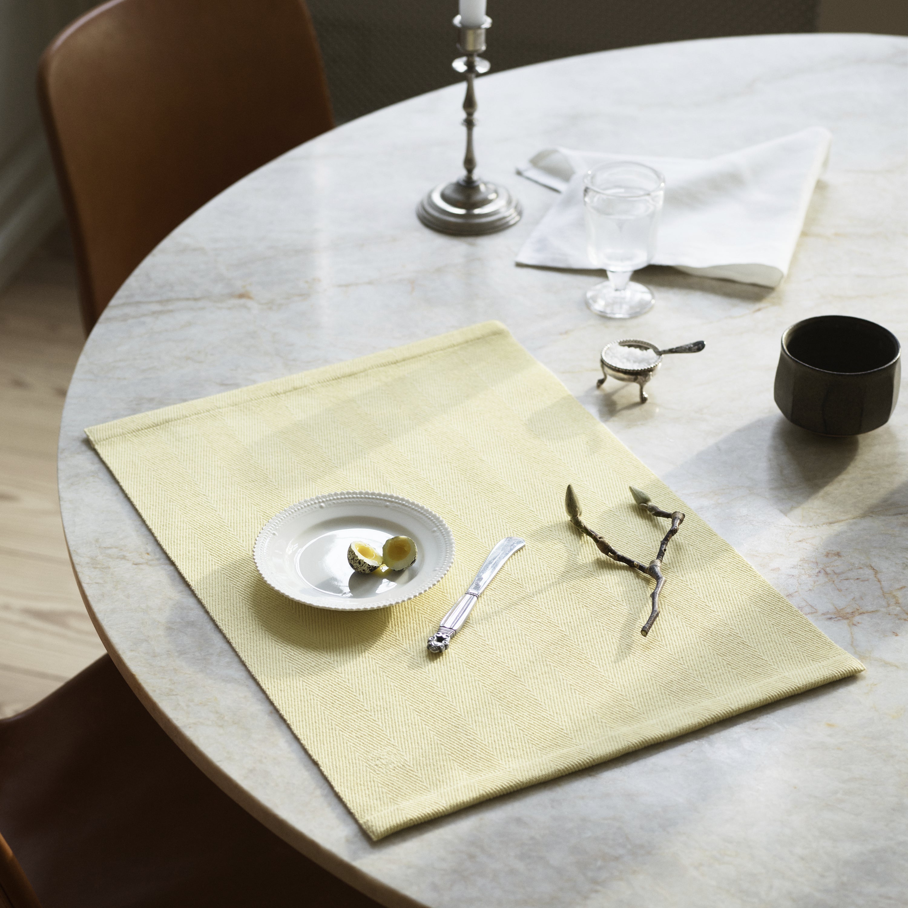 Herringbone er en kraftig sildebensvævet dækkeserviet i 100 % bomuld. Dækkeservietten ligger godt på bordet og har et lille broderet Georg Jensen Damask-logo. Med den gule farve Soft Yellow er du sikret evig sol i dit køkken.