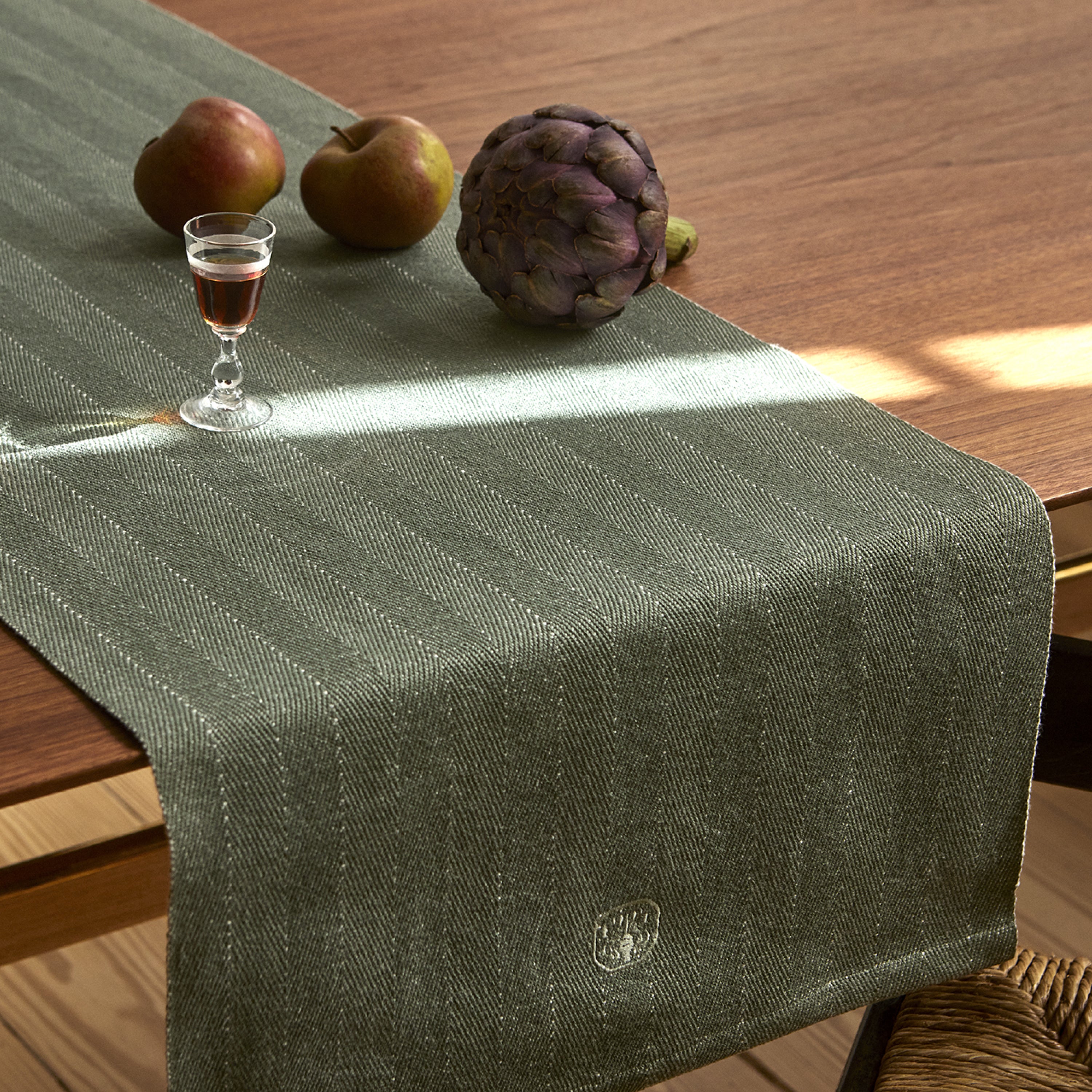 Herringbone er en sildebensvævet bordløber i 100 % kraftig bomuld. God til både hverdag og weekend. Bordløberen har et lille broderet Georg Jensen Damask-logo og fås blandt andet i farven Mineral Green, der er en dyb og stemningsfuld grøn nuance.