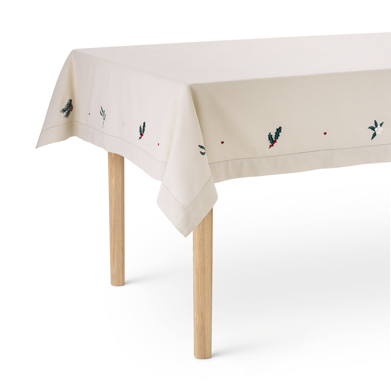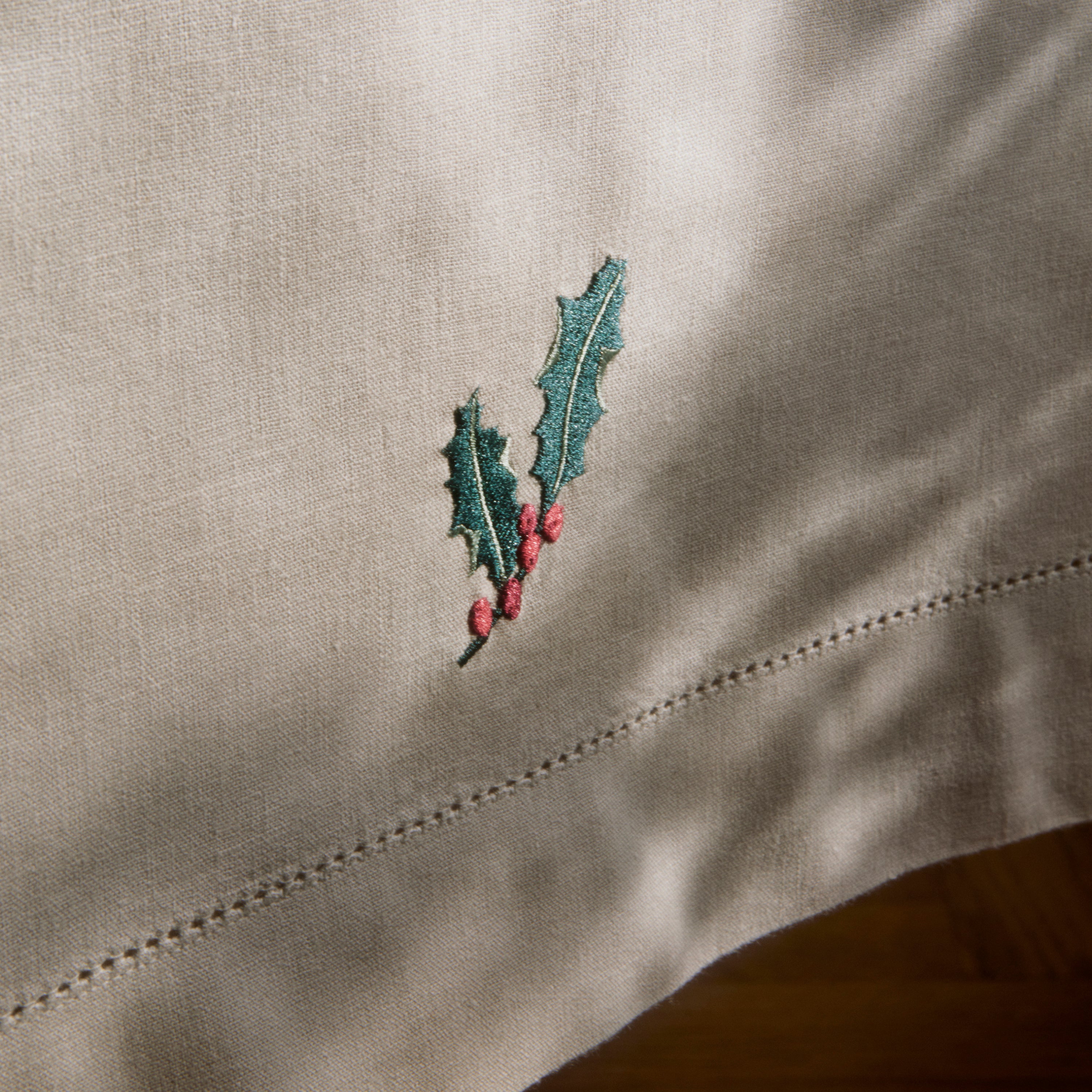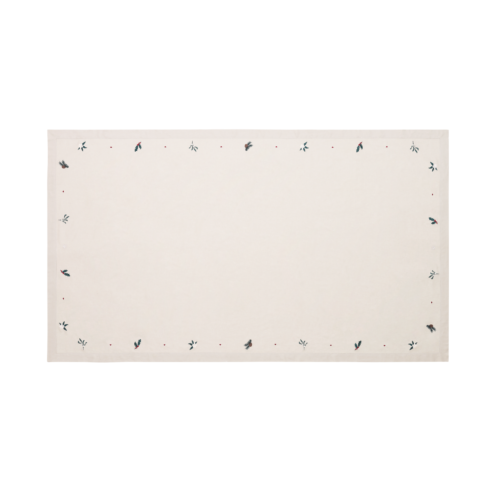 Den stemningsfyldte naturfarvede December dug har broderede motiver af hjerter, juleroser, kristtorn, mistelten og grangrene med kogler, der indrammes af en elegant bort med hulsøm.