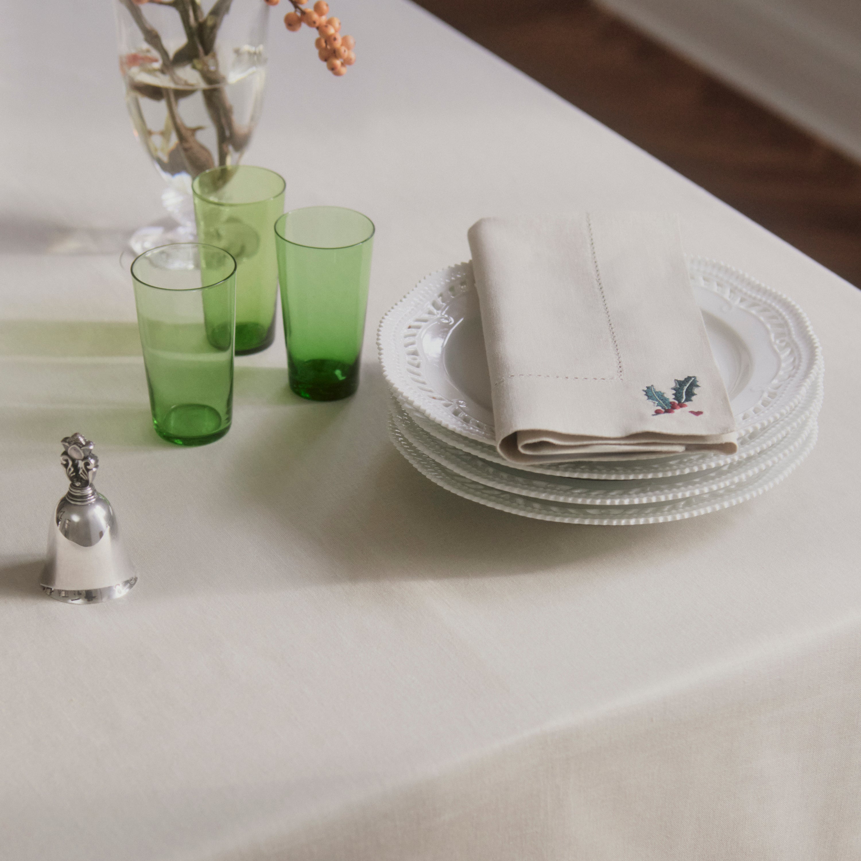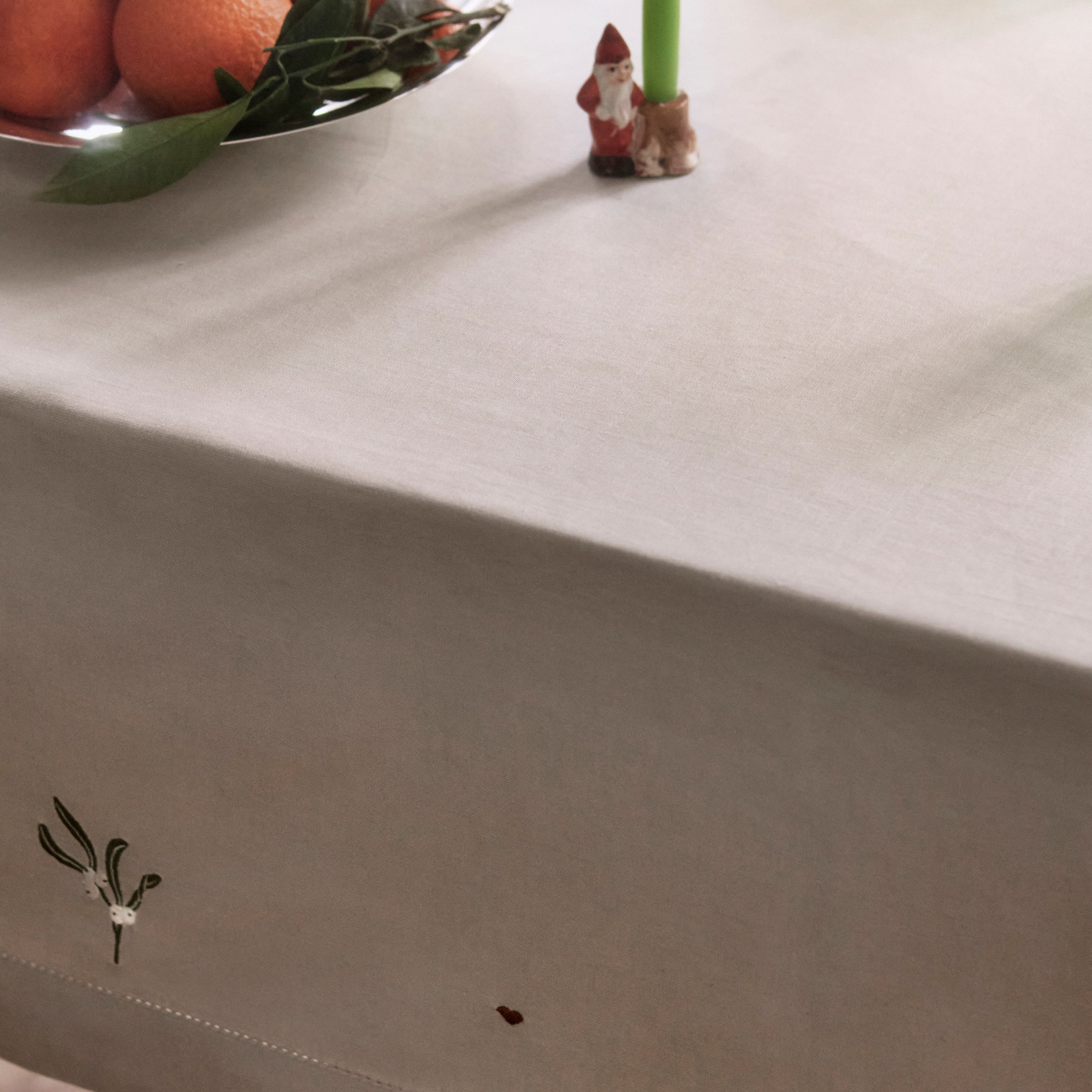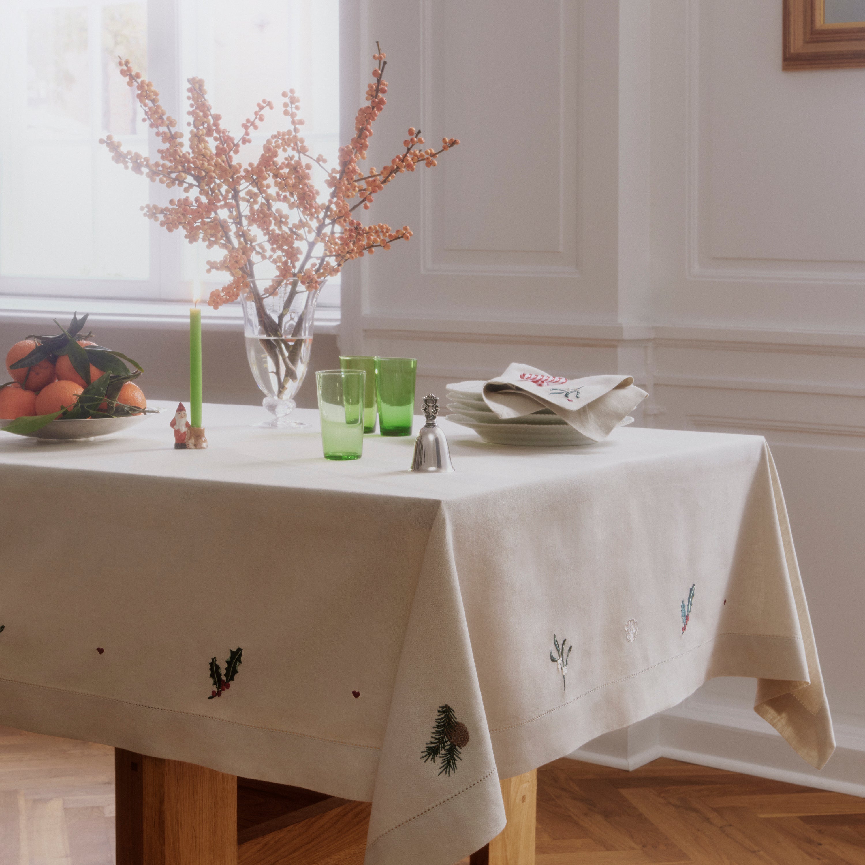 Den stemningsfyldte naturfarvede December dug har broderede motiver af hjerter, juleroser, kristtorn, mistelten og grangrene med kogler, der indrammes af en elegant bort med hulsøm.