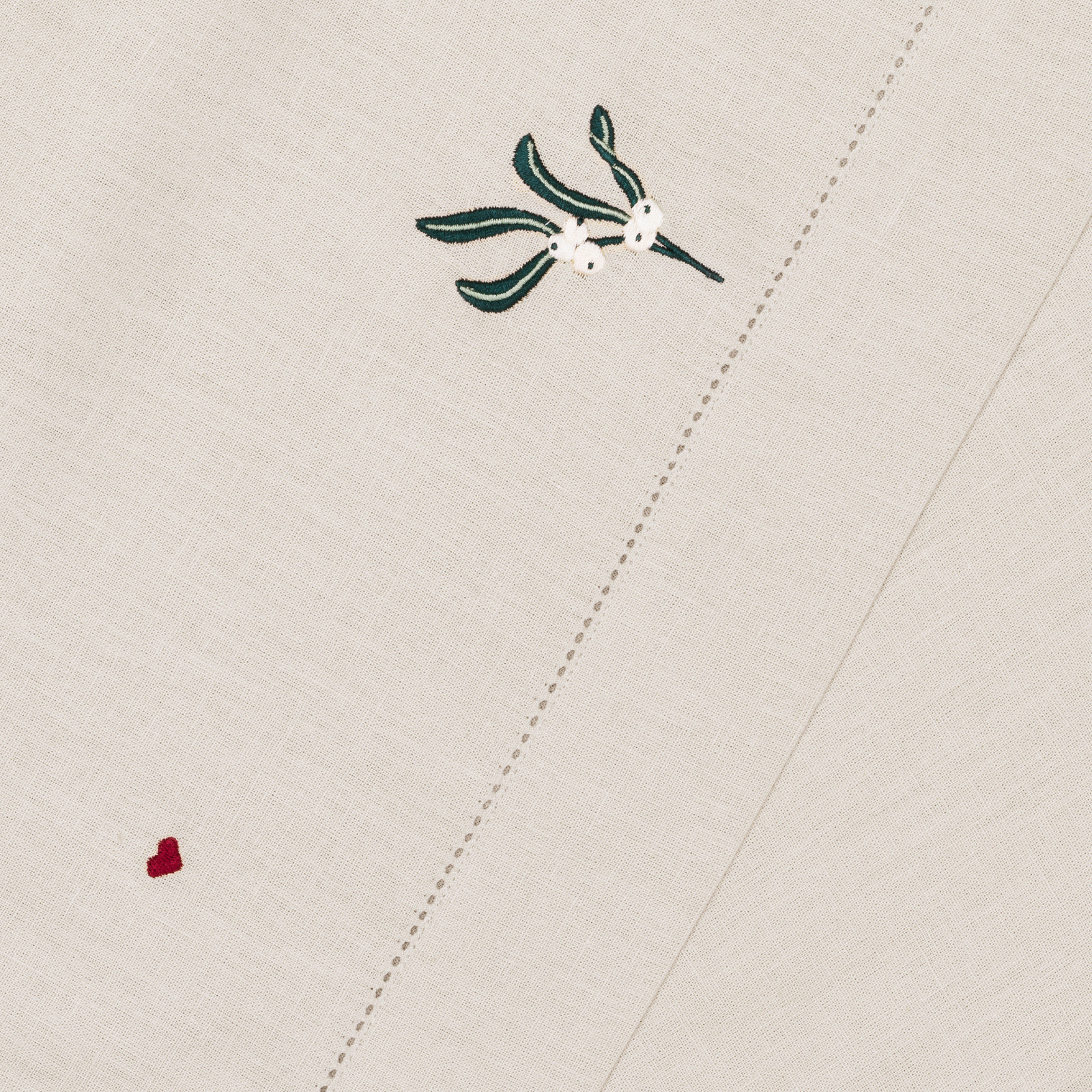 Den stemningsfyldte naturfarvede December dug har broderede motiver af hjerter, juleroser, kristtorn, mistelten og grangrene med kogler, der indrammes af en elegant bort med hulsøm.