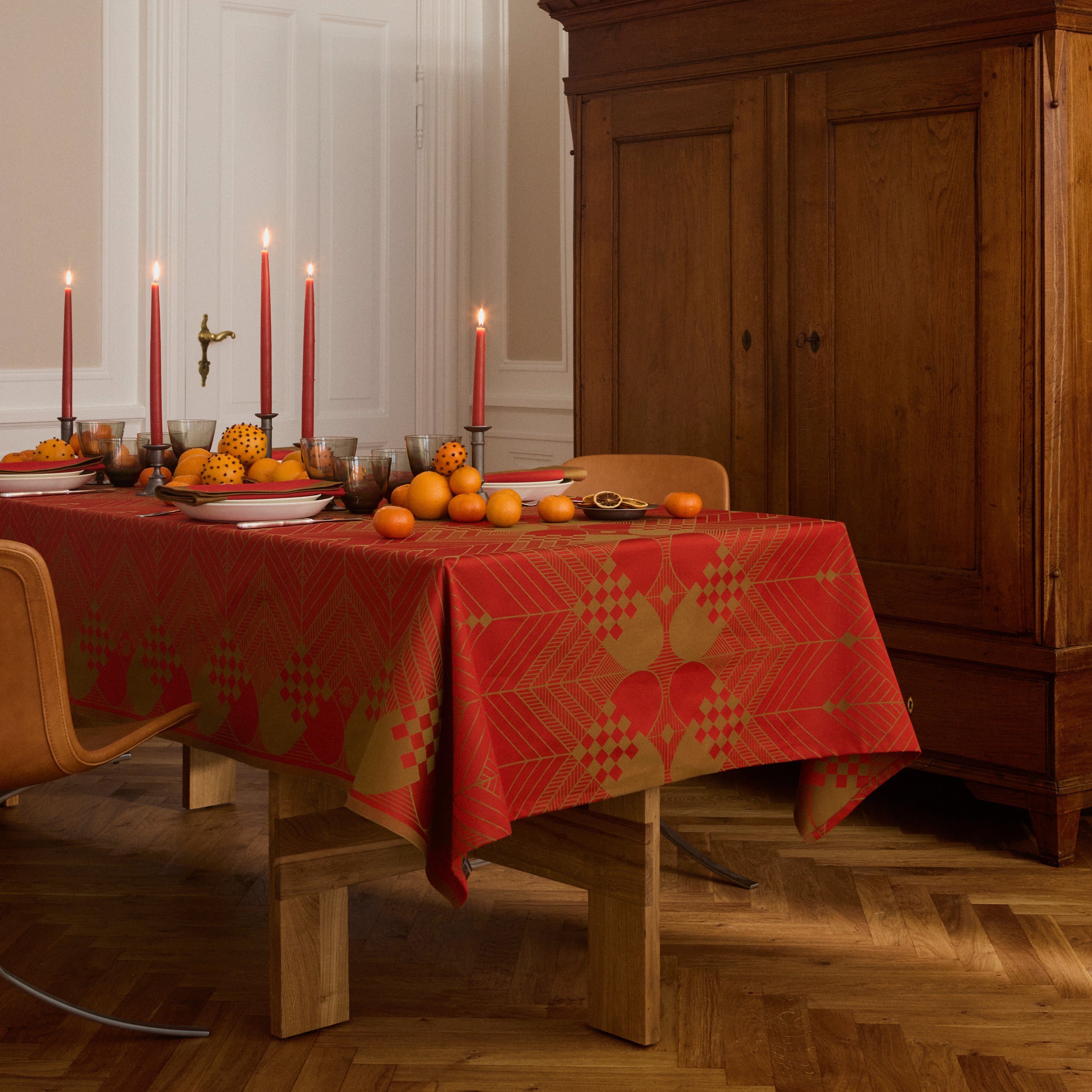 Den helt klassiske farvekombination i julerød og guld har en særlig plads i hjertet hos mange og har været i vores kollektion lige siden lanceringen i 1975. I al sin smukke enkelhed værner Juledugen i den oprindelige farvekombination om traditionerne. Matchende stofservietter fuldender udtrykket.