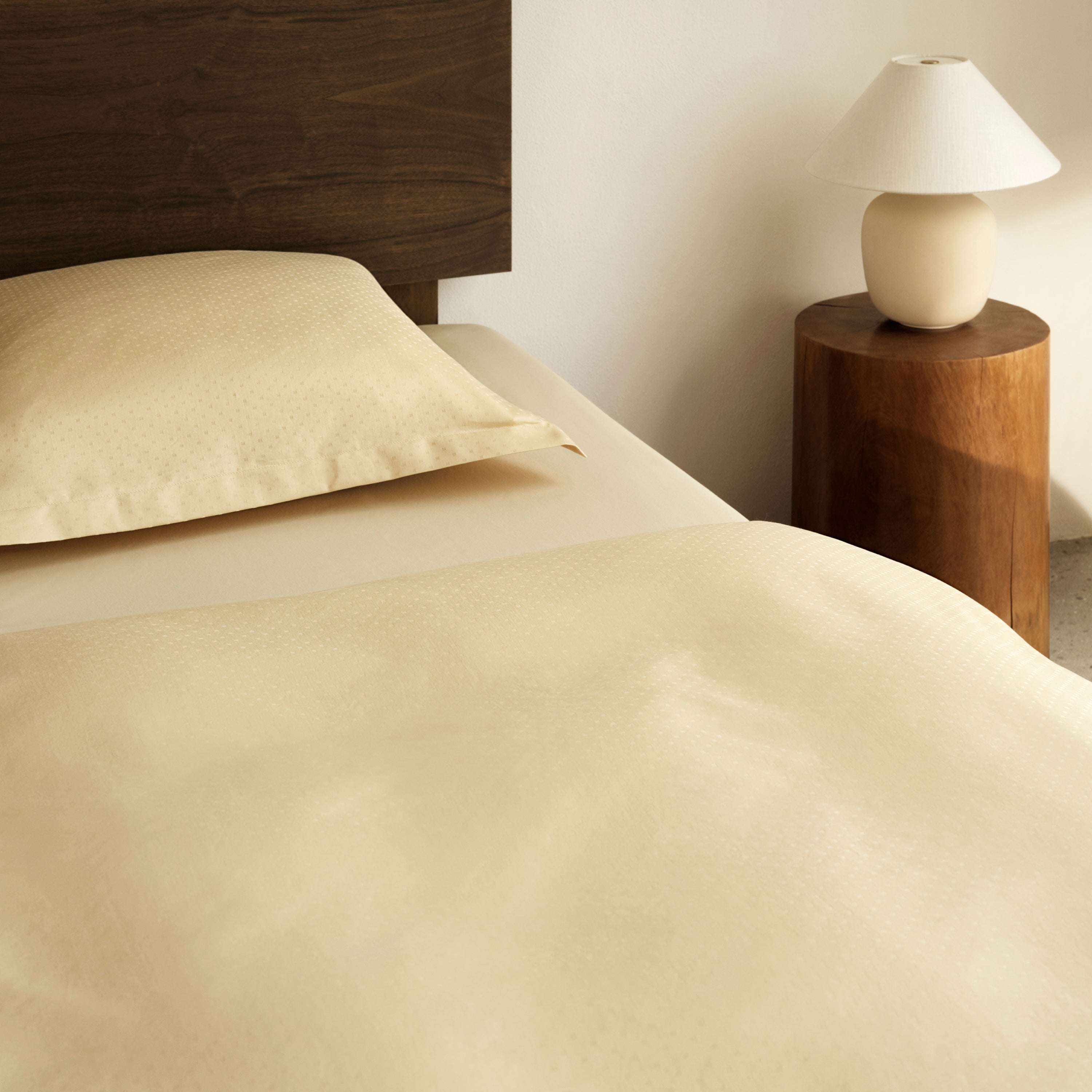 Nordlys sengetøjet har et elegant design, hvor nordlysets organiske former er oversat til et tidløst, geometrisk mønster. Wheat er en blid, lysegul nuance, der er inspireret af hvedens korngule farve.