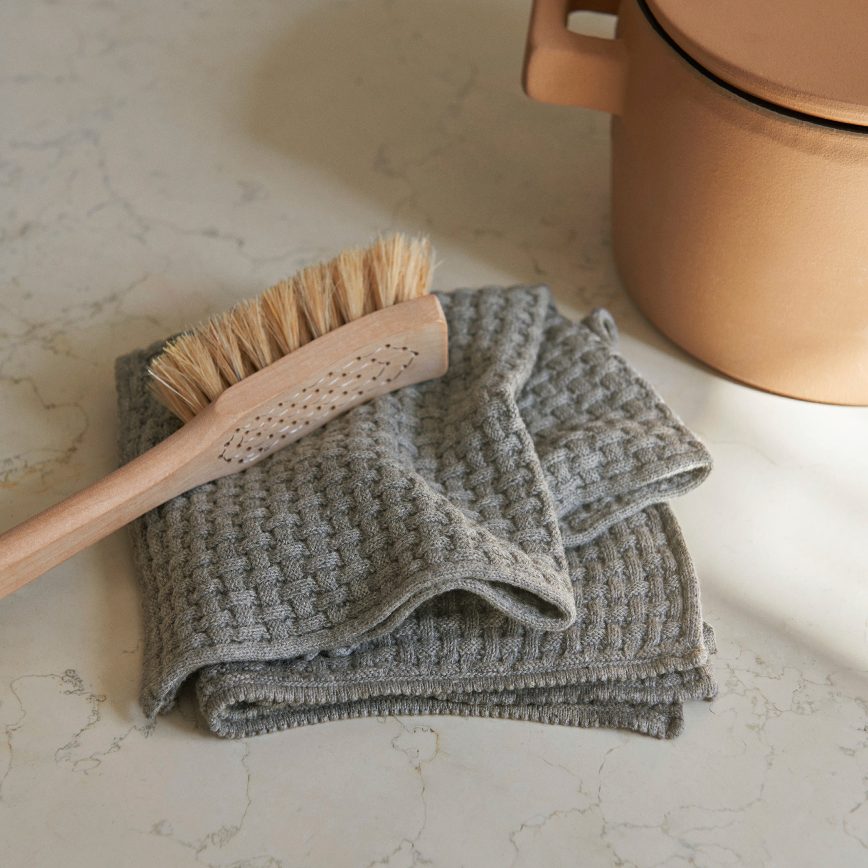 Blød og lækker karklud i den ypperste bomuldskvalitet og en klassisk grå farve. For at opnå en enestående tørreevne er karkluden strikket med et særligt vaflet mønster, der skaber små lommer til vandet.