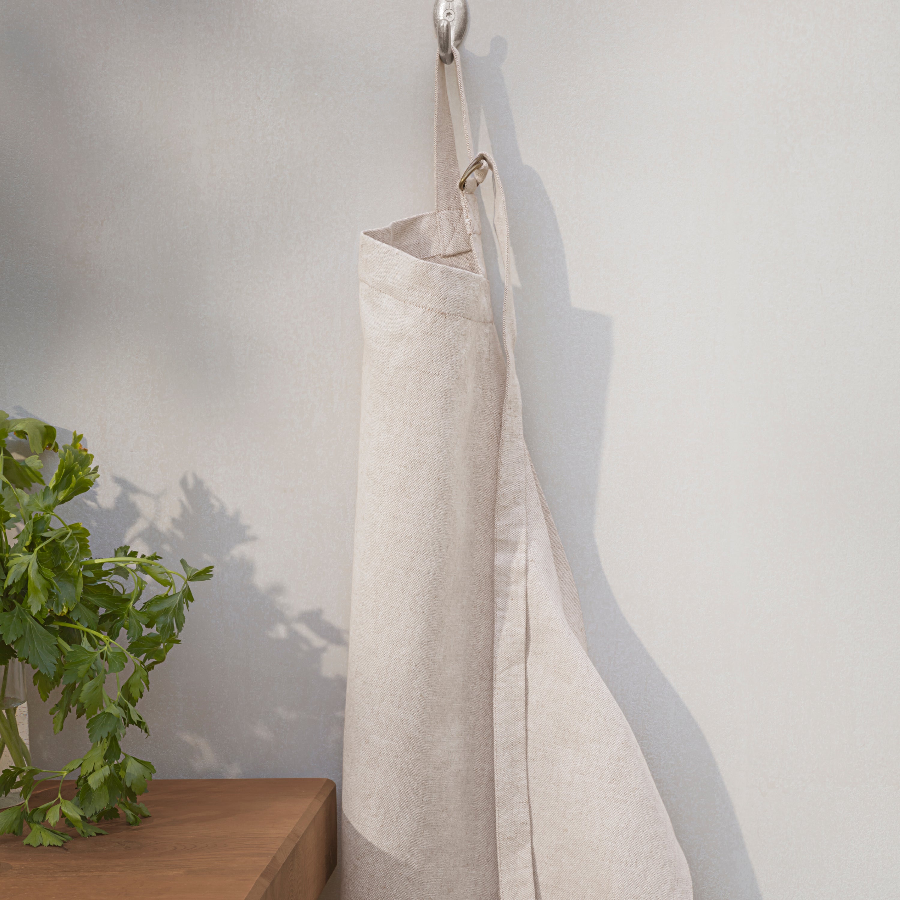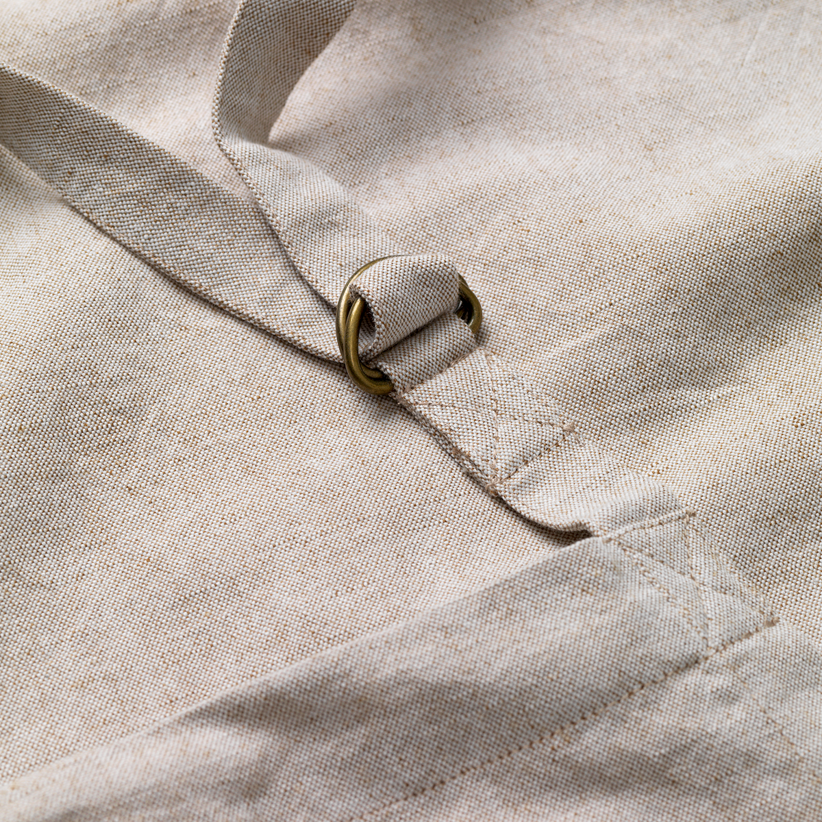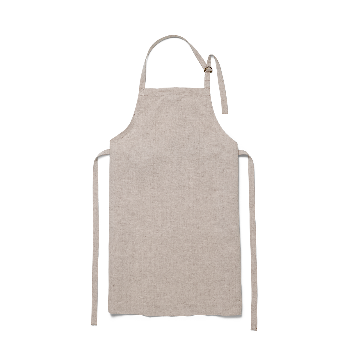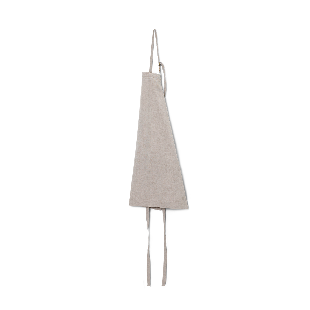 Forklædet lukkes med et justerbart bånd omkring nakken og med bindebånd i taljen. Den lysebrune melangevævning giver forklædet et varmt og enkelt udtryk.