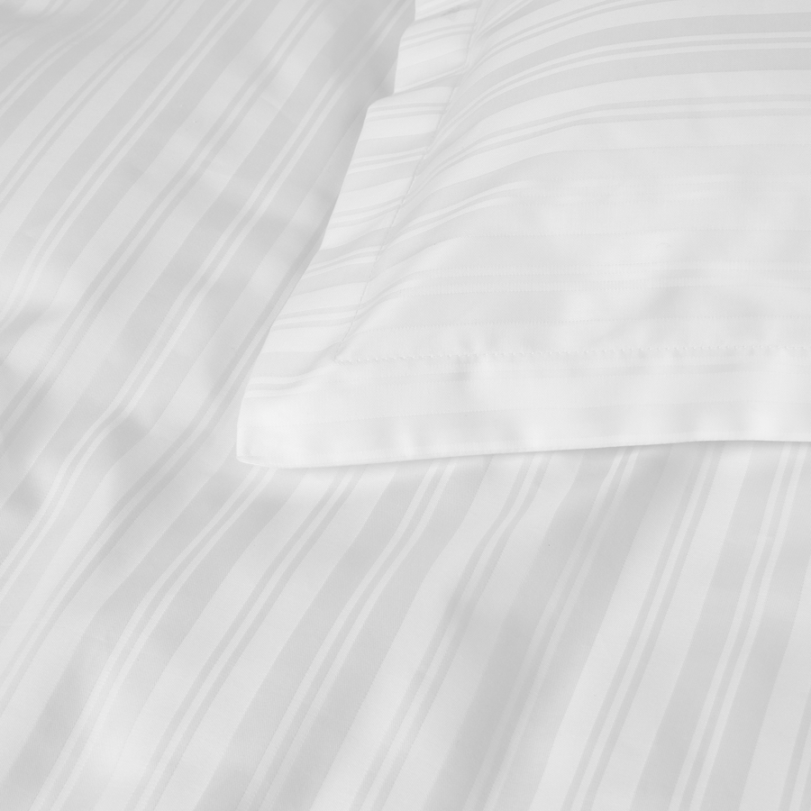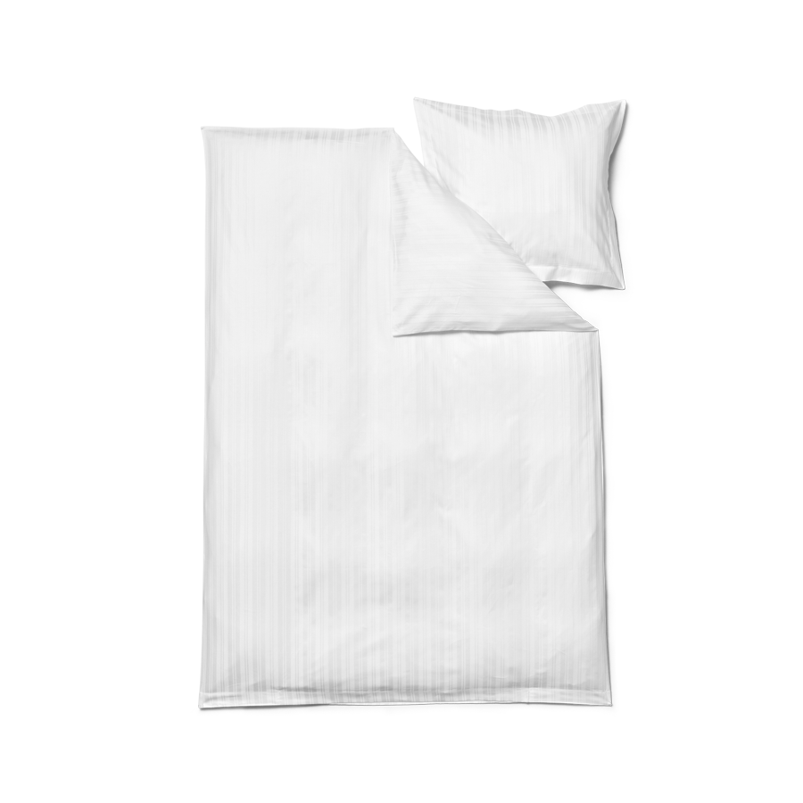 I hvid er sengetøjet vævet i monokrome hvid på hvid-striber, som med deres forskellige breder skaber liv i designet.