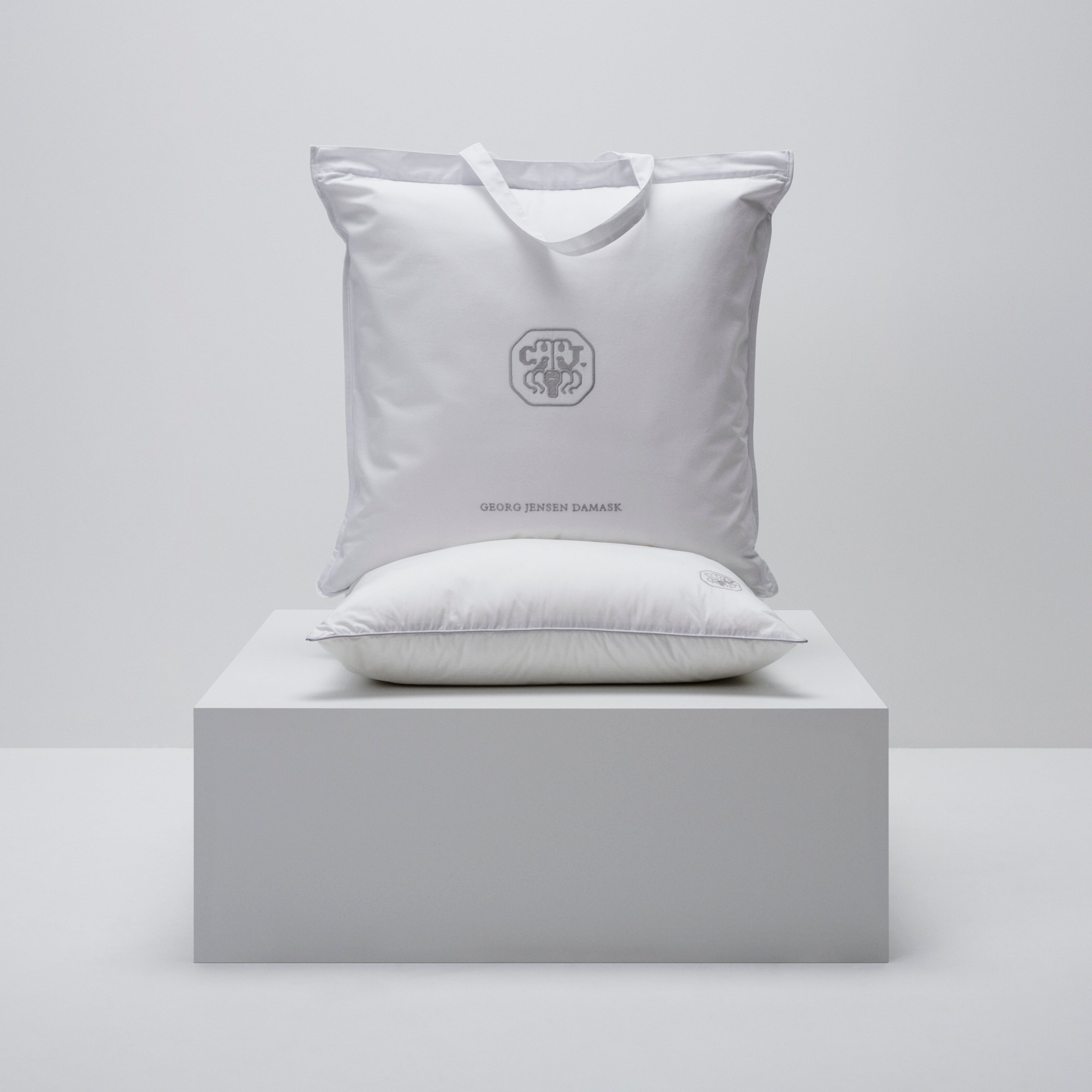 Puden bærer Georg Jensen Damasks ikoniske logo som et diskret broderi – et symbol på kvalitet og omhyggelighed.