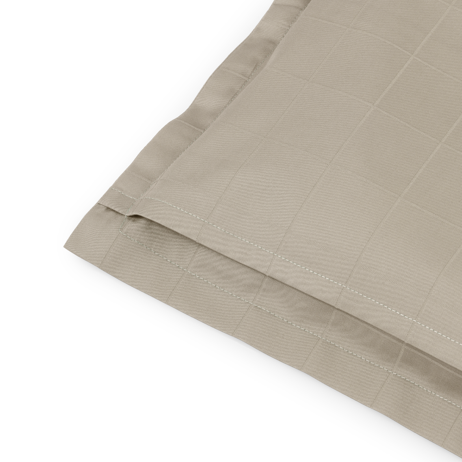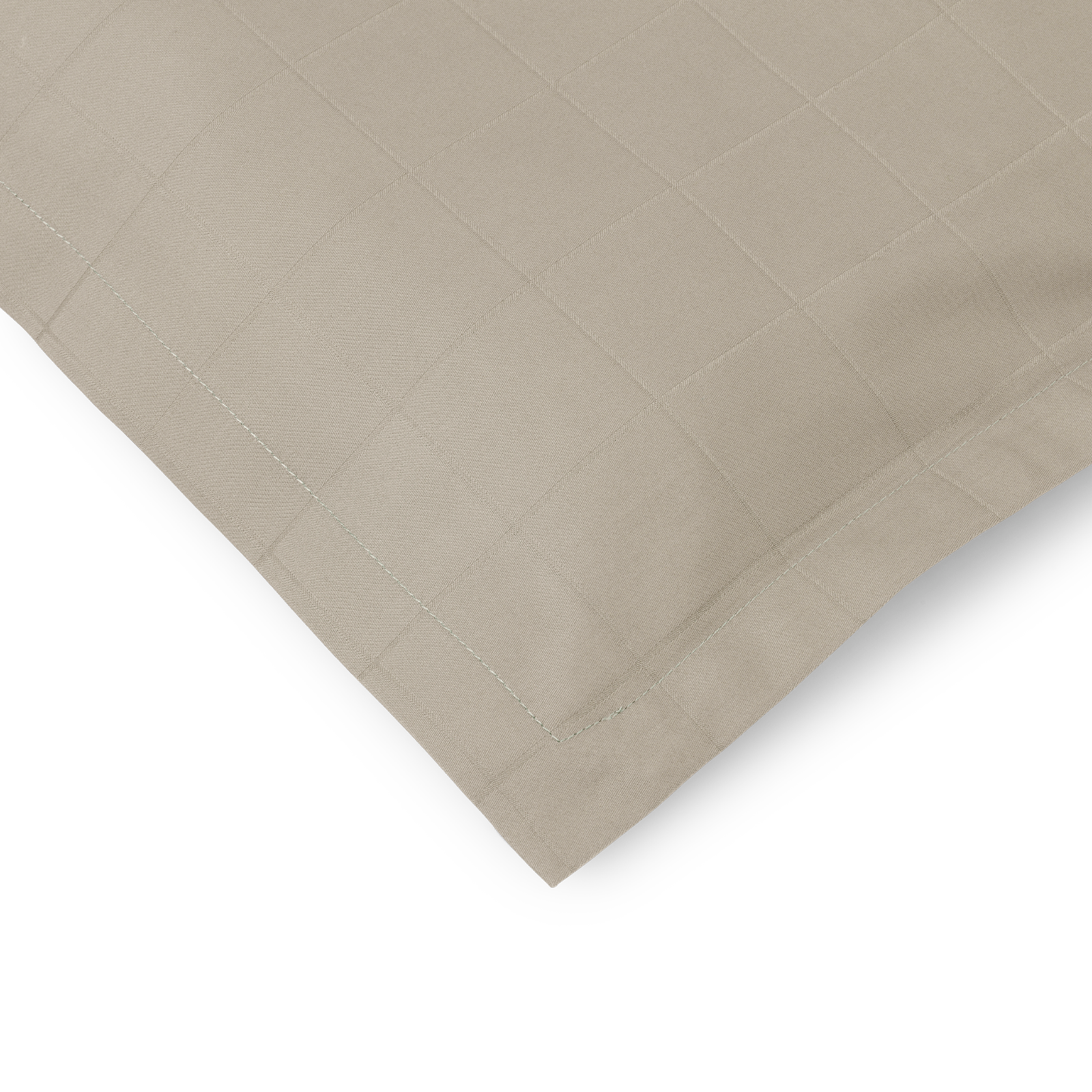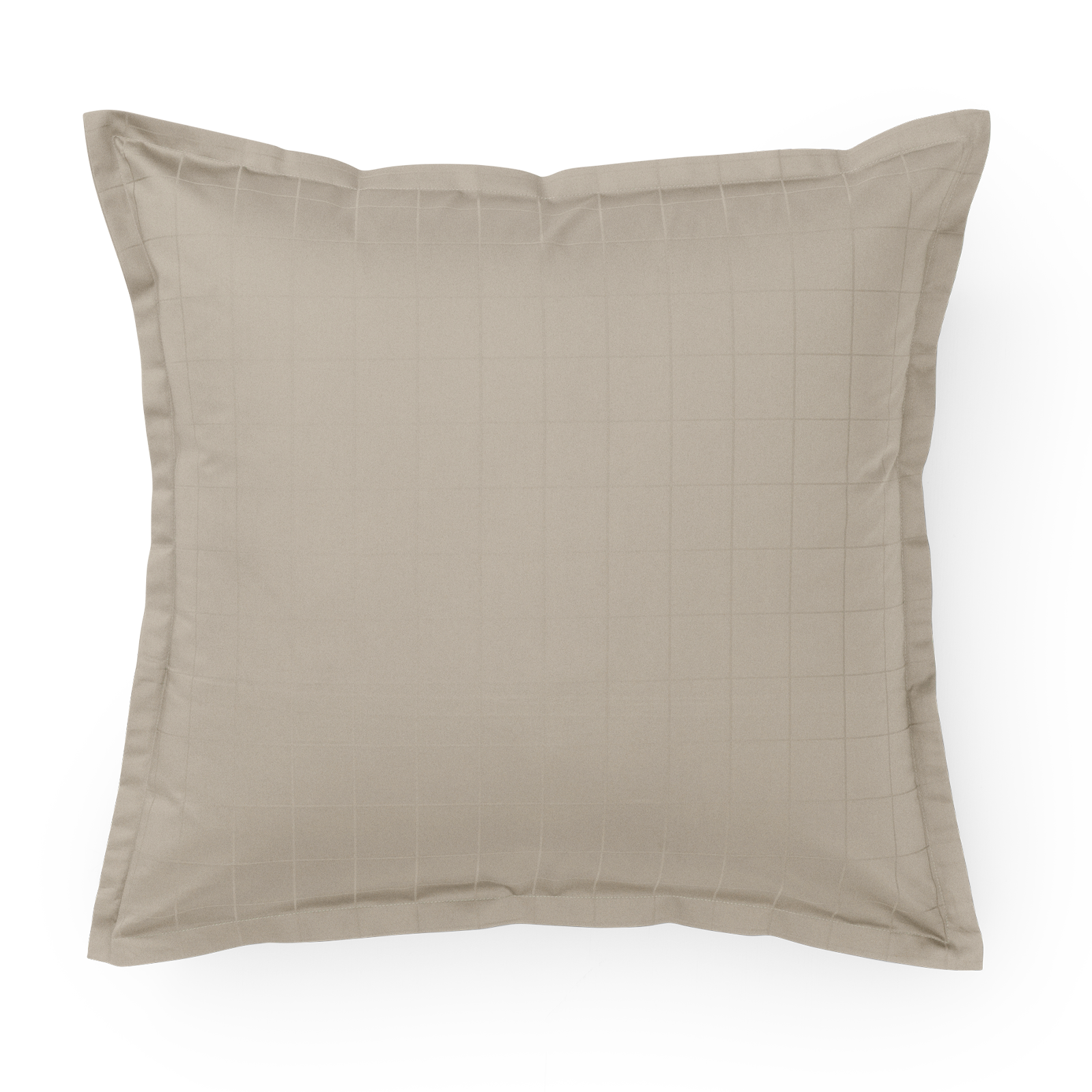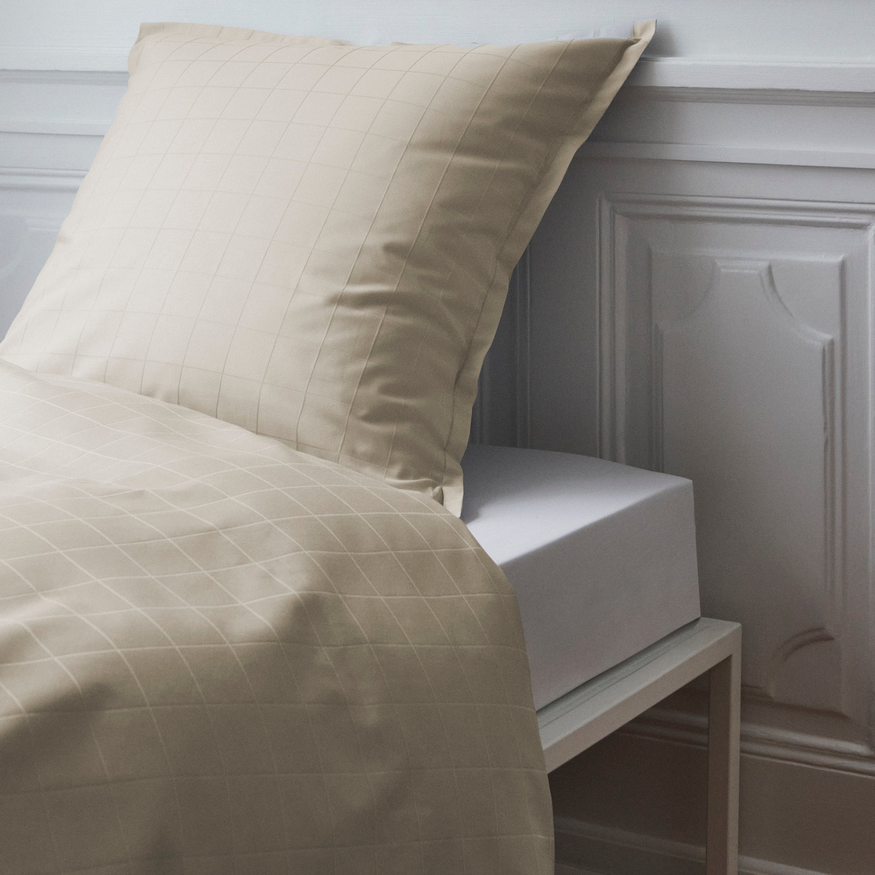 Light Squares hovedpudebetræk i farven Grey Sand. Light Squares har et let grafisk mønster, der fremhæves i den fine satinvævning. Det er vævet i 100 % kæmmet bomuld, der giver en stærk og blød overflade. Grey Sand er en varm nuance af grå.