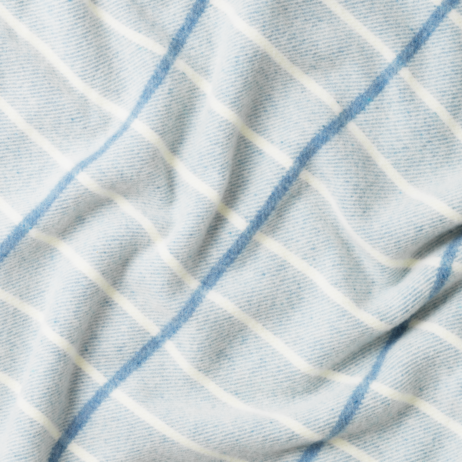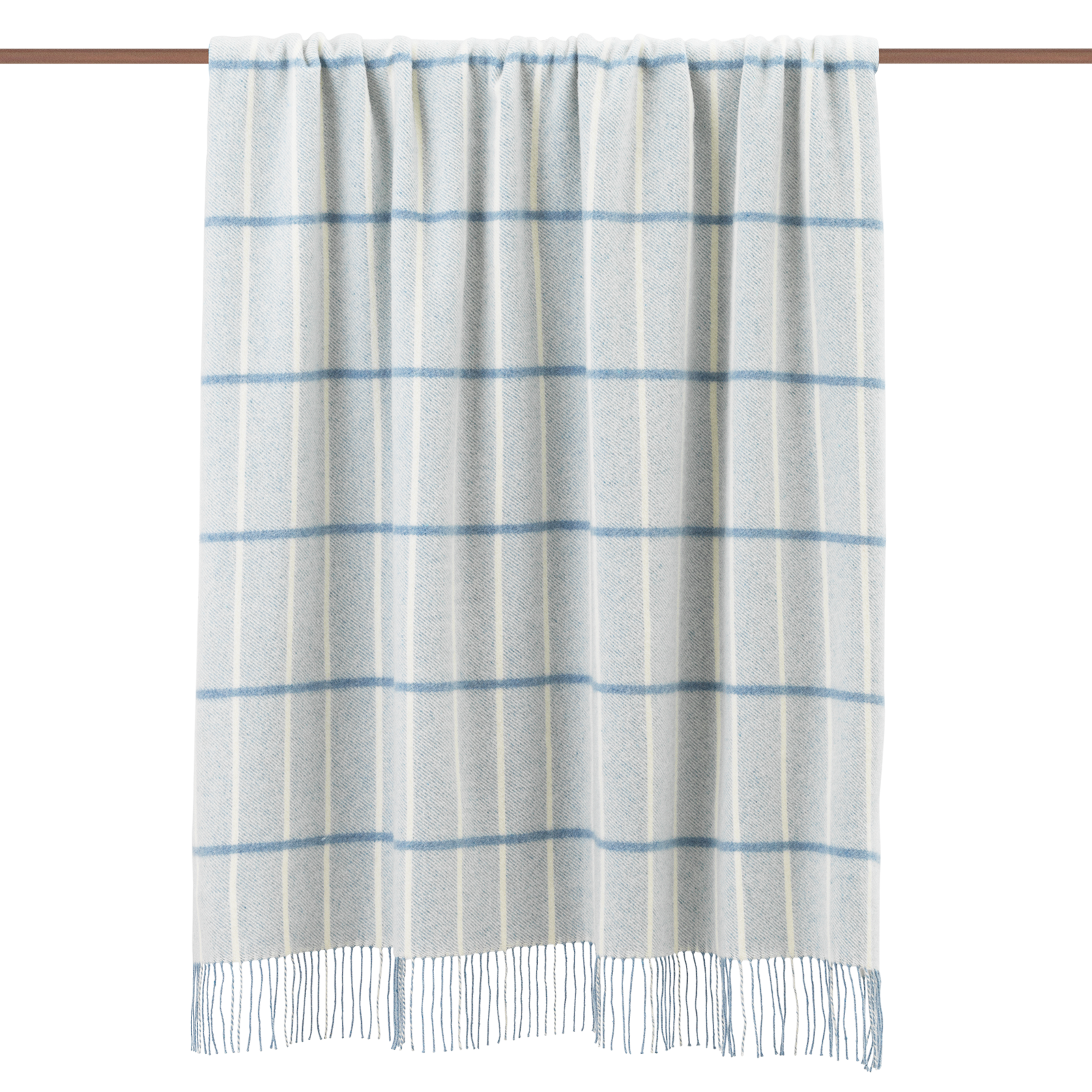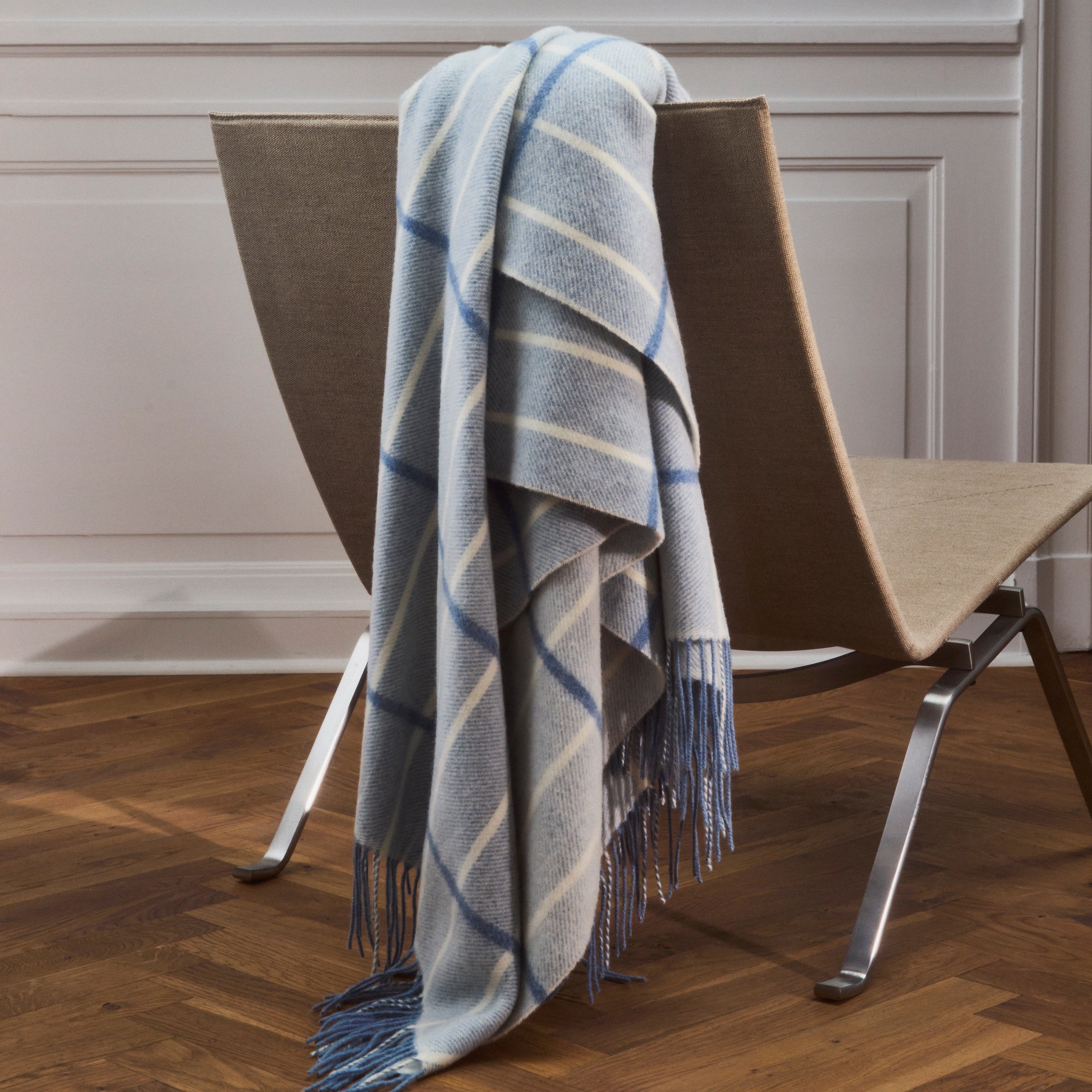 Tartan plaiden har et elegant og klassisk ternet mønster. Kombination af 90 % merinould og 10 % cashmere gør plaiden ekstra blød og uldens fine struktur tilføjer en særlig lethed. Den er vævet i blå og hvide farver og er afsluttet med frynser i top og bund.